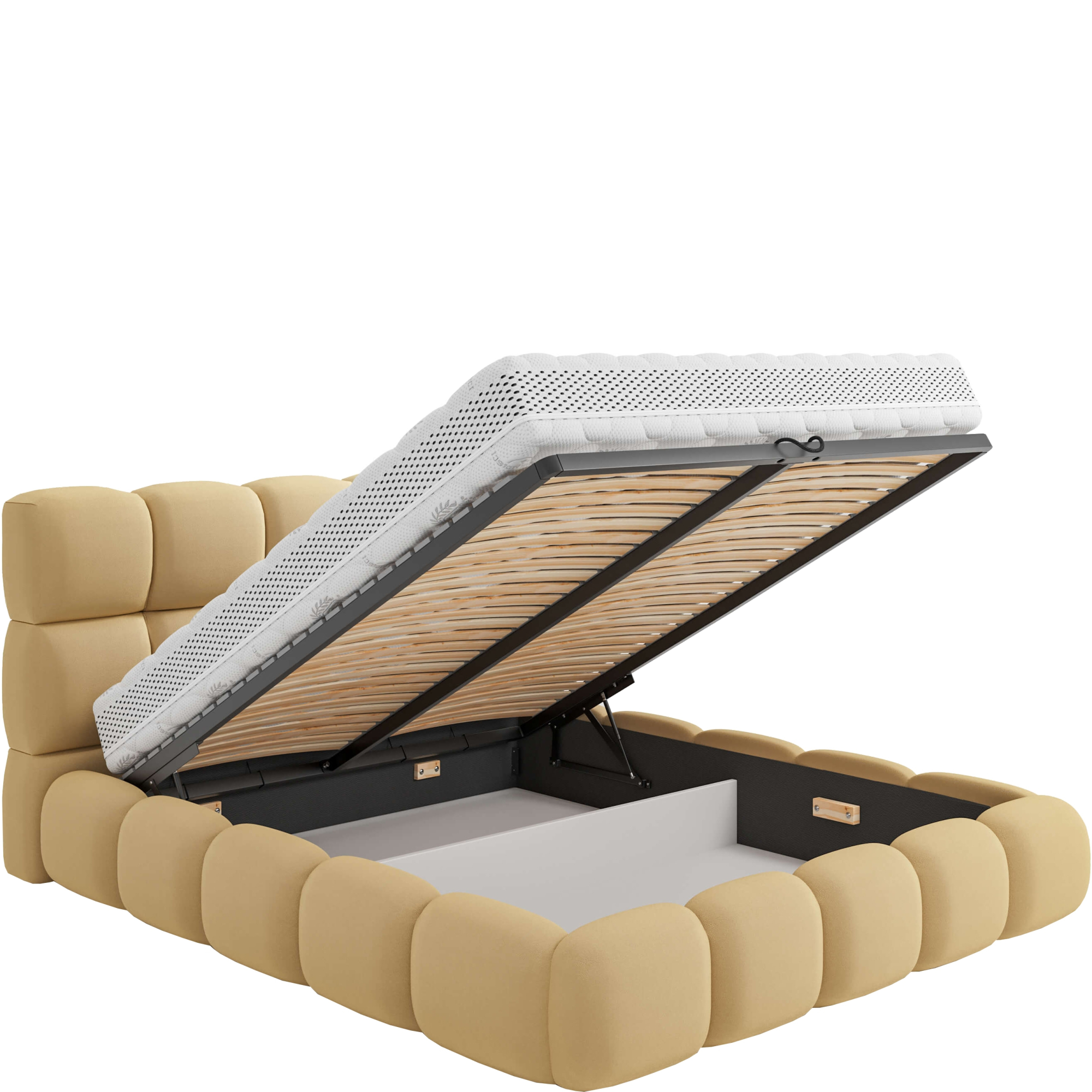 Łóżko Cherry oferuje możliwość wyboru między samodzielnym stelażem a wersją z dodatkowym pojemnikiem na pościel, co czyni je nie tylko stylowym, ale także niezwykle funkcjonalnym. Dzięki tej opcji każdy użytkownik może dostosować łóżko do swoich indywidualnych potrzeb i preferencji, zapewniając sobie maksymalny komfort i praktyczność.