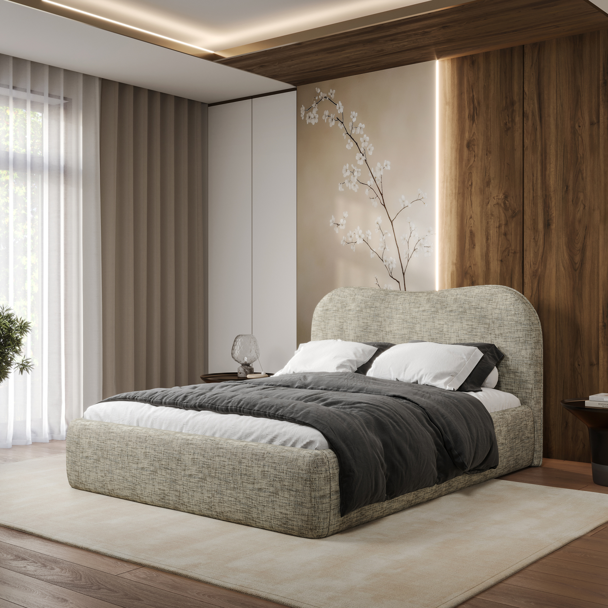 Łóżko tapicerowane Cherry wyróżnia się oryginalnością i funkcjonalnością. Nietypowa podstawa, z dodatkową tapicerowaną zabudową, tworzy unikalny efekt wizualny, który przyciąga uwagę. Zrezygnowanie z tradycyjnych nóżek to nie tylko ciekawy zabieg estetyczny, ale także praktyczne rozwiązanie. Dzięki temu, że podstawa jest równo z podłogą, utrzymanie czystości wokół łóżka staje się prostsze - kurz nie ma możliwości gromadzić się pod meblem.
