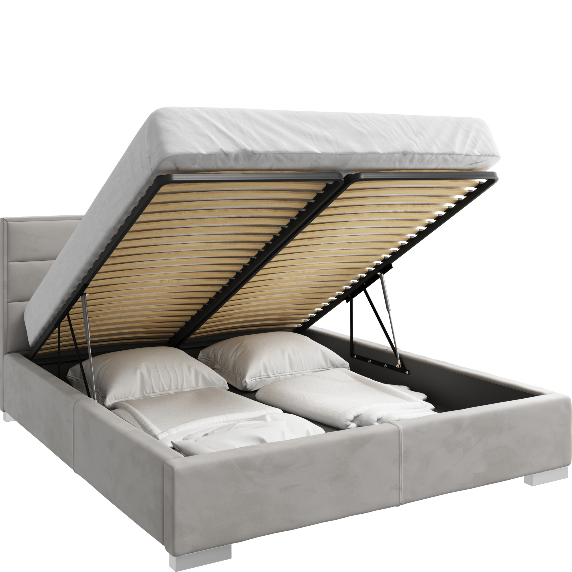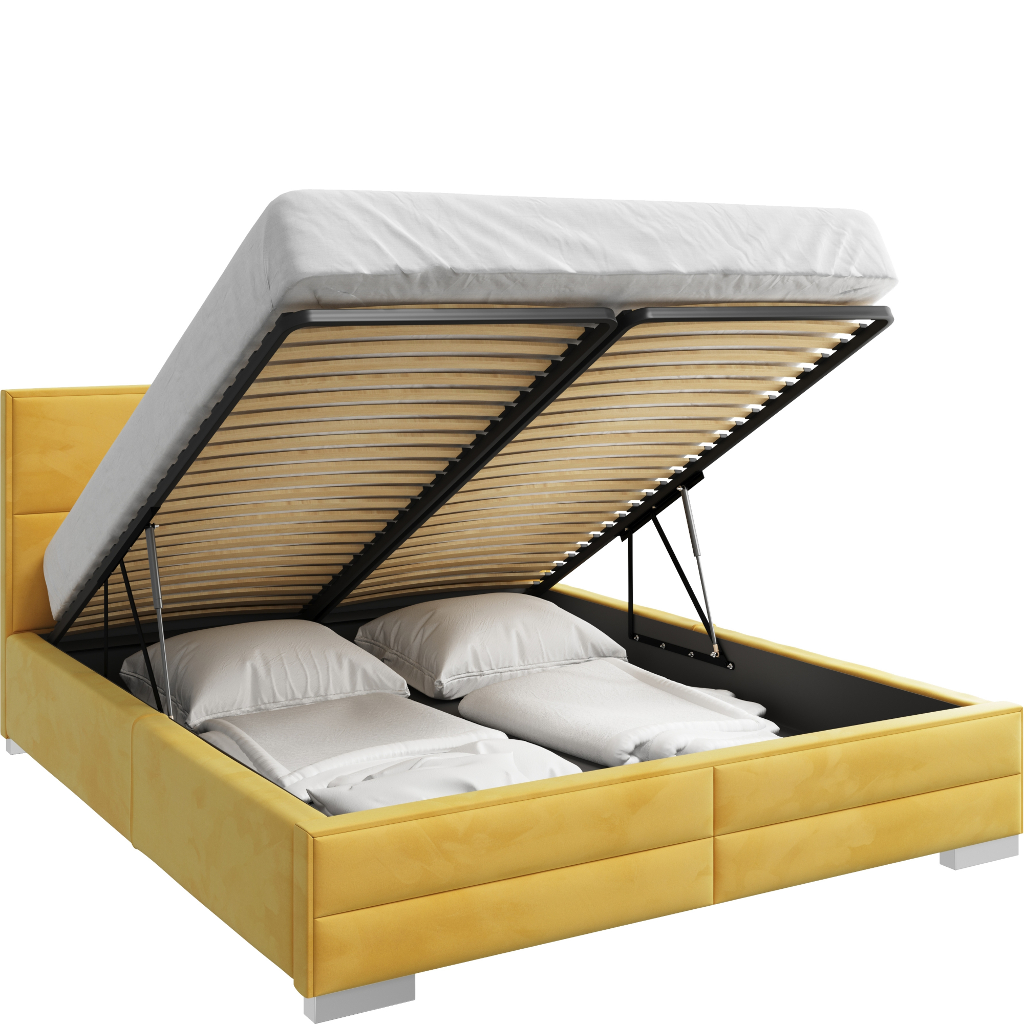 konfigurowalny Ta wyjątkowa propozycja do Twojej sypialni dostępna jest z pojemnikiem podstawowym - dolna część łóżka (tak jak na zdjęciu podstawowym) posiada grube boki wystające poza obrys materaca, wyposażone jest w stelaż na ramie metalowej z listwami sklejkowymi sprężynującymi oraz podnośnikami.