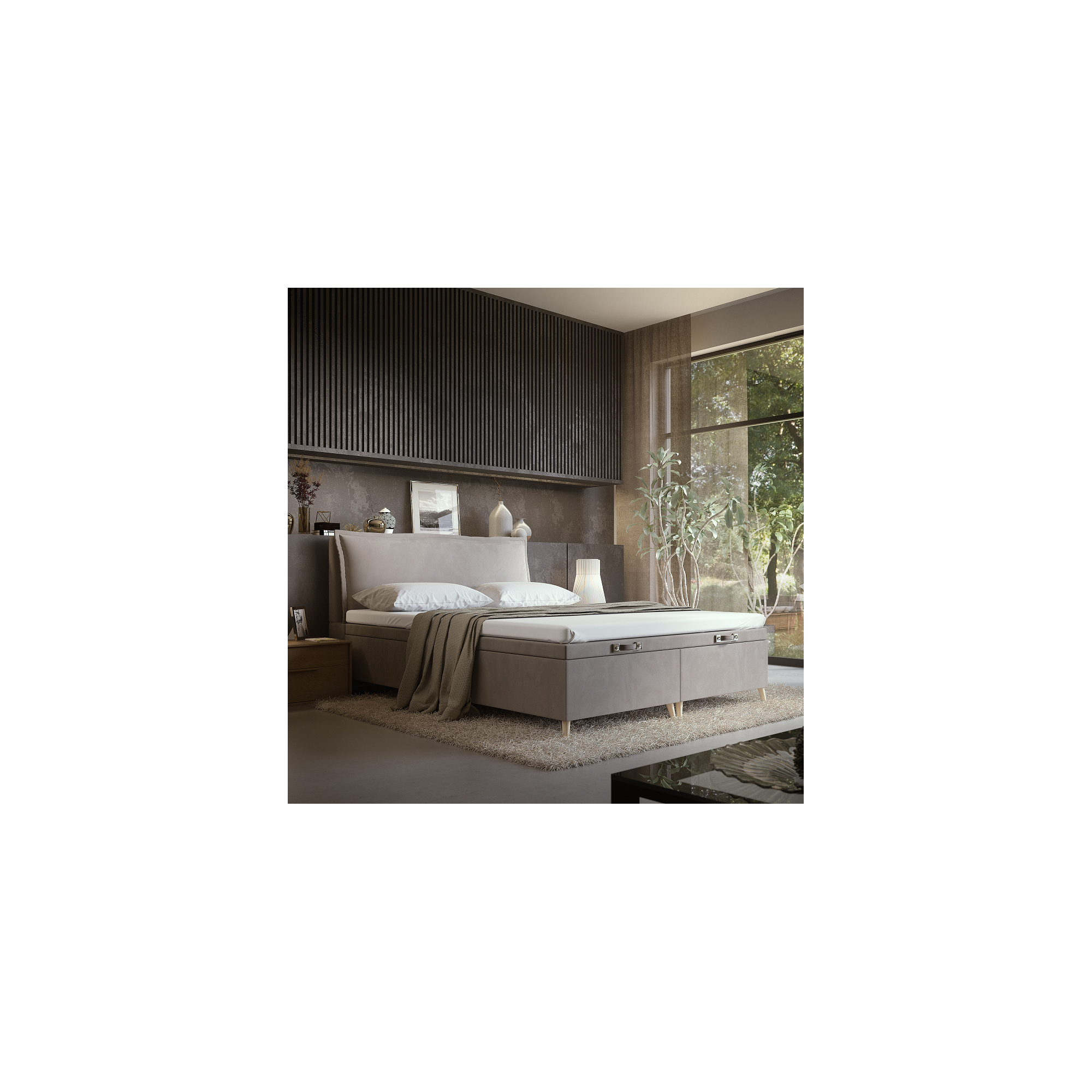 konfigurowalny Ta wyjątkowa propozycja do Twojej sypialni dostępna jest z pojemnikiem podstawowym - dolna część łóżka (tak jak na zdjęciu podstawowym) posiada grube boki wystające poza obrys materaca, wyposażone jest w stelaż na ramie metalowej z listwami sklejkowymi sprężynującymi oraz podnośnikami.
