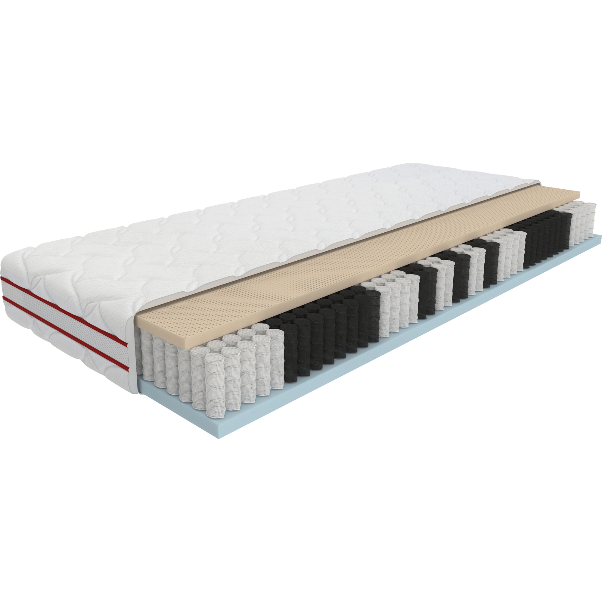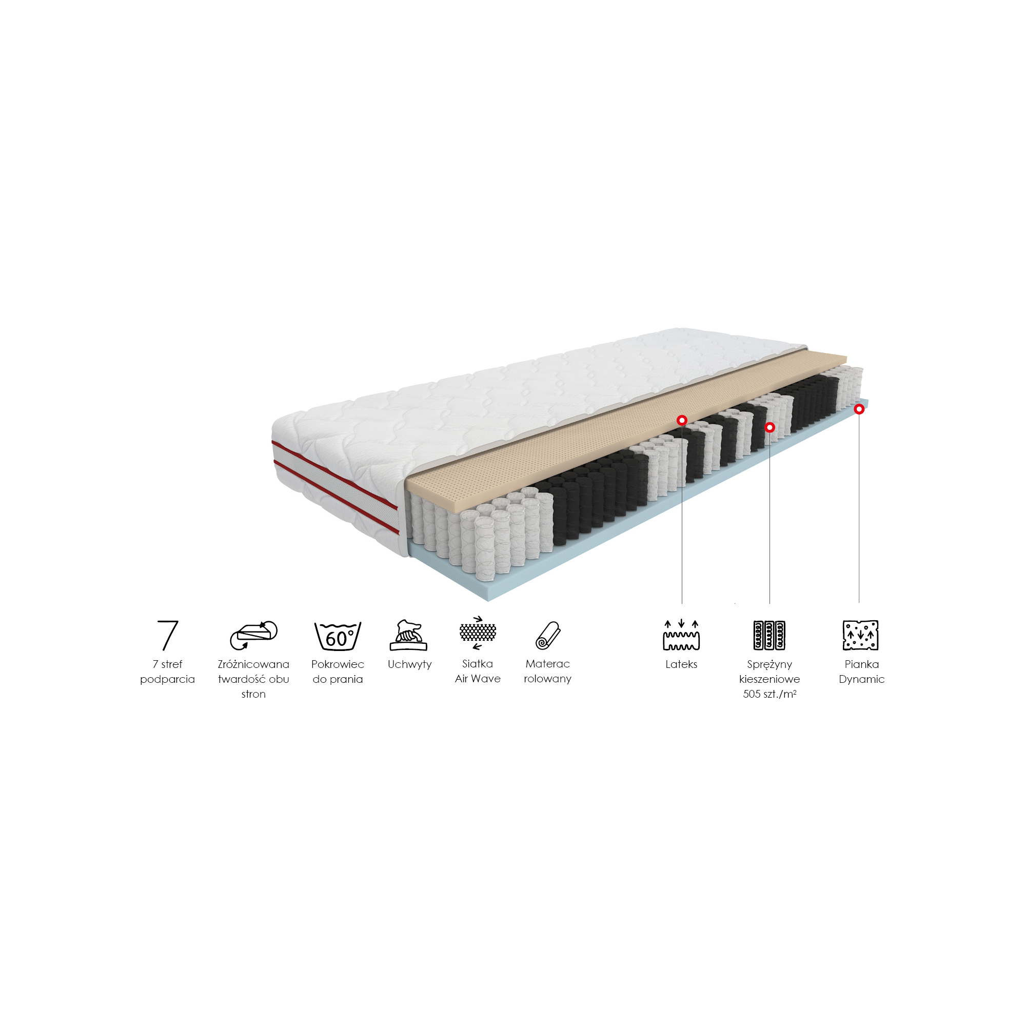 - 7 stref twardości - dzięki 7-strefom twardości materac doskonale dopasowuje się do anatomicznej budowy ciała, tym samym gwarantuje optymalne podparcie dla Twojego kręgosłupa