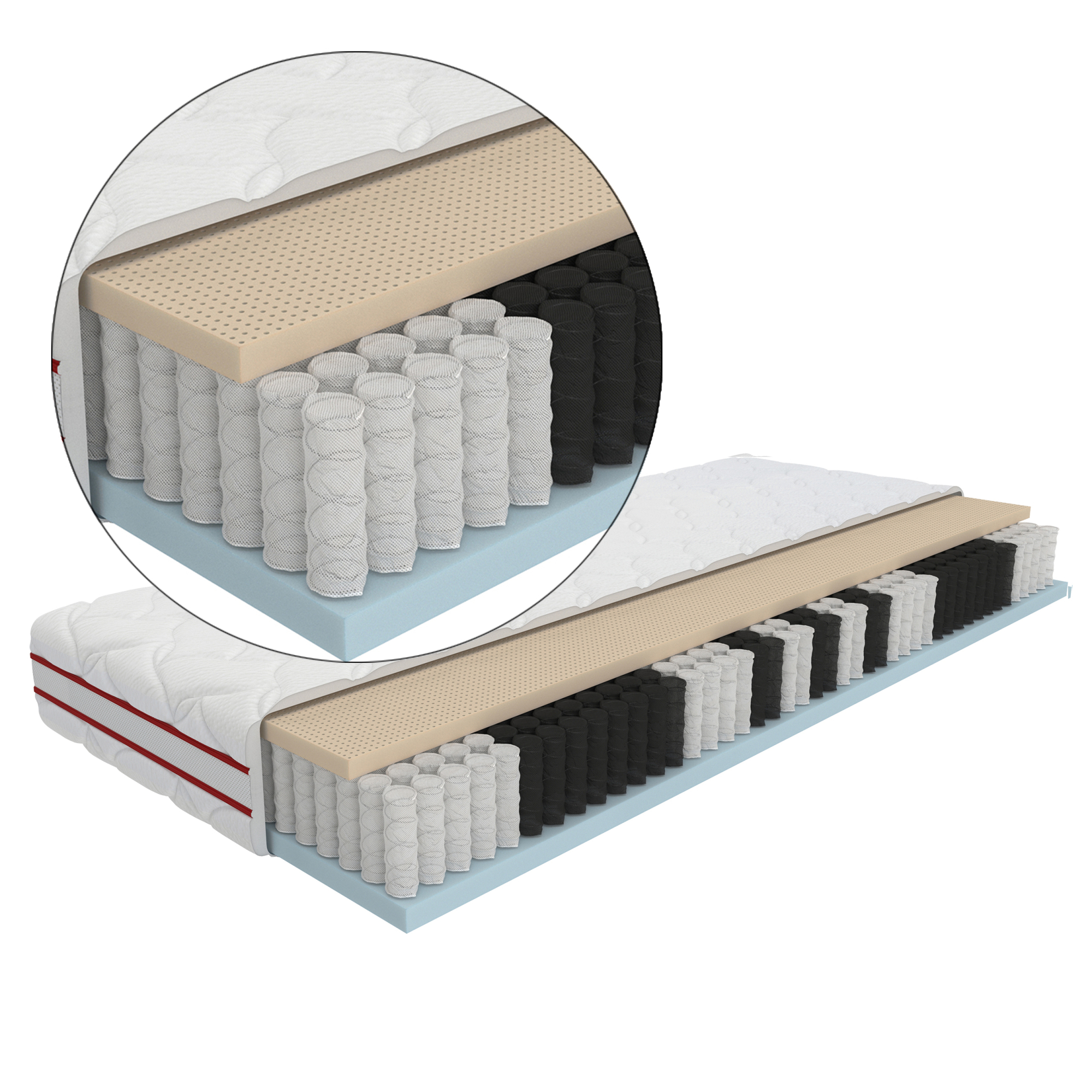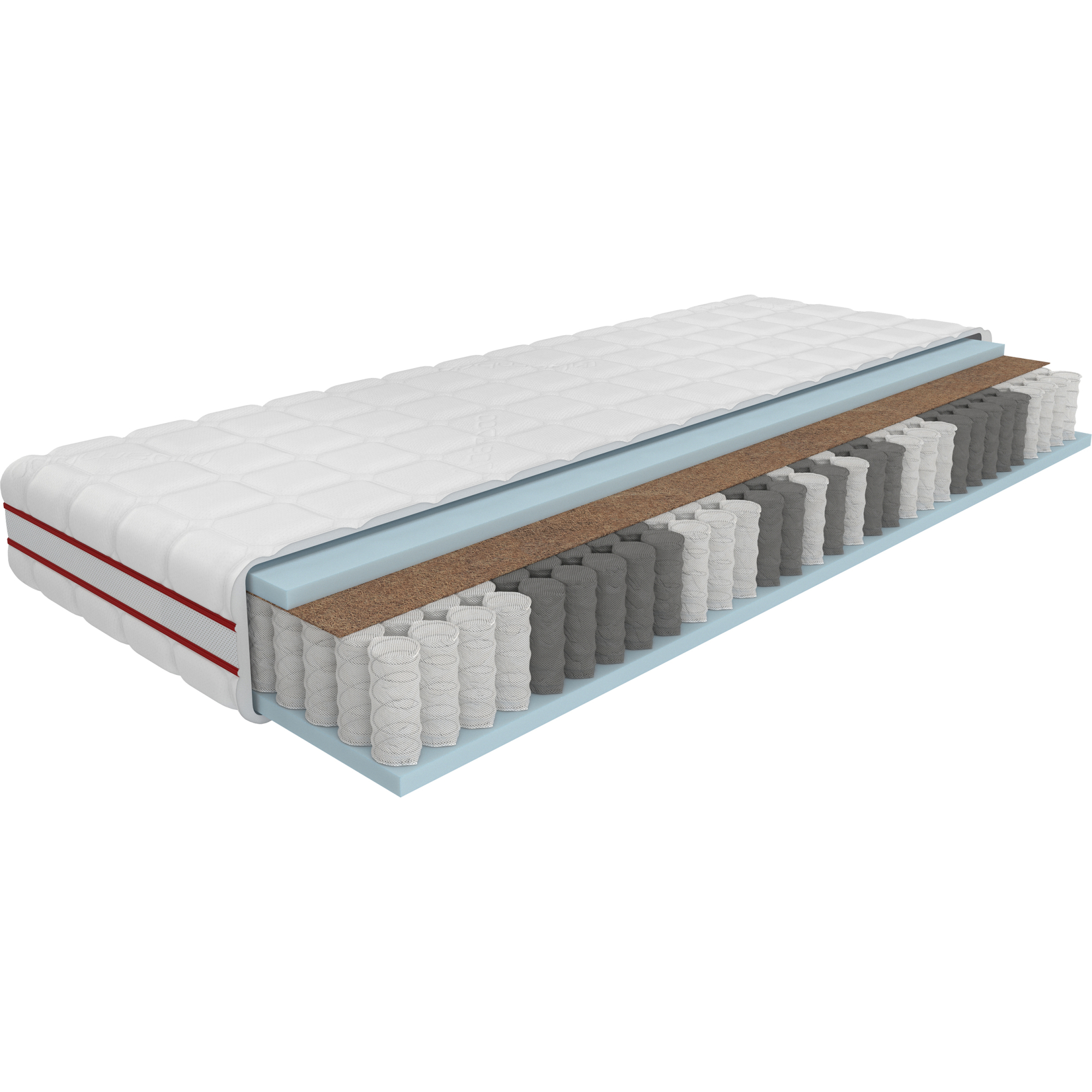 - sprężyny multipocket z hartowanego drutu 505 szt./m² , każda umieszczona w osobnej kieszeni z bardzo wytrzymałej i elastycznej tkaniny - sprężyna multipocket jest obecnie najnowocześniejszym rozwiązaniem na rynku. Użycie tak dużej ilości sprężyn powoduje zmaksymalizowanie elastyczności punktowej materaca - sprężyny pracują niezależnie od siebie, dzięki czemu materac ugina się jedynie w miejscach, które są uciskane - ruch w innej części materaca nie będzie dla Ciebie odczuwalny.