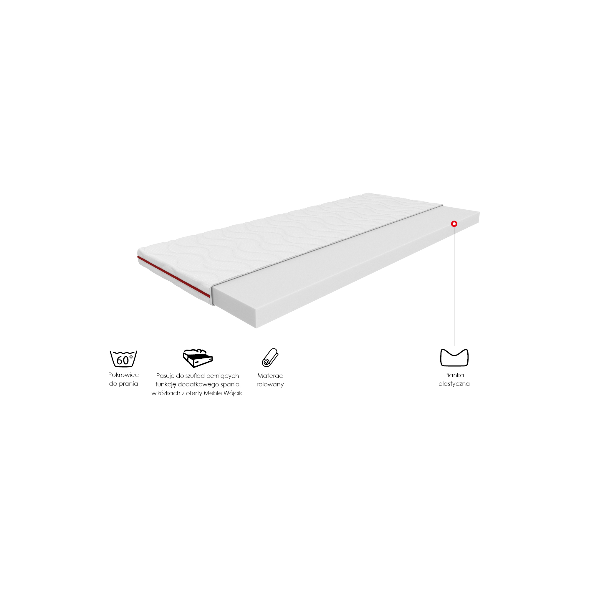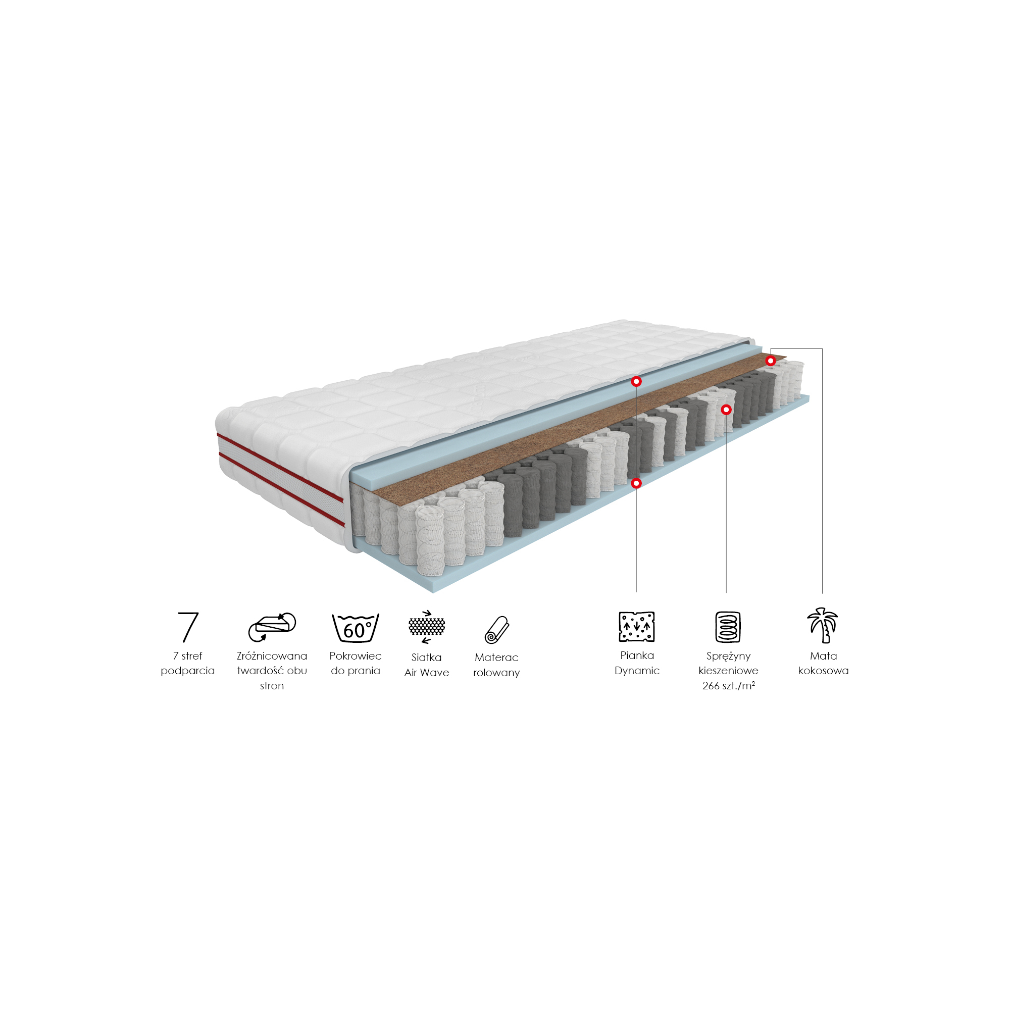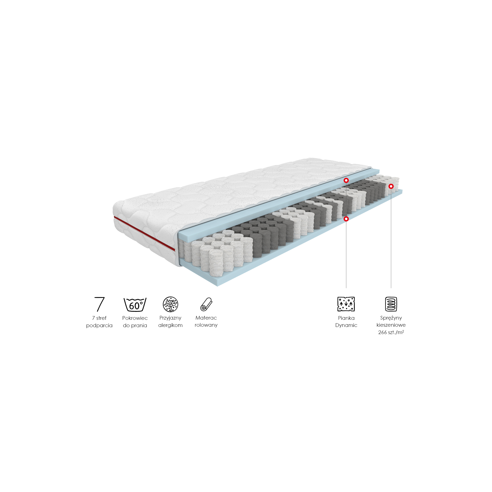 - jednostronnie warstwa trwałej pianki Dynamic - odporna na odkształcenia, zapewnia niezmienny komfort przez wiele lat.