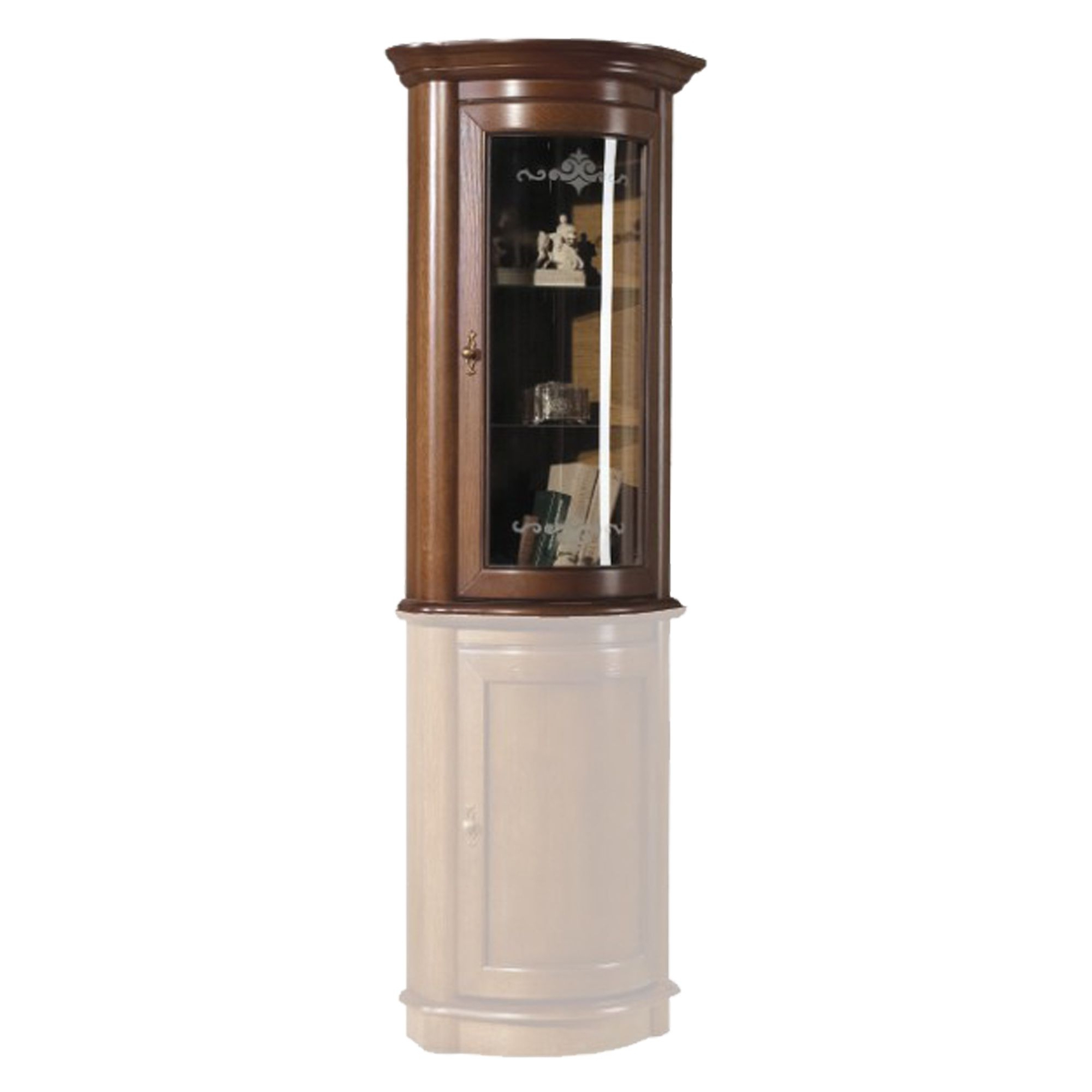 konfigurowalny Meble narożne sprawdzą się w trudnych do zagospodarowania wnętrzach. Niewielka narożna witryna z kolekcji Afrodyta może również stać się stylowym uzupełnieniem aranżacji w jadalni lub pokoju dziennym. Mebel posiada pojedynczy zaokrąglony, przeszklony front. Jego klasyczny charakter podkreślają fantazyjne frezowania i przetłoczenia. Komoda została wykonana w okleinie naturalnej z elementami litego drewna.