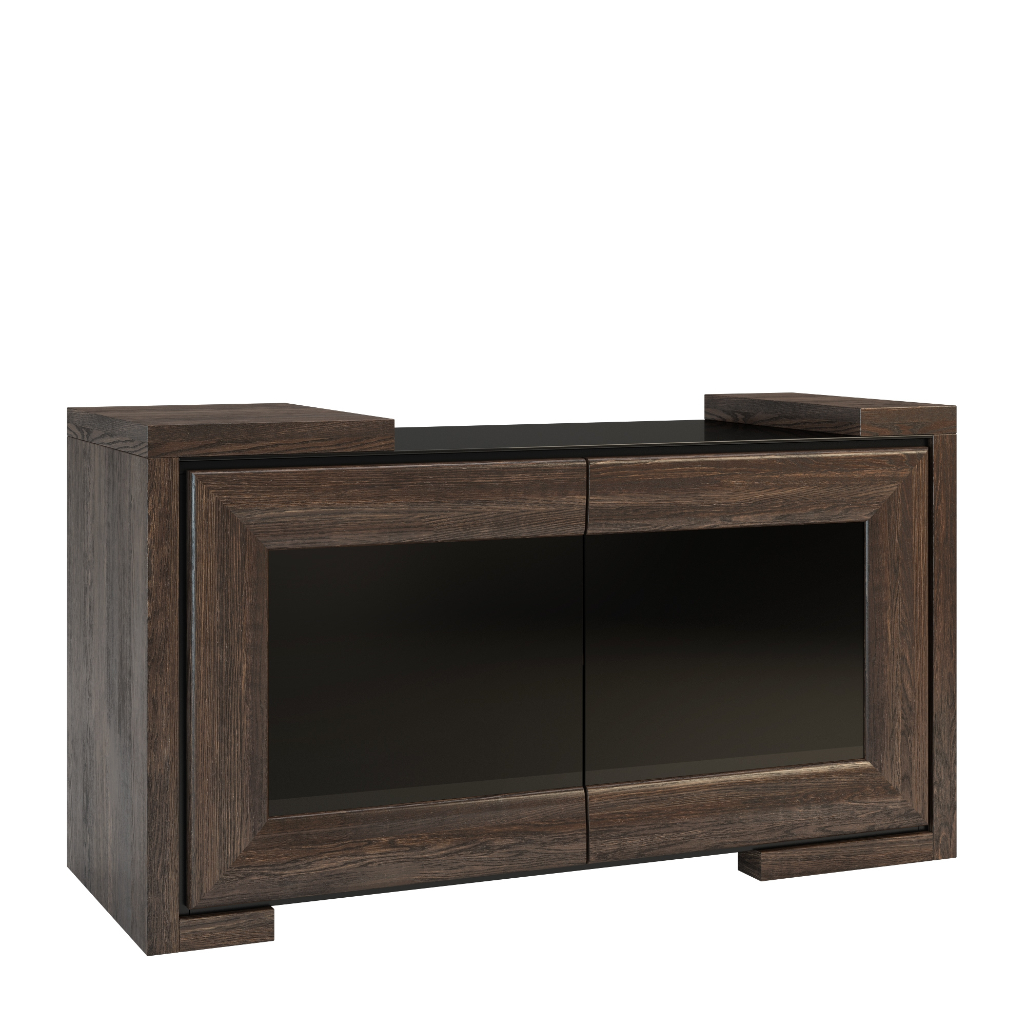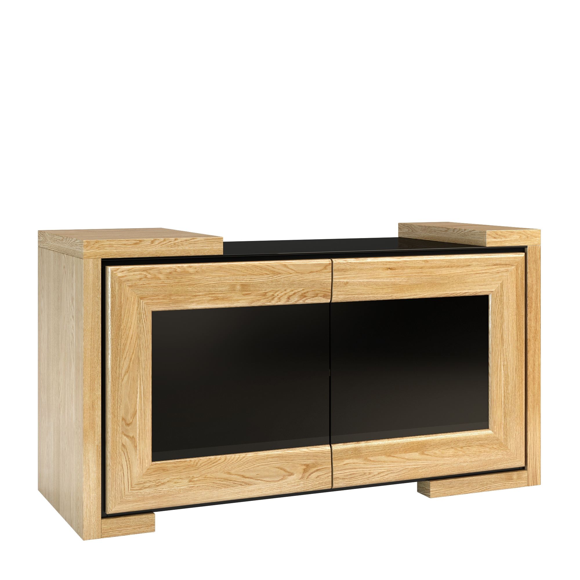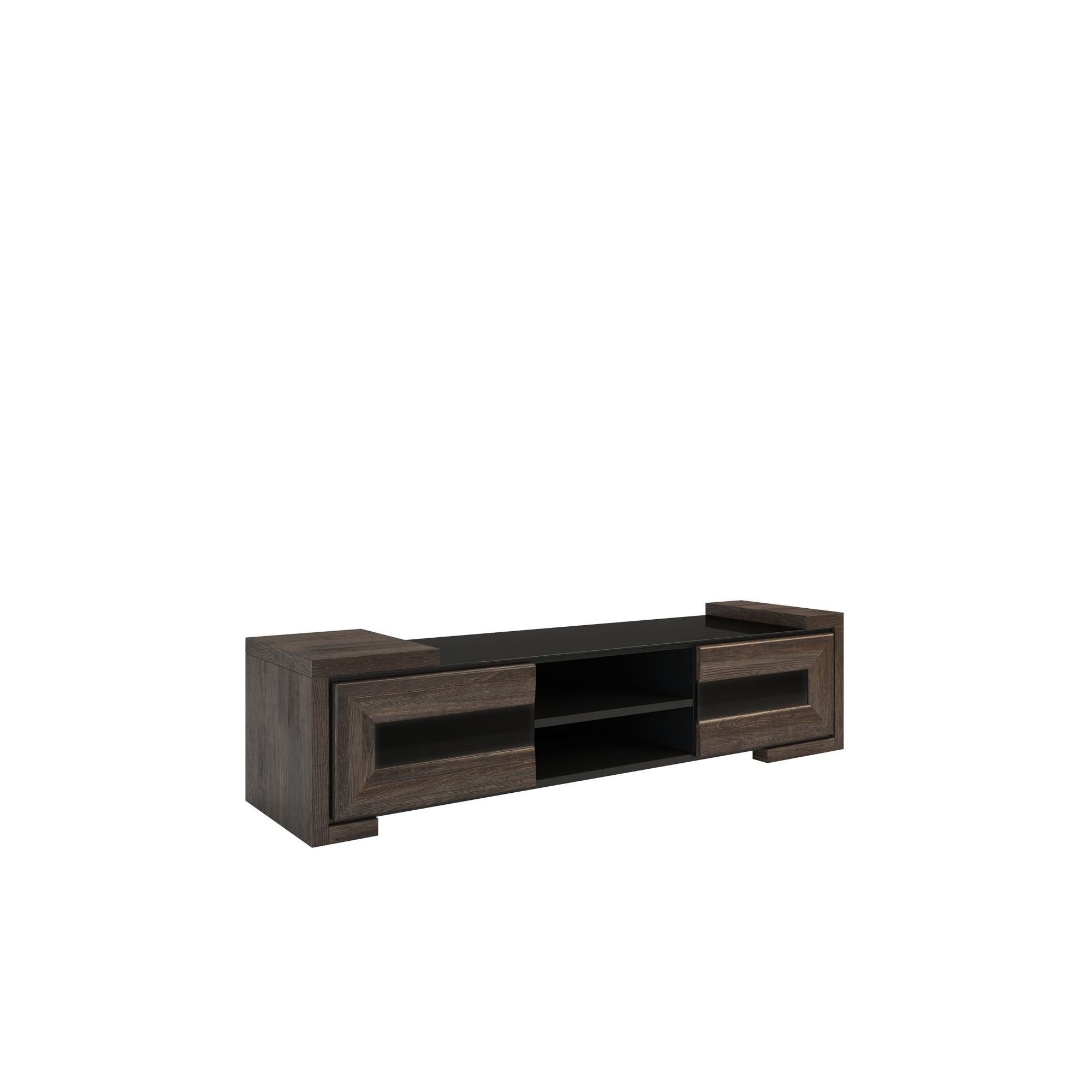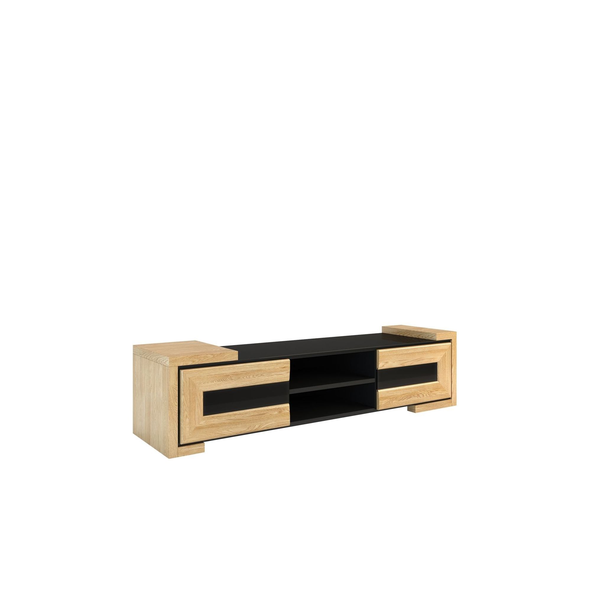 konfigurowalny Odpowiednie urządzenie przestrzeni telewizyjnej ma wpływ na jakość naszego wypoczynku. Aby dobrze zagospodarować strefę relaksu wstaw do niej funkcjonalne meble, jak szafka RTV z kolekcji Corino. Nie tylko ustawisz na niej odbiornik telewizyjny, ale również odtwarzacz, a za podwójnymi drzwiczkami pomieścisz wszelkie akcesoria RTV i drobiazgi. Korpus mebla w okleinie naturalnej uzupełniono drewnianymi drzwiczkami. Aplikacje i blat z czarnego szkła Lacobel. W środkowej części mebla umieszczono wnękę z półką, natomiast po bokach drzwiczki z mechanizmem otwierania dotykowego.
