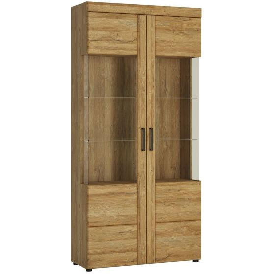 Wysoka, dwudrzwiowa witryna Cortina pozwoli Ci stworzyć przytulne i rodzinne wnętrze salonu lub jadalni. Ten model spełni Twoje wymagania zarówno pod względem funkcjonalnym, jak i wizualnym. Przeszklenia zastosowane zarówno we frontach, jak i na bokach bryły decydują o wyjątkowym wyglądzie mebla, nadając mu jednocześnie lekkości i nowoczesności. Natomiast opcjonalne oświetlenie pozwoli podkreślić urok widocznych w witrynie pamiątek i dekoracji, oraz wprowadzi do wnętrza nastrojowy klimat. Witrynę Cortina wyróżnia nie tylko funkcjonalność, ale również ciepłe i przyjemne wybarwienie Dębu Grandson, który doskonale uzupełniają metalowe uchwyty w kolorze Etno Srebrny Starzony Ciemny. Natomiast przyjemność użytkowania zwiększa mechanizm cichego domykania drzwiczek. Koniec z trzaskaniem i niedomykaniem!