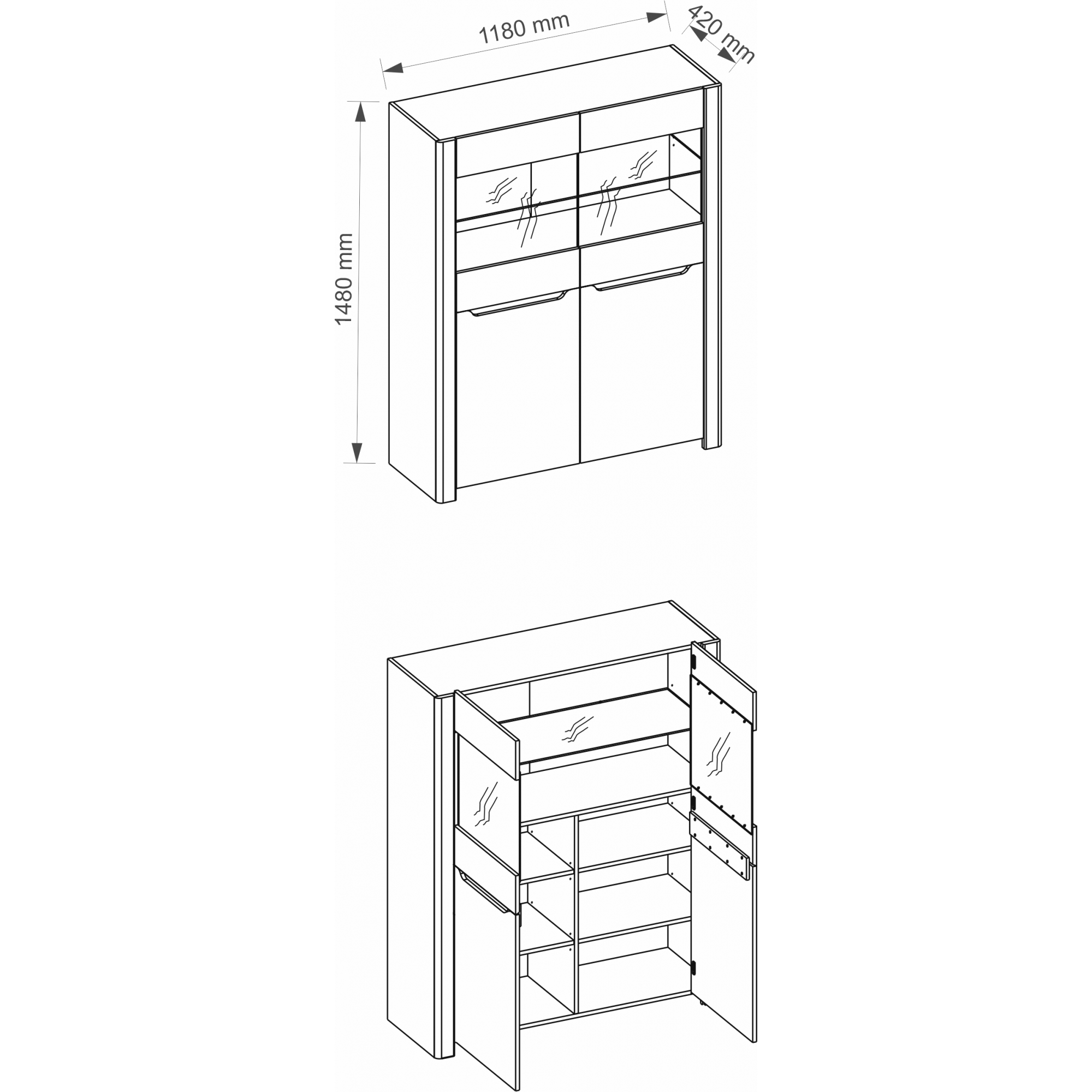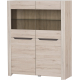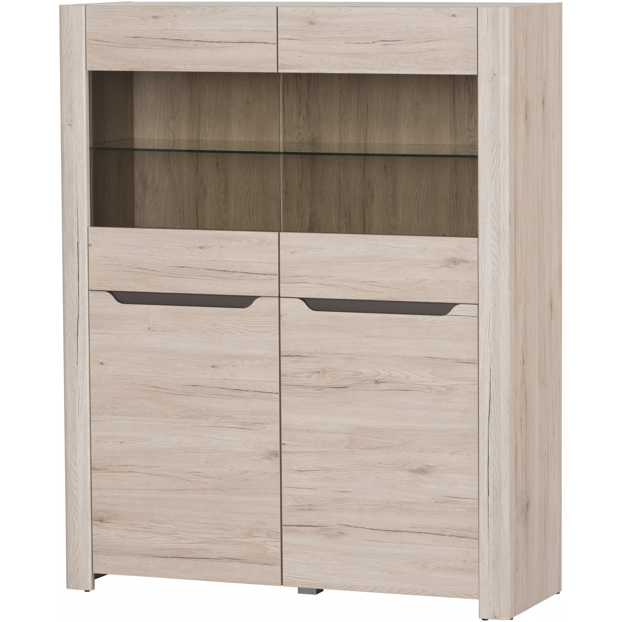 Dwudrzwiowy kredens Desjo została wykonany na bazie meblowej płyty oklejonej folią drewnopodobną. Utrzymany w przyjemnym, jasnym wybarwieniu dąb sanremo z wyraźnym rysunkiem naturalnego usłojenia drewna. Drzwiczki z frezowanymi uchwytami posiadają przeszklenie w górnej części, a widoczne przez nie wnętrze mebla możesz podkreślić montując oświetlenie LED dostępne za dopłatą. W środku umieszczono 5 pełnych i 1 szklaną półkę.