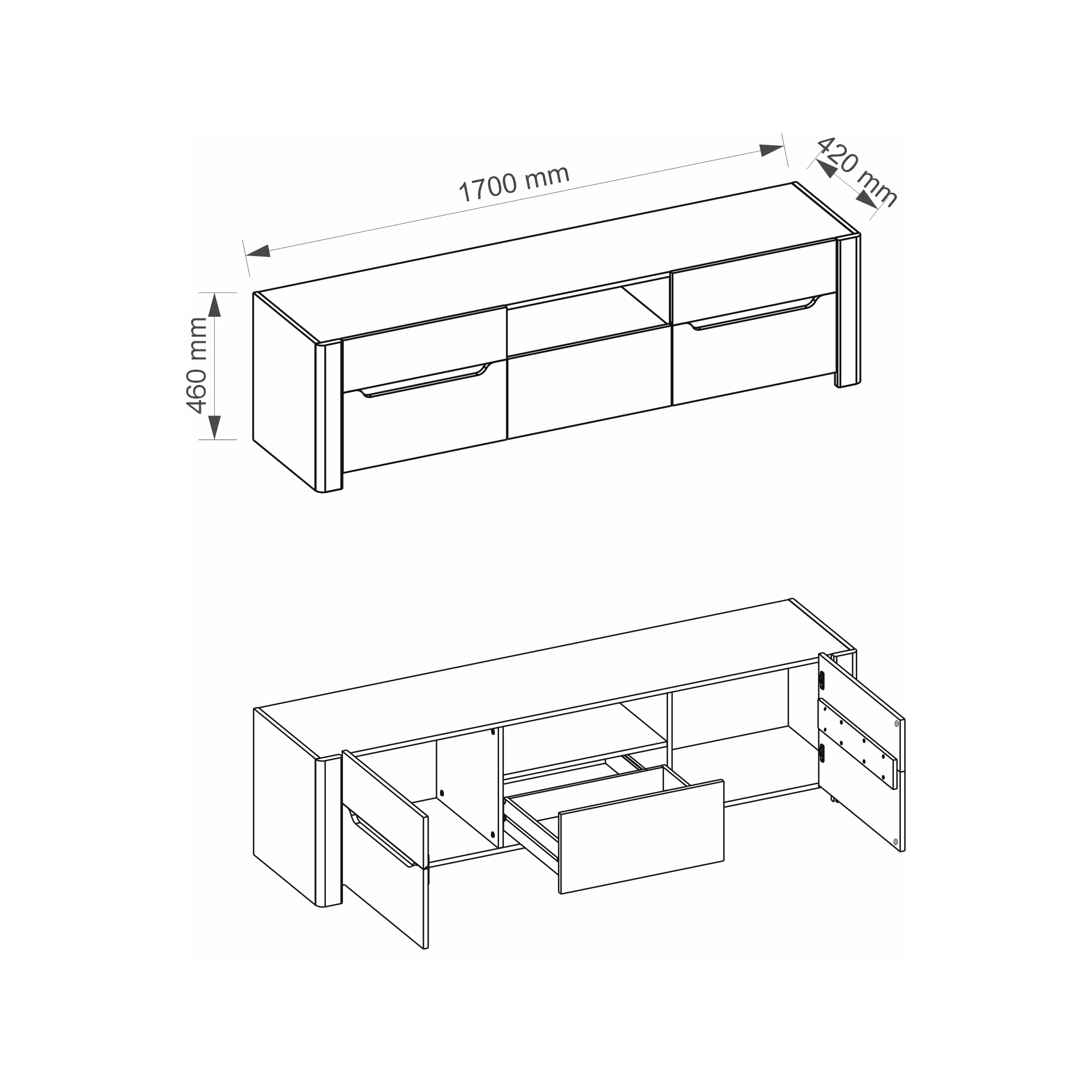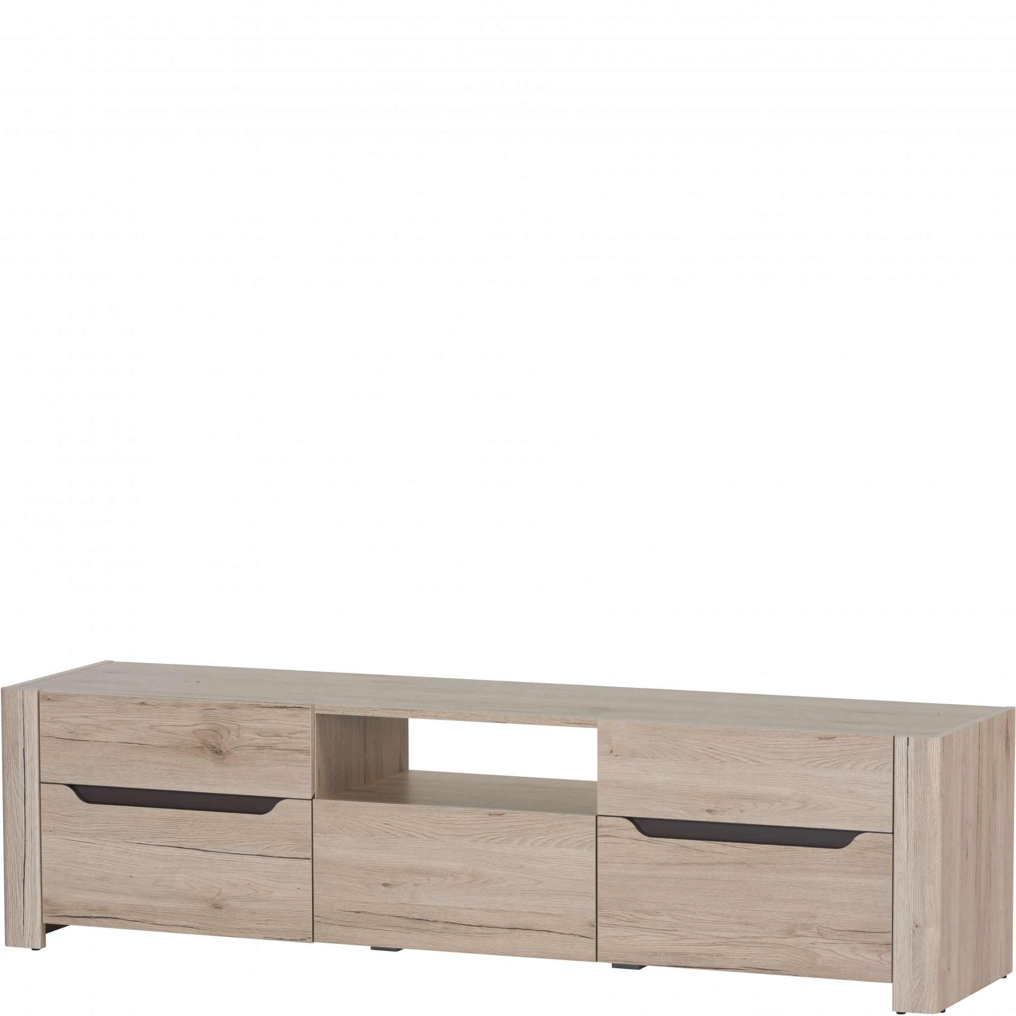 Szeroka szafka telewizyjna z kolekcji Desjo to mebel modny i funkcjonalny. Jego skłaniającą się ku stylistyce skandynawskiej formę podkreślają frezowane uchwyty z wstawką w kolorze brązu. Szafkę wykonano z płyty meblowej oklejonej folią drewnopodobną w kolorze dąb sanremo. Mebel posiada dwoje bocznych drzwiczek, a w środkowej części szufladę i umieszczoną nad nią wnękę pozbawionej tylnej ścianki, co pozwala na wygodne odprowadzenie kabli.