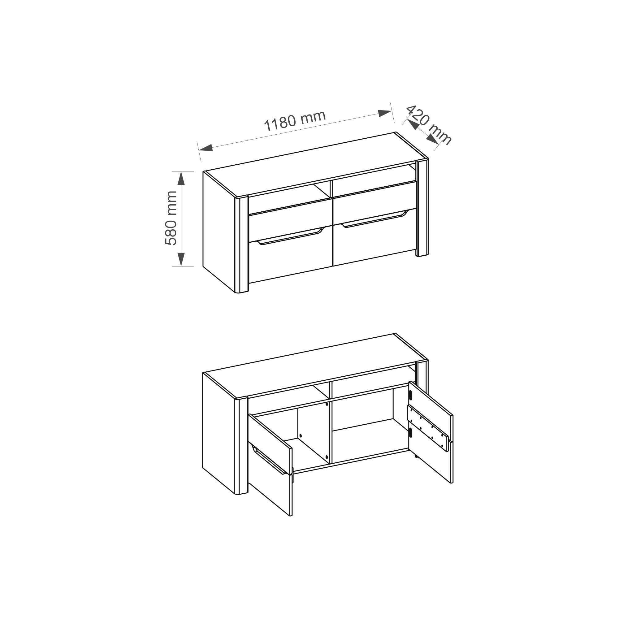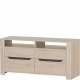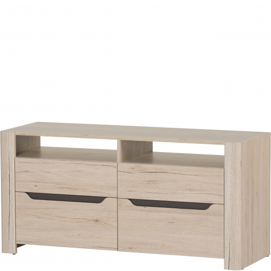 Niewielka szafka RTV Desjo to świetna propozycja do salonu w każdym rozmiarze. Za dwojgiem drzwiczek znajdziesz przestrzeń wystarczającą do uporządkowania wszelkich akcesoriów RTV. Znajdujące się powyżej wnęki zostały pozbawione tylnej ścianki, dzięki czemu bez problemu możesz ustawić w nich odtwarzacz. Mebel w całości wykonany z płyty meblowej pokrytej folią drewnopodobną w kolorze dąb sanremo. Tradycyjne uchwyty zastąpiono wygodnymi frezowaniami z brązową wstawką.