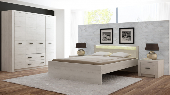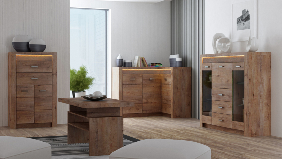 Witryna z systemu Indianapolis wykonana została z najwyższej jakości materiałów. Korpus i fronty wykonane z płyty laminowanej strukturalnej 16 mm (widoczna i wyczuwalna faktura drewna), górny wieniec pogrubiony do 48 mm. Obrzeże frontów i korpusów są okleinowane odpornym na uszkodzenia ABS. Witryna posiada solidne metalowe uchwyty. Tył wykonany z płyty HDF.
