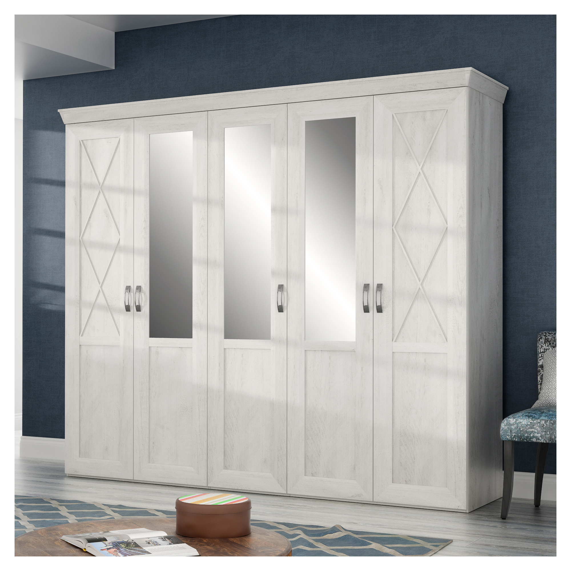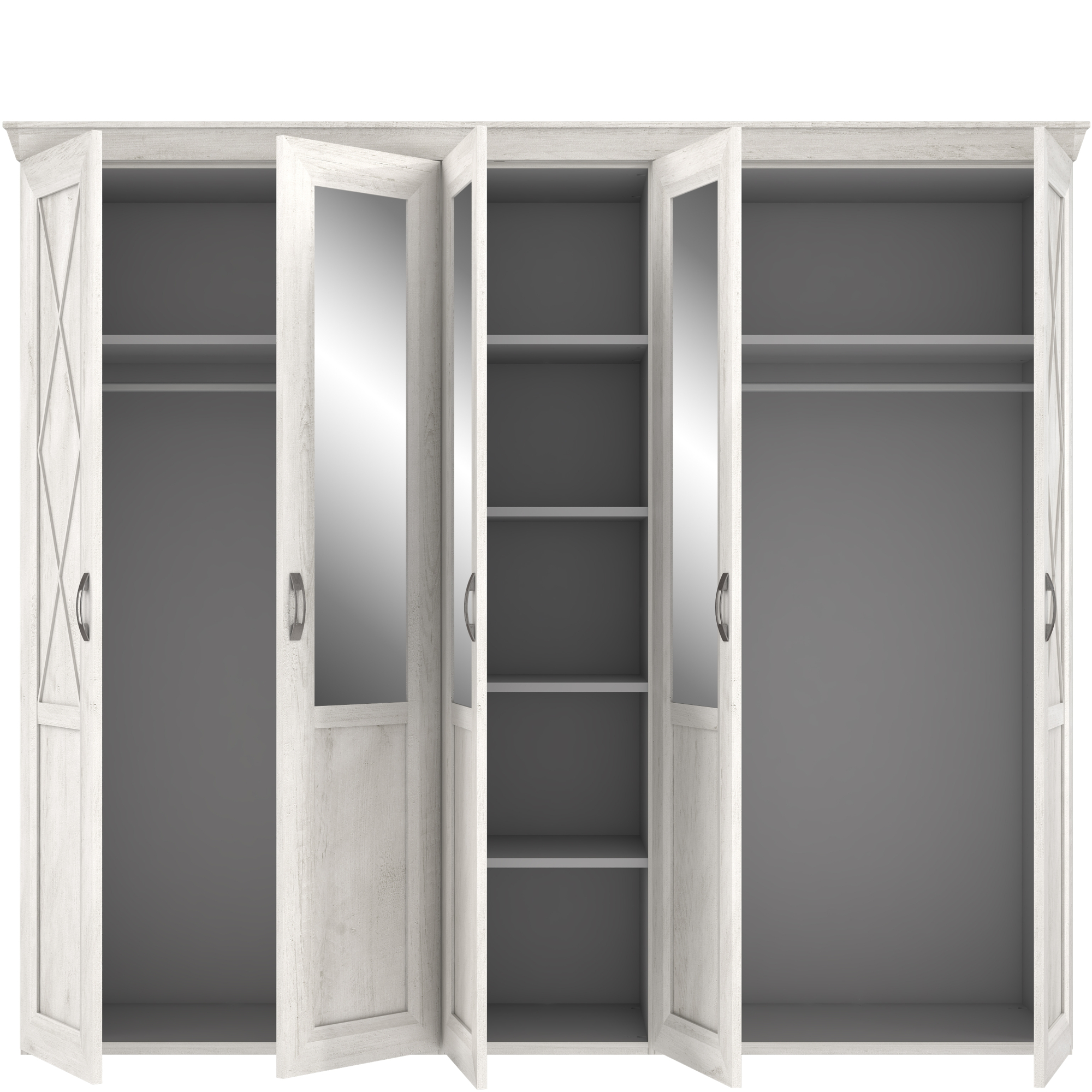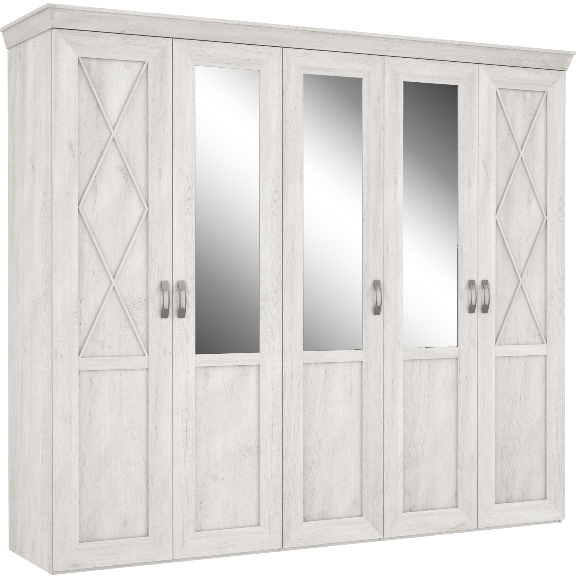 Pojemna szafa to niezbędny element każdej sypialni czy garderoby. Pięciodrzwiowy model z kolekcji Kashmir bez trudu pomieści wszystkie elementy Twojej garderoby. Na wyposażenie wnętrza szafy składają się dwa drążki na wieszaki i część bieliźniana z półkami - dodatkowe półki oraz komoda wewnętrzna z szufladami dostępne w opcji dodatkowej. Szafa została osadzona na masywnym cokole, ozdobny akcent stanowi również szeroki wieniec górny. Na zewnętrznych drzwiach umieszczono delikatne szprosy, co efektownie podkreśla wyjątkowy charakter mebla. Całości dopełniają stylizowane uchwyty wykonane w kolorze imitującym stare srebro. Szafa dostępna jest w dekorze Pinia Biała, który pięknie będzie prezentował się na tle ciemnych ścian, a trzy lustrzane tafle optycznie powiększą wnętrze.