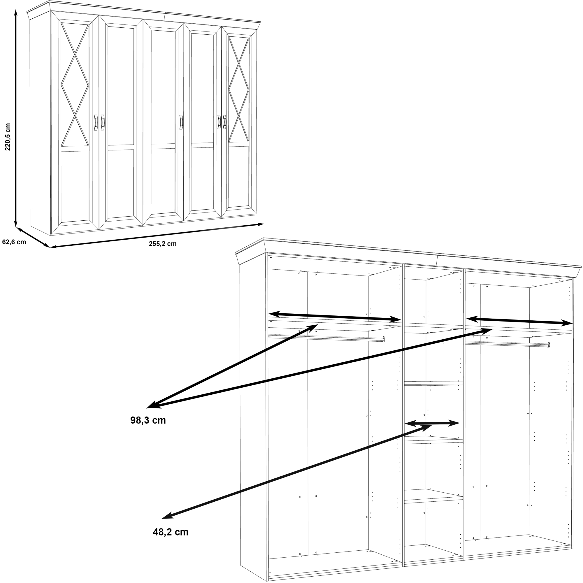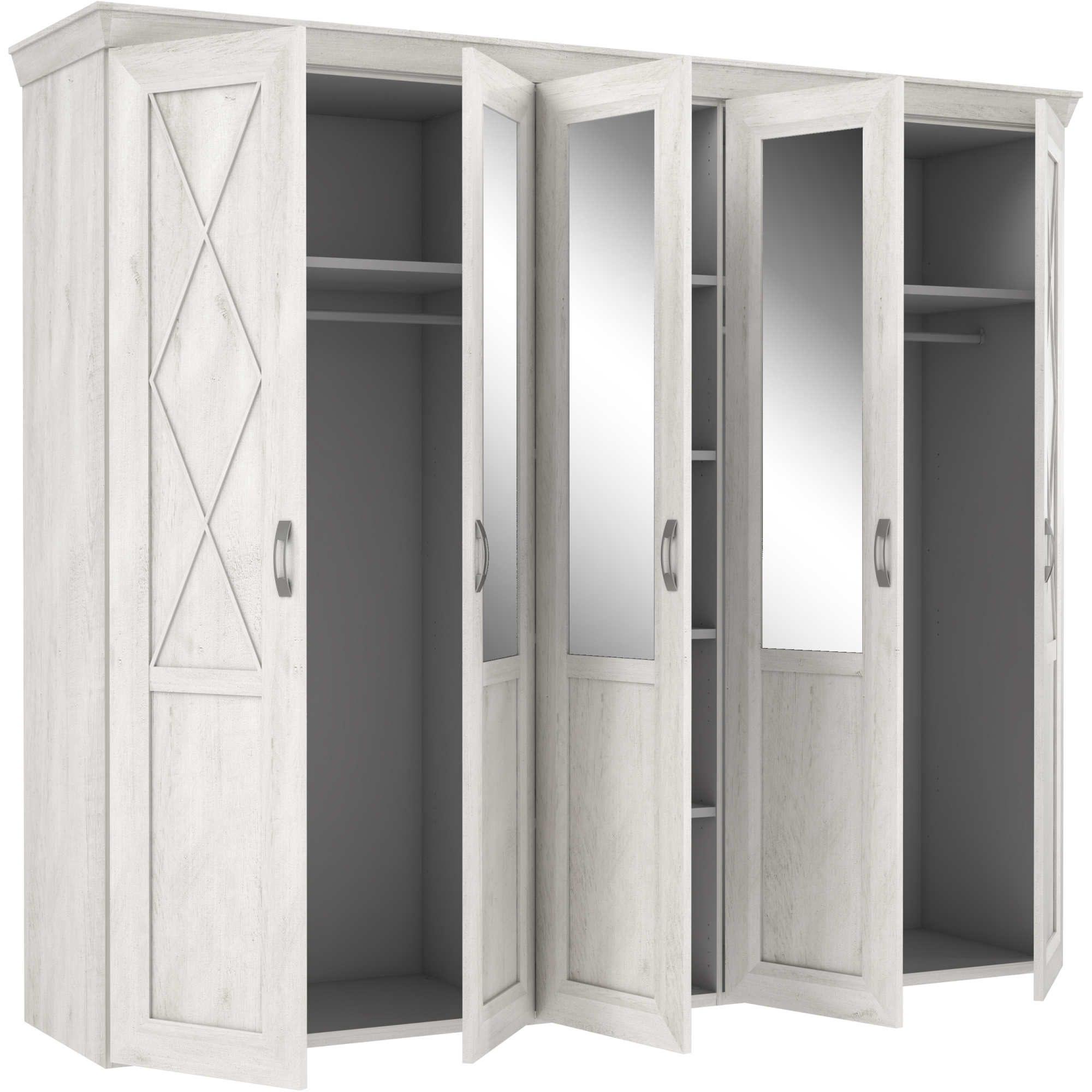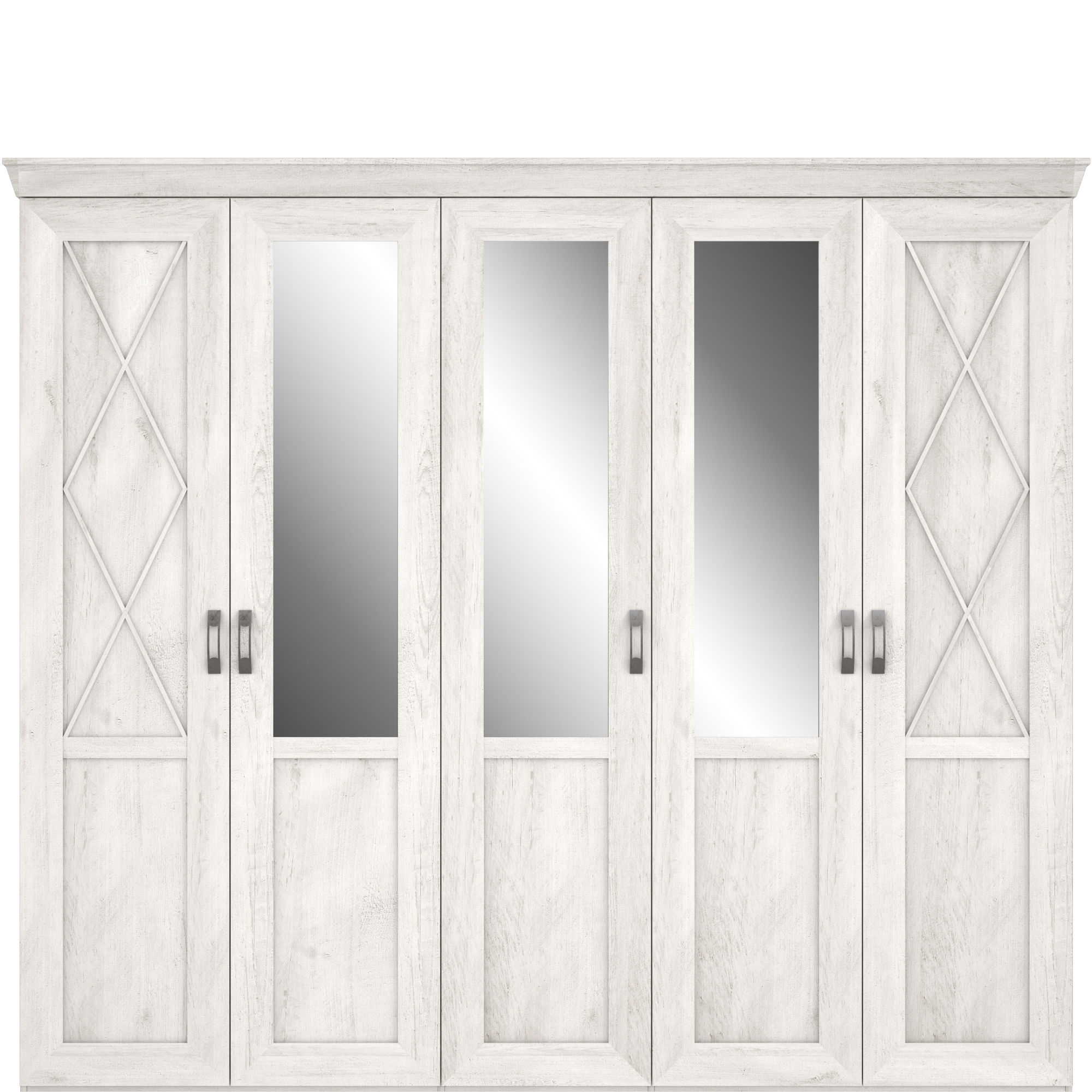 Pojemna szafa to niezbędny element każdej sypialni czy garderoby. Pięciodrzwiowy model z kolekcji Kashmir bez trudu pomieści wszystkie elementy Twojej garderoby. Na wyposażenie wnętrza szafy składają się dwa drążki na wieszaki i część bieliźniana z półkami - dodatkowe półki oraz komoda wewnętrzna z szufladami dostępne w opcji dodatkowej. Szafa została osadzona na masywnym cokole, ozdobny akcent stanowi również szeroki wieniec górny. Na zewnętrznych drzwiach umieszczono delikatne szprosy, co efektownie podkreśla wyjątkowy charakter mebla. Całości dopełniają stylizowane uchwyty wykonane w kolorze imitującym stare srebro. Szafa dostępna jest w dekorze Pinia Biała, który pięknie będzie prezentował się na tle ciemnych ścian, a trzy lustrzane tafle optycznie powiększą wnętrze.