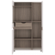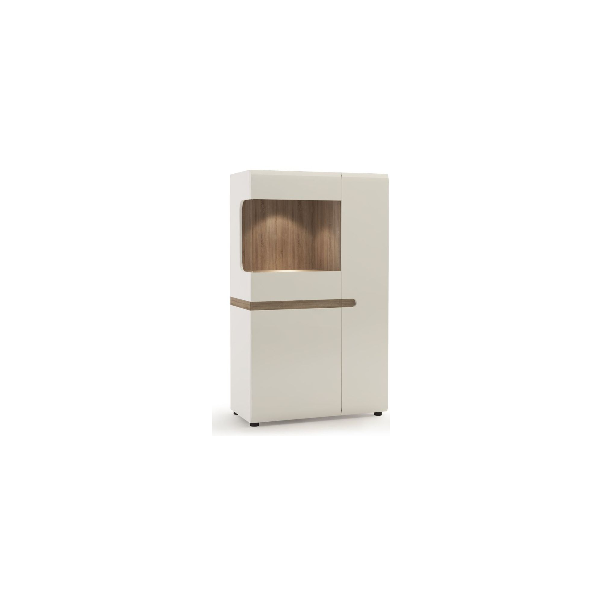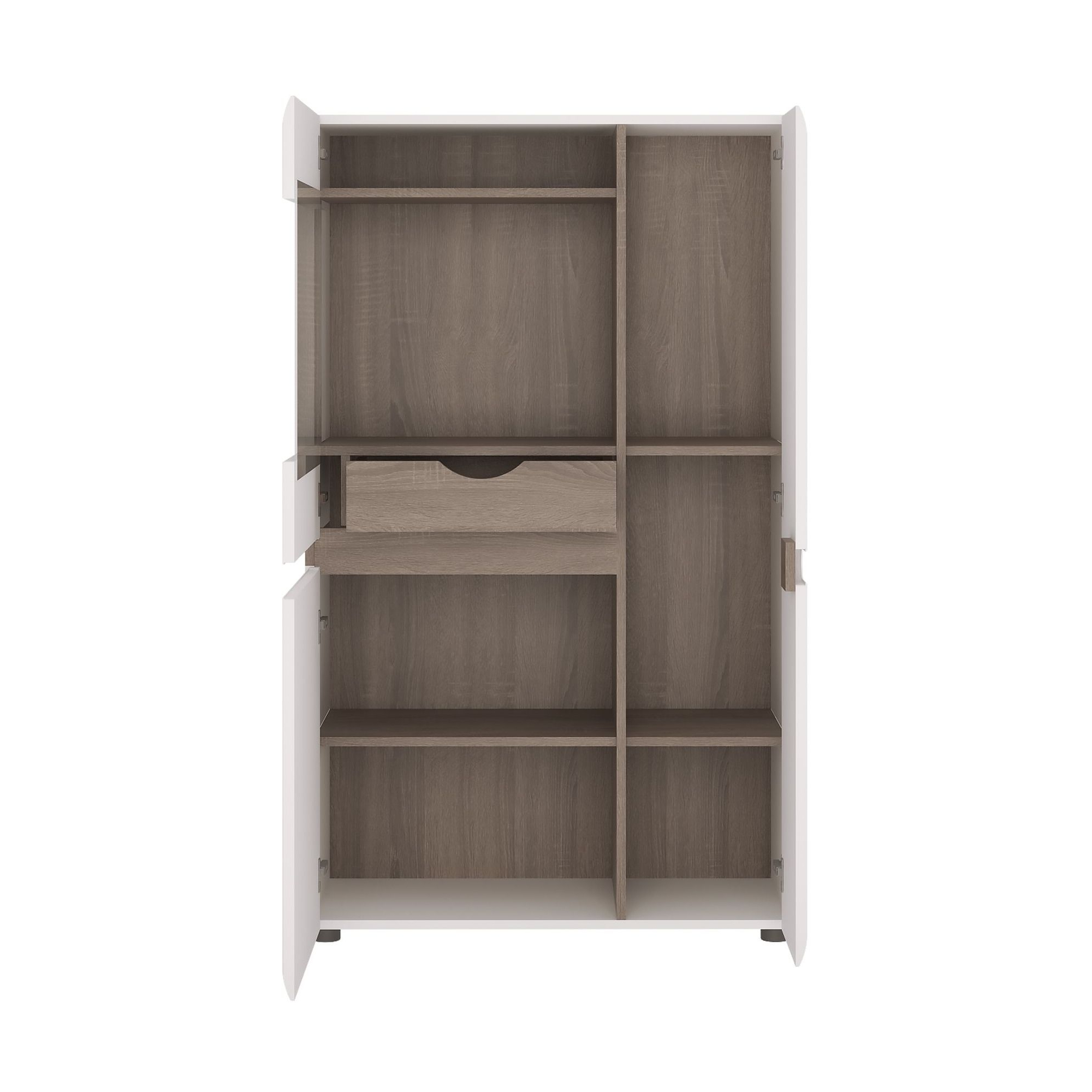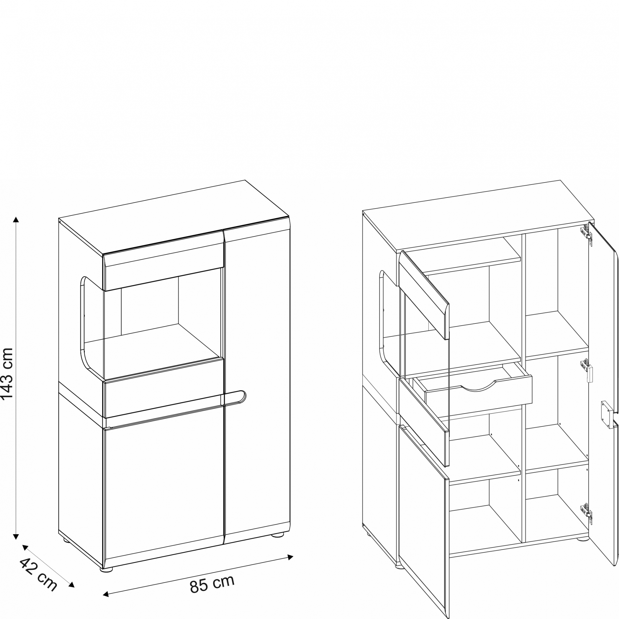 Kredens z kolekcji Linate jest doskonałą propozycja do wnętrz urządzonych w nowoczesnym stylu. Mebel wykonano z solidnego laminatu i płyty MDF, oraz bezpiecznego szkła hartowanego. Ciekawy i funkcjonalny układ wewnątrz kredensu stanowią ukryte za trojgiem drzwiczek praktyczne półki, oraz niewielka szuflada. Dzięki temu uporządkujesz zastawę, tekstylia i wszelkie inne przedmioty potrzebne w salonie lub jadalni. Częściowe przeszklenie frontu to znakomity sposób na wyeksponowanie ozdób lub pamiątek, które podkreślisz oświetleniem LED, dostępnym w opcji dodatkowej. Piękne, będące na czasie połączenie kolorów Bieli Alpejskiej i Trufli, wniesie do pomieszczenia subtelność i pozwoli na jego optyczne powiększenie. Tradycyjne uchwyty zastąpiono wygodnym frezowaniem frontu, a zastosowanie systemu cichego domykania zapewnia bezpieczeństwo i komfort użytkowania na co dzień.