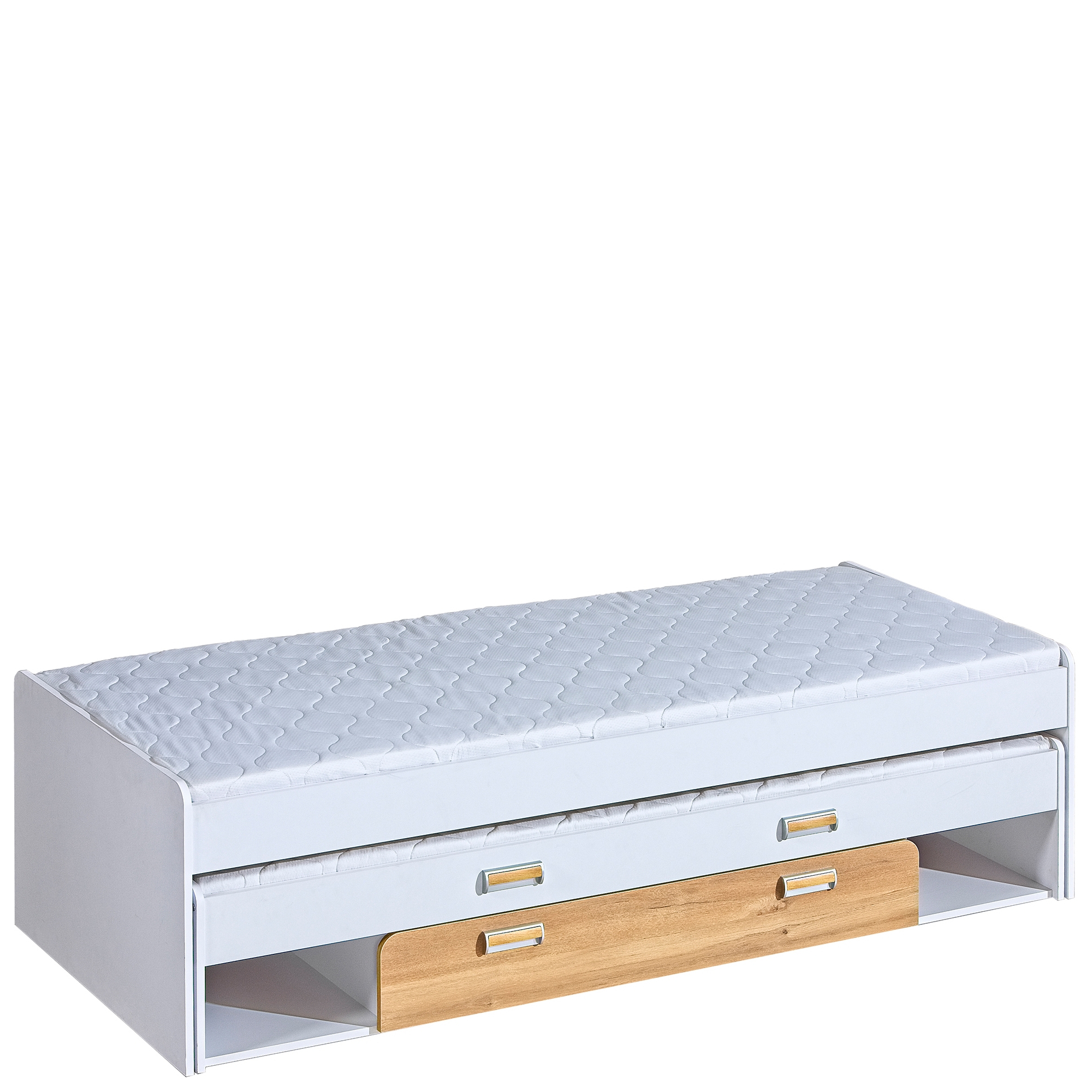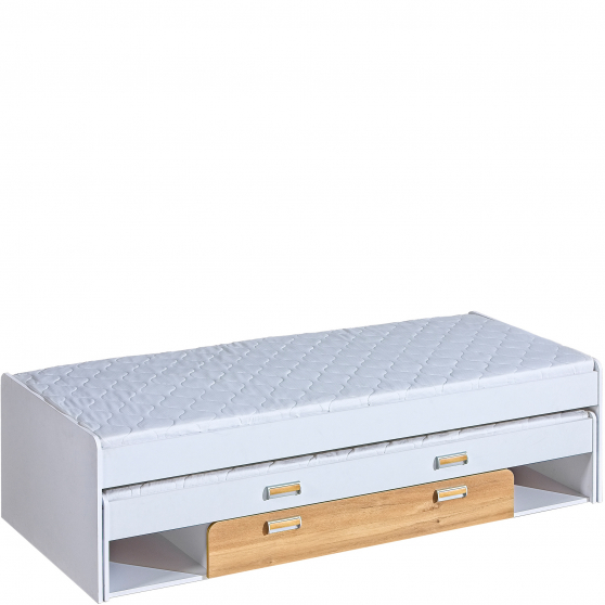 konfigurowalny Niezbędnym elementem wyposażenia pokoju dziecięco-młodzieżowego jest wygodnie i funkcjonalne łóżko. Taki właśnie jest podwójny model z kolekcji Lorento. Mebel został wyposażony w system rozkładania więc, jeśli jest to konieczne, mogą na nim spać dwie osoby. Jeśli natomiast nie ma takiej potrzeby, łóżko może zostać w łatwy sposób złożone. Mebel posiada również dodatkowo szufladę, którą można wykorzystać jako pojemnik na pościel lub schowek. Łóżko zostało wykonane z wysokiej jakości materiałów co zapewnia bezpieczeństwo i komfort użytkowania. Z kolei do głównego wybarwienia, jakim jest jasny Jesion Coimbra, można dodać drugi, wybrany indywidualnie kolor. Łóżko Lorento jest więc bez wątpienia meblem i praktycznym, i stylowym, który spodoba się naszym najmłodszym Klientom.