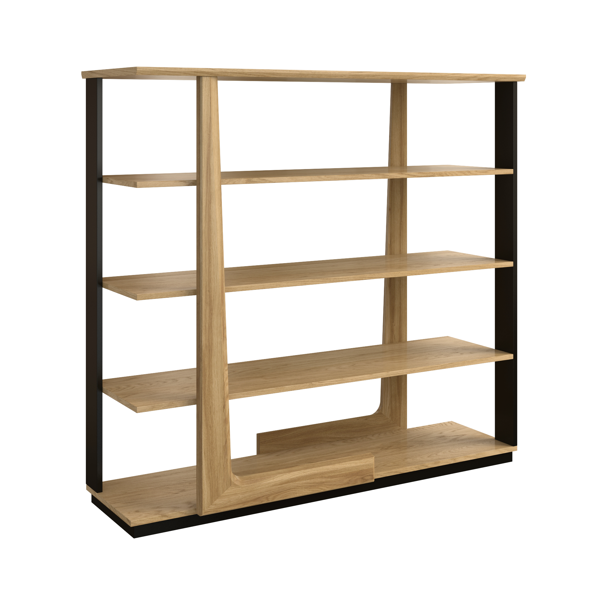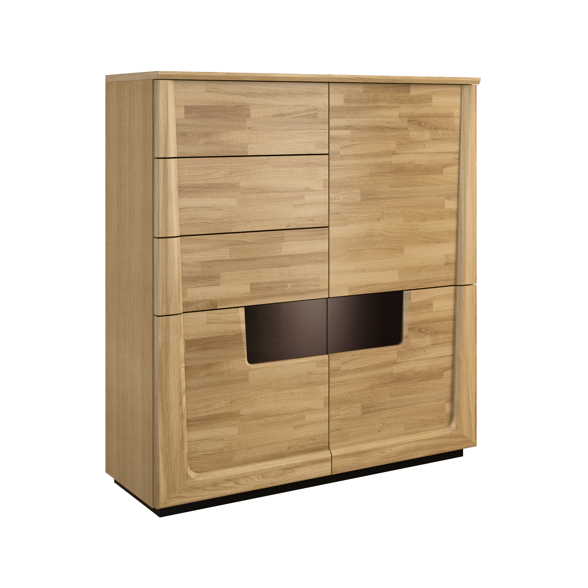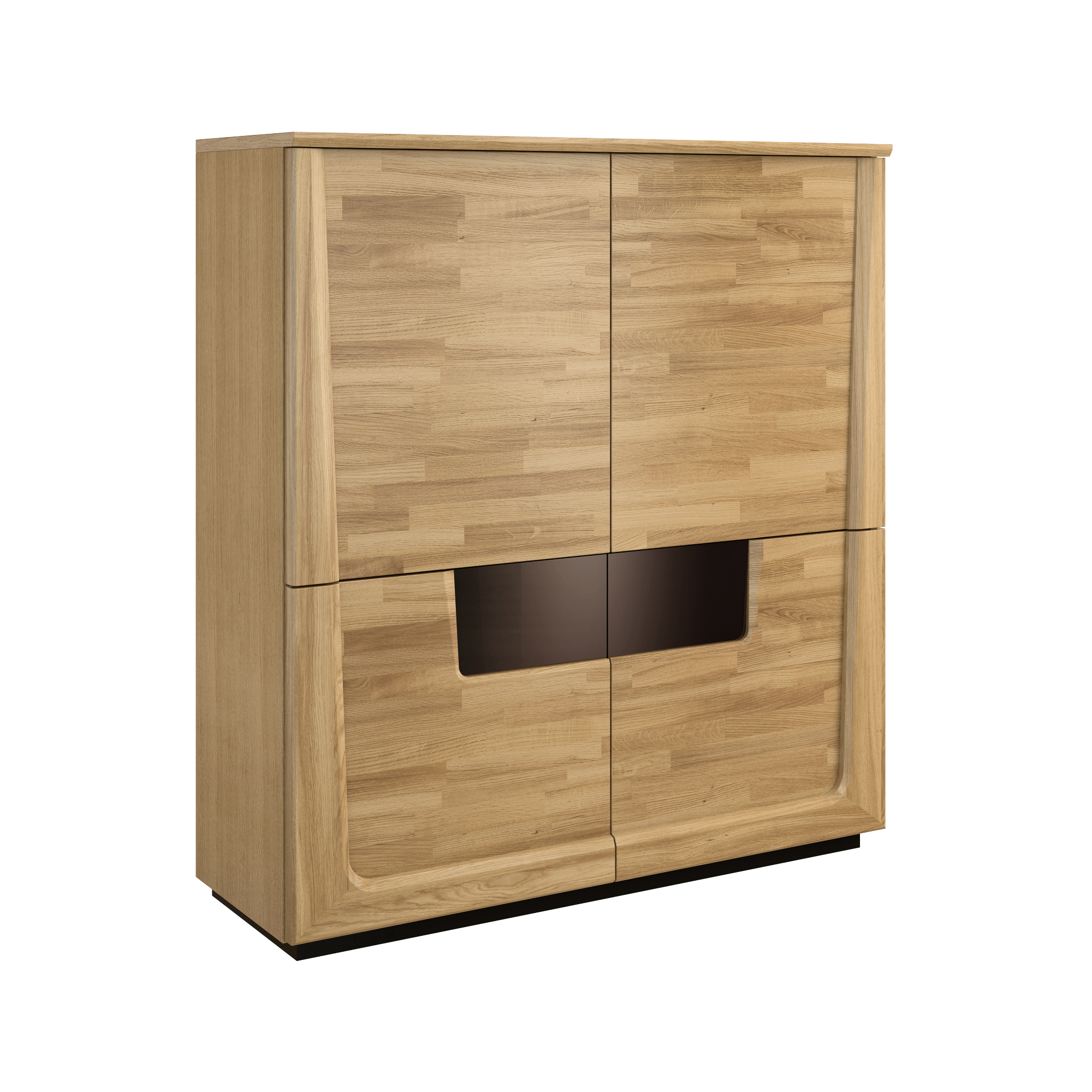 konfigurowalny Aby ciekawie, a jednocześnie funkcjonalnie zaaranżować przestrzeń w pokoju dziennym wybierz regał z kolekcji Maganda. Pomoże uporządkować książki, możesz ustawić na nim ulubione przedmioty lub dekoracje. Regał Maganda możesz mieć w dwóch wyjątkowych wariantach wybarwienia – naturalnym dębie i orzechu antycznym. Mebel został wykonany z płyty w okleinie naturalnej, z elementami z litego drewna dębowego. Lakierowane na czarno wsporniki i cokół nawiązują do szklanych aplikacji pozostałych elementów kolekcji. Regał posiada cztery półki stałe.