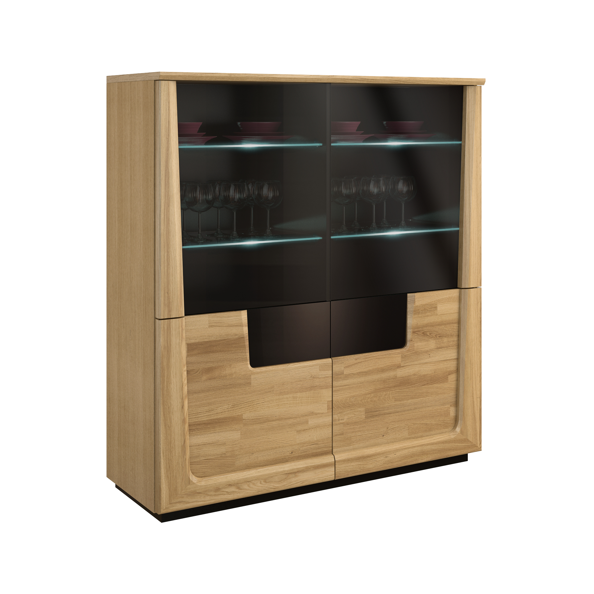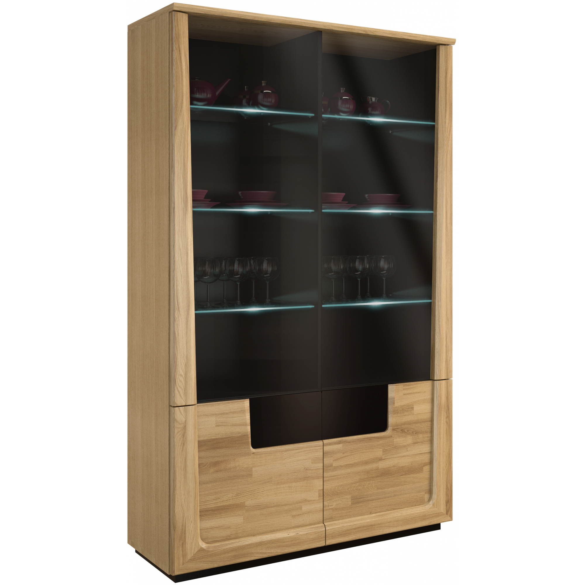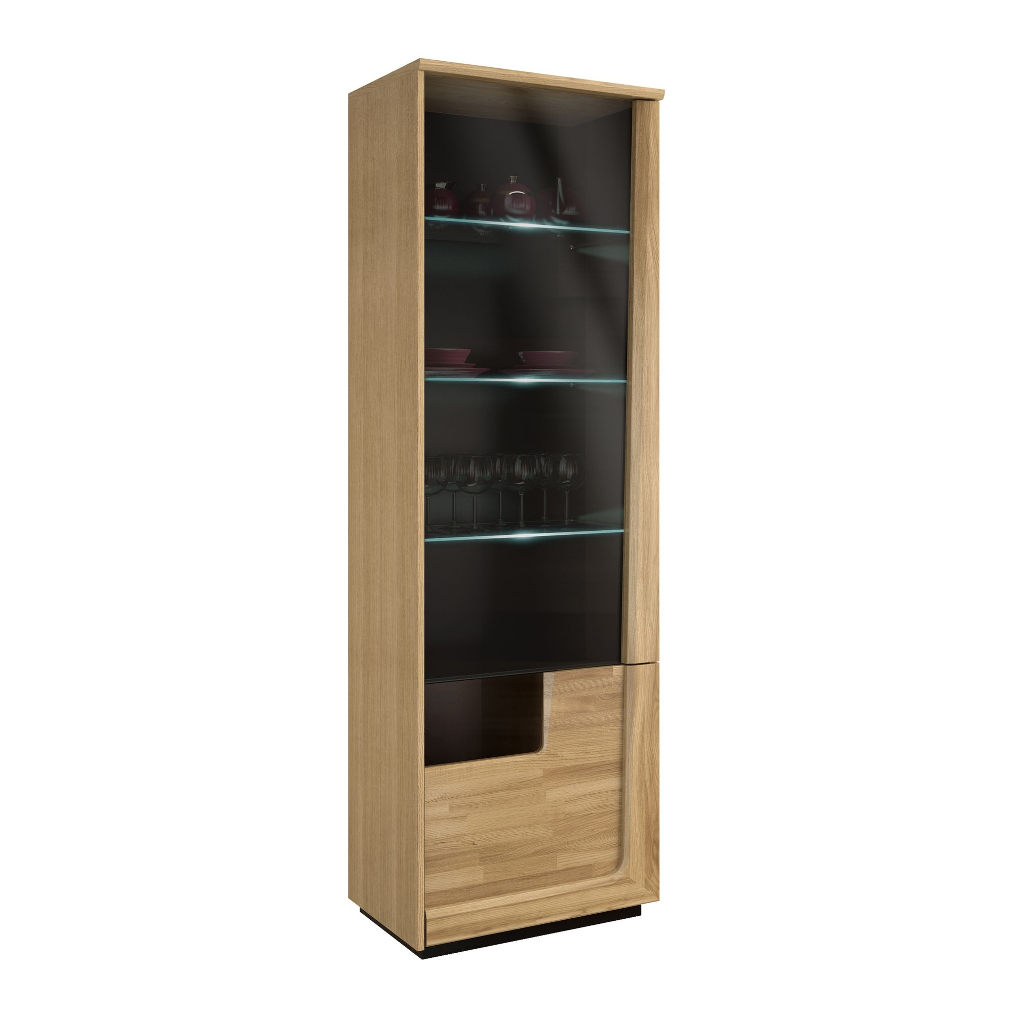 konfigurowalny Aby ciekawie, a jednocześnie funkcjonalnie zaaranżować przestrzeń w pokoju dziennym wybierz regał z kolekcji Maganda. Pomoże uporządkować książki, możesz ustawić na nim ulubione przedmioty lub dekoracje. Regał Maganda możesz mieć w dwóch wyjątkowych wariantach wybarwienia – naturalnym dębie i orzechu antycznym. Mebel został wykonany z płyty w okleinie naturalnej, z elementami z litego drewna dębowego. Lakierowane na czarno wsporniki i cokół nawiązują do szklanych aplikacji pozostałych elementów kolekcji. Regał posiada cztery półki stałe.