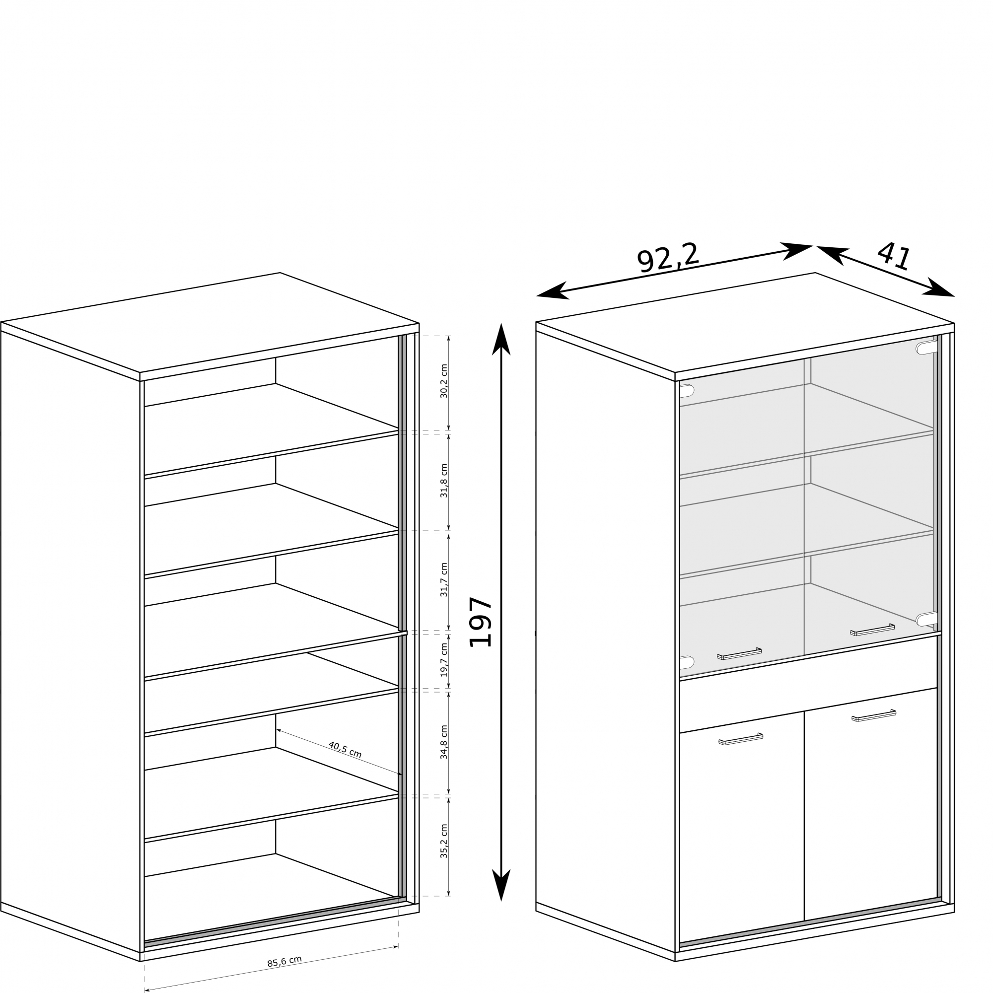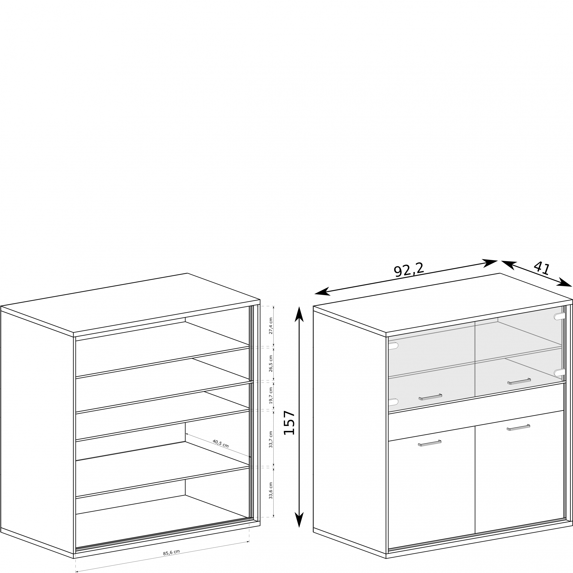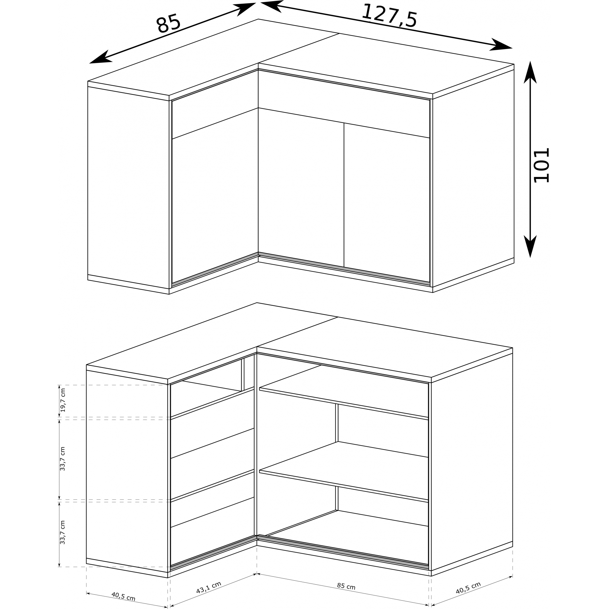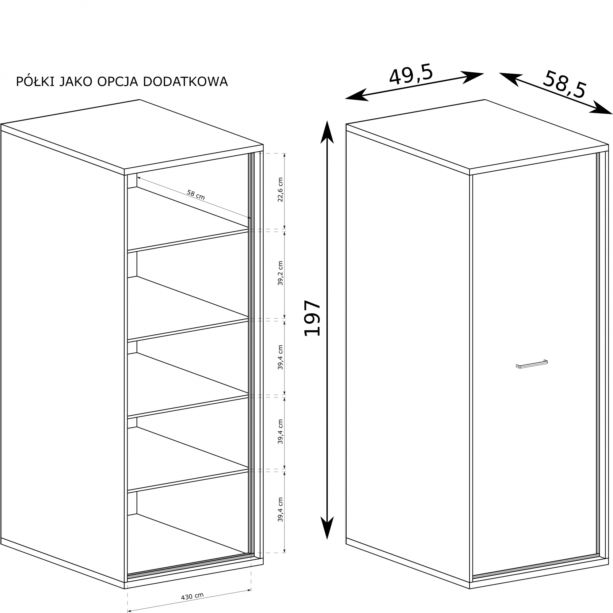 konfigurowalny Mebel dostępny w komplecie z niskimi lub z wysokimi nóżkami. Wysokość całkowita z niskimi 103 cm, wysokość całkowita z wysokimi 111 cm.