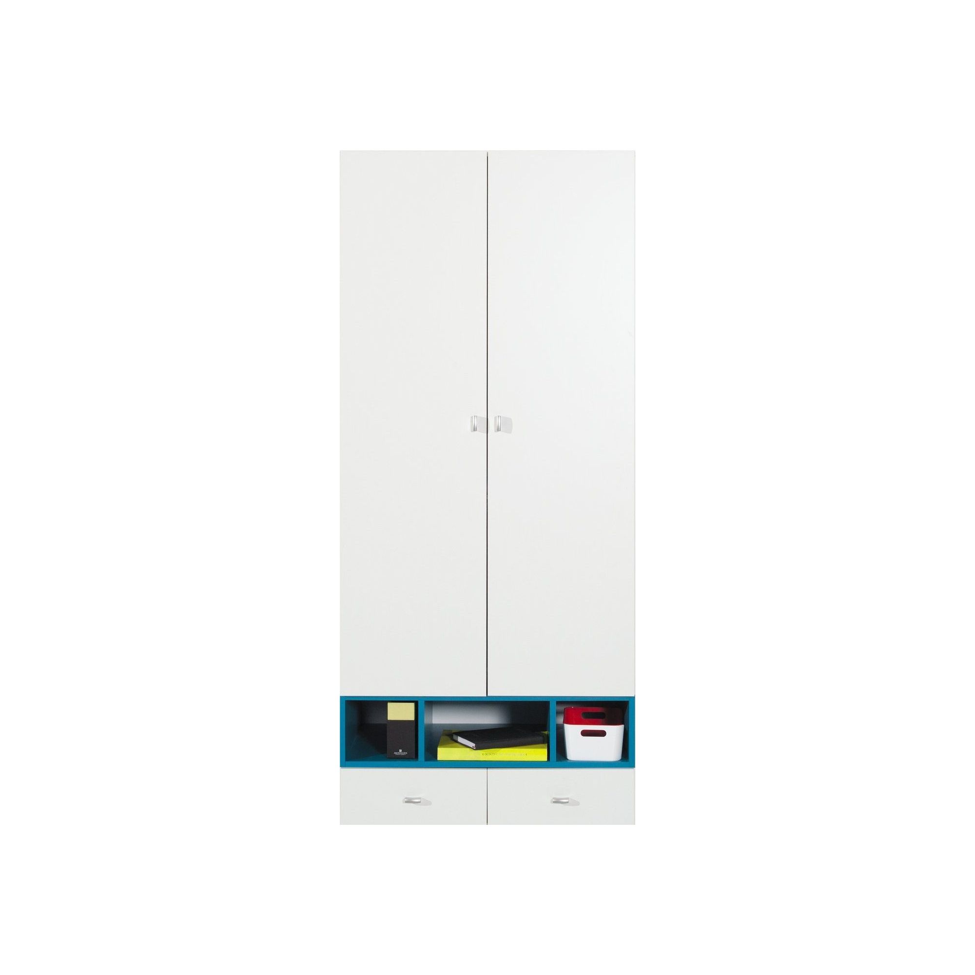 konfigurowalny Nowoczesna komoda wchodząca w skład kolekcji Mobi to designersko zaprojektowany mebel, dzięki któremu aranżacja pokoju Twojego dziecka stanie się ciekawsza. Na tle innych mebli wyróżnia ją designerski kształt. Oryginalnie zaprojektowana górna część bryły składa się z otwartych wnęki, które dają możliwość wyeksponowania kolekcji ulubionych zabawek, płyt czy innych drobiazgów. Poniżej znajduje się smukła szafka i dwie pojemne szuflady. Ta przestrzeń pozwoli na uporządkowanie znacznej części znajdujących się w pokoju rzeczy, od ubrań po akcesoria szkolne. Nietypowy kształt komody zestawiono z modną kolorystyką. Ponadczasową biel możesz połączyć z turkusem lub żółcią, co pozwoli Ci na dopasowanie mebla do wystroju wnętrza przeznaczonego zarówno dla przedszkolaka, jak i nastolatka. Komodę wykonano z najwyższej jakości materiałów i komponentów, z dużą dbałością o najmniejszy detal. To staje się gwarancją bezpieczeństwa oraz komfortowego użytkowania przez wiele lat.