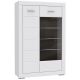 Biała witryna o prostej, geometrycznej formie idealnie wpasuje się w minimalistyczny wystrój salonu lub jadalni. Model z kolekcji Snow przyciąga wzrok modnym, matowym dekorem, oraz poziomymi frezowaniami frontu. Drzwiczki zostały obsadzone pomiędzy pogrubionymi, bocznymi i górnymi listwami, a do podświetlenia szklanych półek zastosowano niebieskie światło, które doskonale podkreśla ich linię. Za zabudowanym frontem znajdziesz cztery pełne półki, natomiast za witryną trzy szklane.
