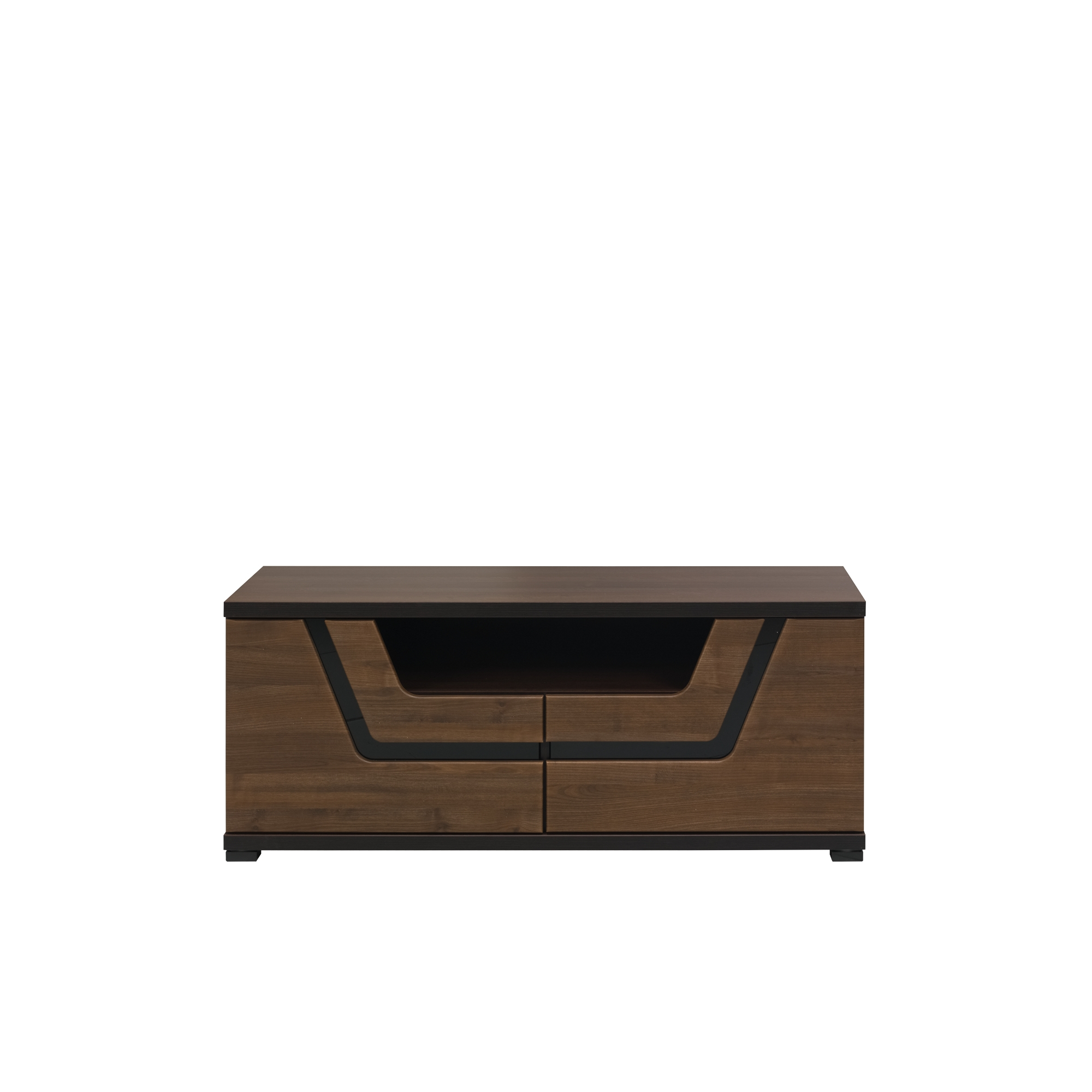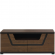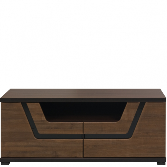 Jednym z elementów wyposażenia salonu jest szafka RTV. Dobrze, gdy posiada półkę na sprzęt elektroniczny oraz miejsce do przechowywania drobiazgów. Szafka RTV z kolekcji Tes to mebel funkcjonalny i oryginalny. Dostępna w modnej, orzechowej kolorystyce, została wyposażona w szeroką, umieszczoną pod blatem wnękę oraz dwoje drzwiczek. W tylnej ściance wnęki znajdziesz dwa otwory do odprowadzenia kabli. Prostą bryłę mebla przełamuje pogrubiony blat oraz dekoracyjna aplikacja z czarnego szkła znajdująca się na froncie.