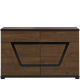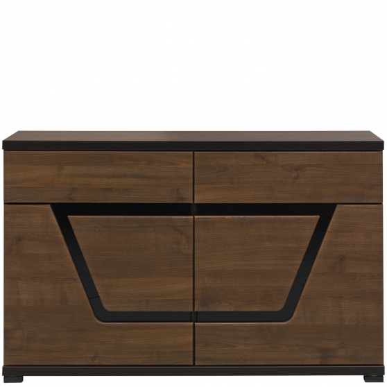Szeroka komoda z kolekcji Tes odznacza się prostym kształtem i oryginalną ozdobną wstawką z czarnego szkła. Została wyposażona w troje drzwiczek, za którymi znajdziesz półki, oraz w dwie szuflady. System push-to-open gwarantuje komfort użytkowania i wygodne otwieranie. Mebel posiada nóżki z możliwością regulacji oraz pogrubiony blat. Komoda dostępna w modnej, orzechowej kolorystyce.