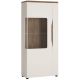 Wspaniały, utrzymany w nowoczesnym stylu kredens z kolekcji Toledo, to idealna propozycja do nowoczesnego salonu lub jadalni. Mebel posiada wysokie pojedyncze drzwiczki z przeszkleniem Umożliwia to przeszklenie, gdzie ustawimy ozdoby, których osobliwy wygląd podkreślimy dodatkowo zakupionym oświetleniem. Natomiast na półkach zamkniętych pełnym frontem z łatwością pomieszczą się rzeczy, które chcemy mieć w pomieszczeni w zasięgu ręki. Atutem kredensu jest również jej wygląd i kolorystyka. Prosta forma mebla połączona została z najmodniejszymi kolorami, a tworzą je połyskliwa Biel Alpejska i jasny Dąb Stirling. Charakterystyczne jest również wycięcie na froncie, którym zastąpiono tradycyjne uchwyty, a które dodaje meblowi elegancji i podkreśla jej nowoczesny styl. Nie bez znaczenia jest tu solidne wykonanie i materiały, których zwiększona trwałość i odporność stają się gwarancją wieloletniego korzystania z mebla. Witryna, dzięki wyposażeniu w system cichego domykania zapewnia użytkownikowi codzienny komfort i bezpieczeństwo.