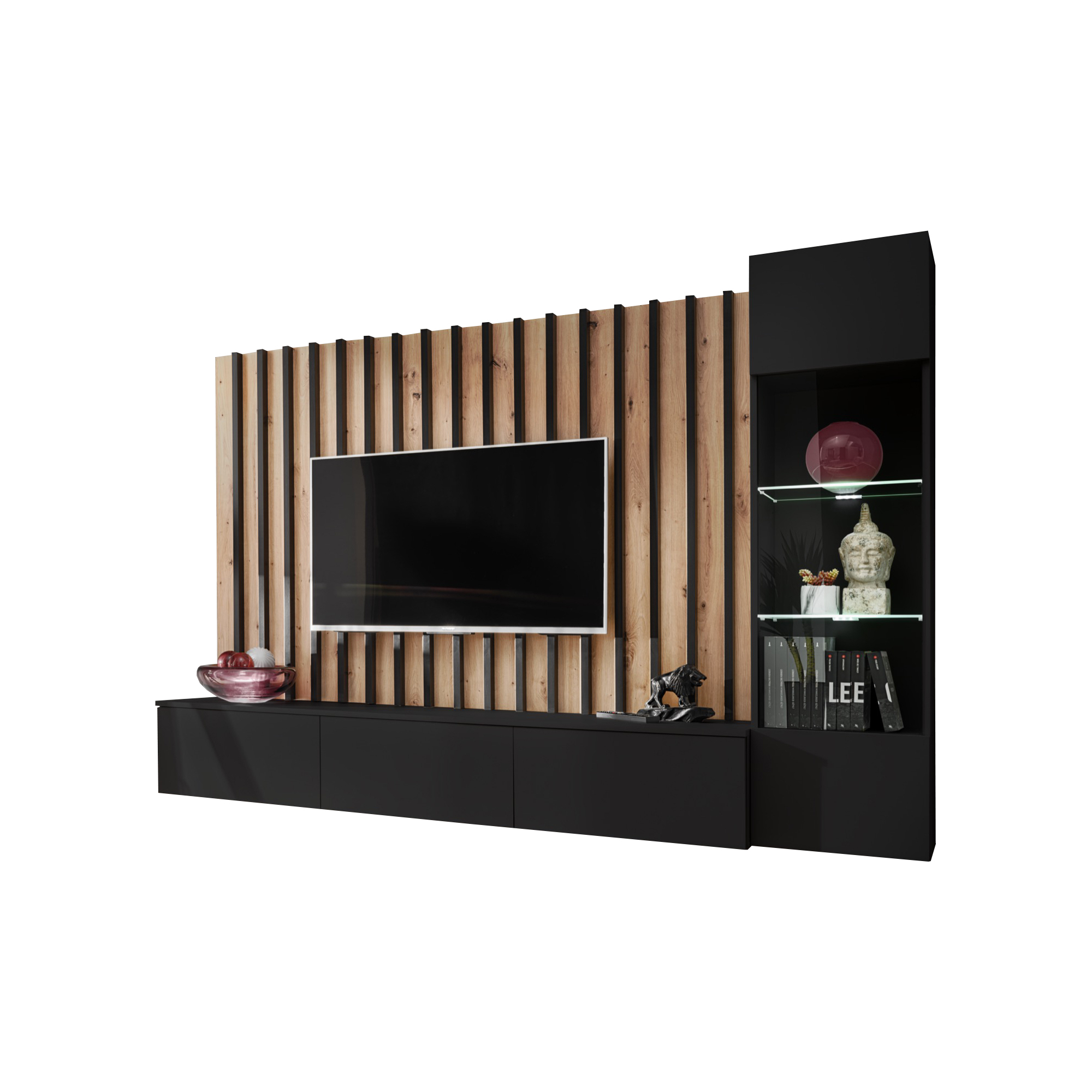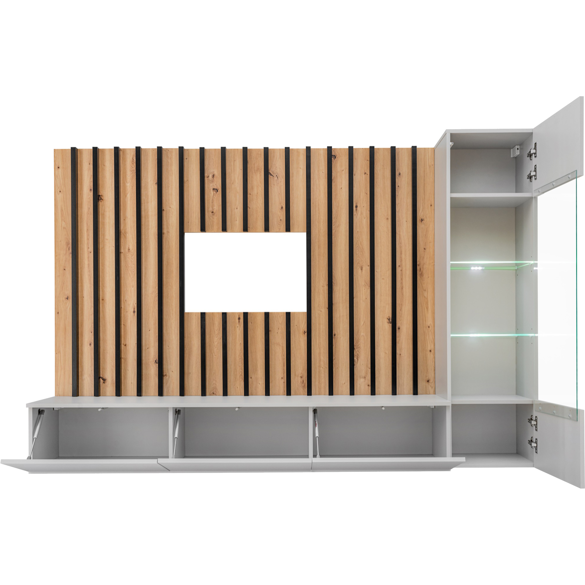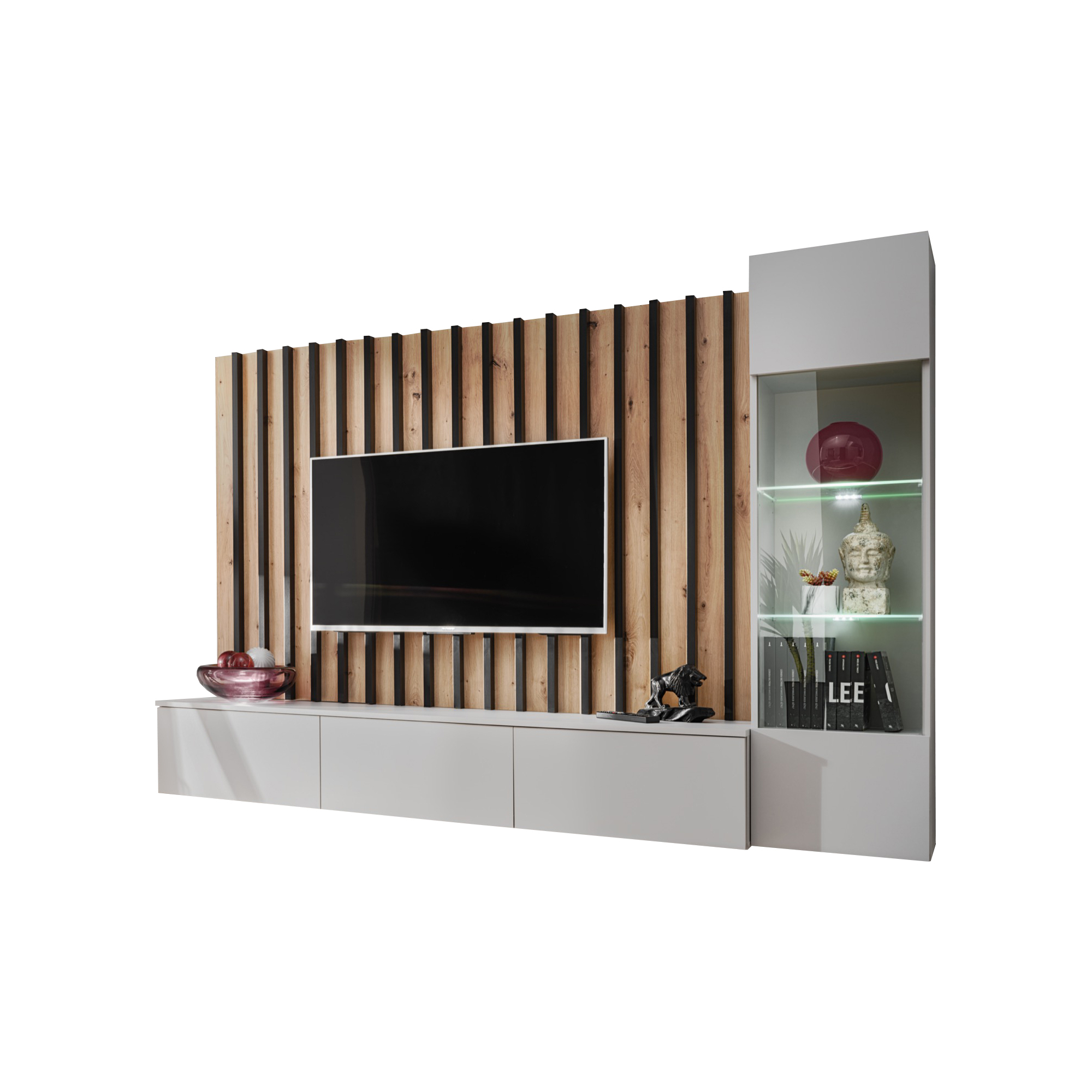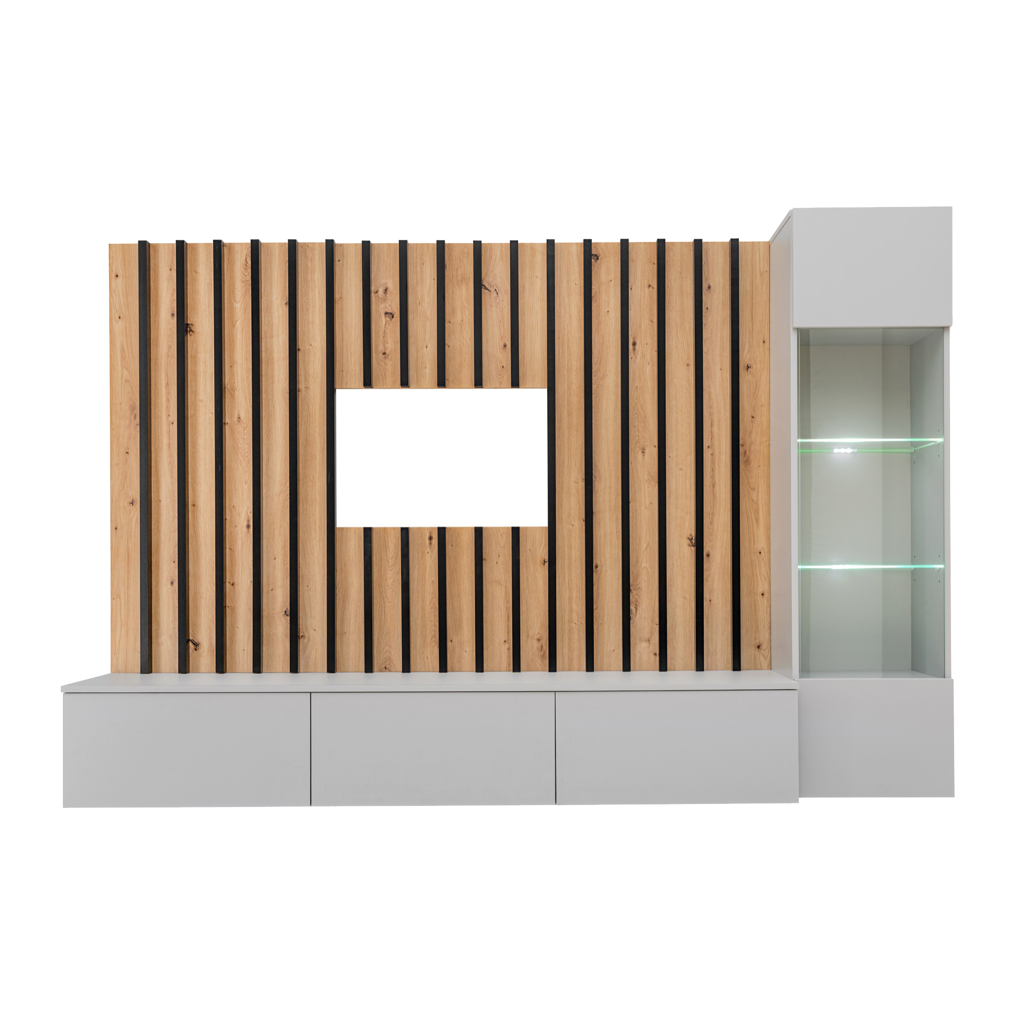 Meblościanka VERTI od ASM Meble to nowoczesne, funkcjonalne rozwiązanie dla osób poszukujących eleganckiego wyposażenia salonu. Cechuje się minimalistycznym designem z prostymi liniami, który doskonale wpisuje się w różne style aranżacji wnętrz. Zestaw oferuje kombinację zamkniętych szafek oraz przestrzeni otwartych, dzięki czemu można wygodnie przechowywać zarówno przedmioty codziennego użytku, jak i wyeksponować elementy dekoracyjne.