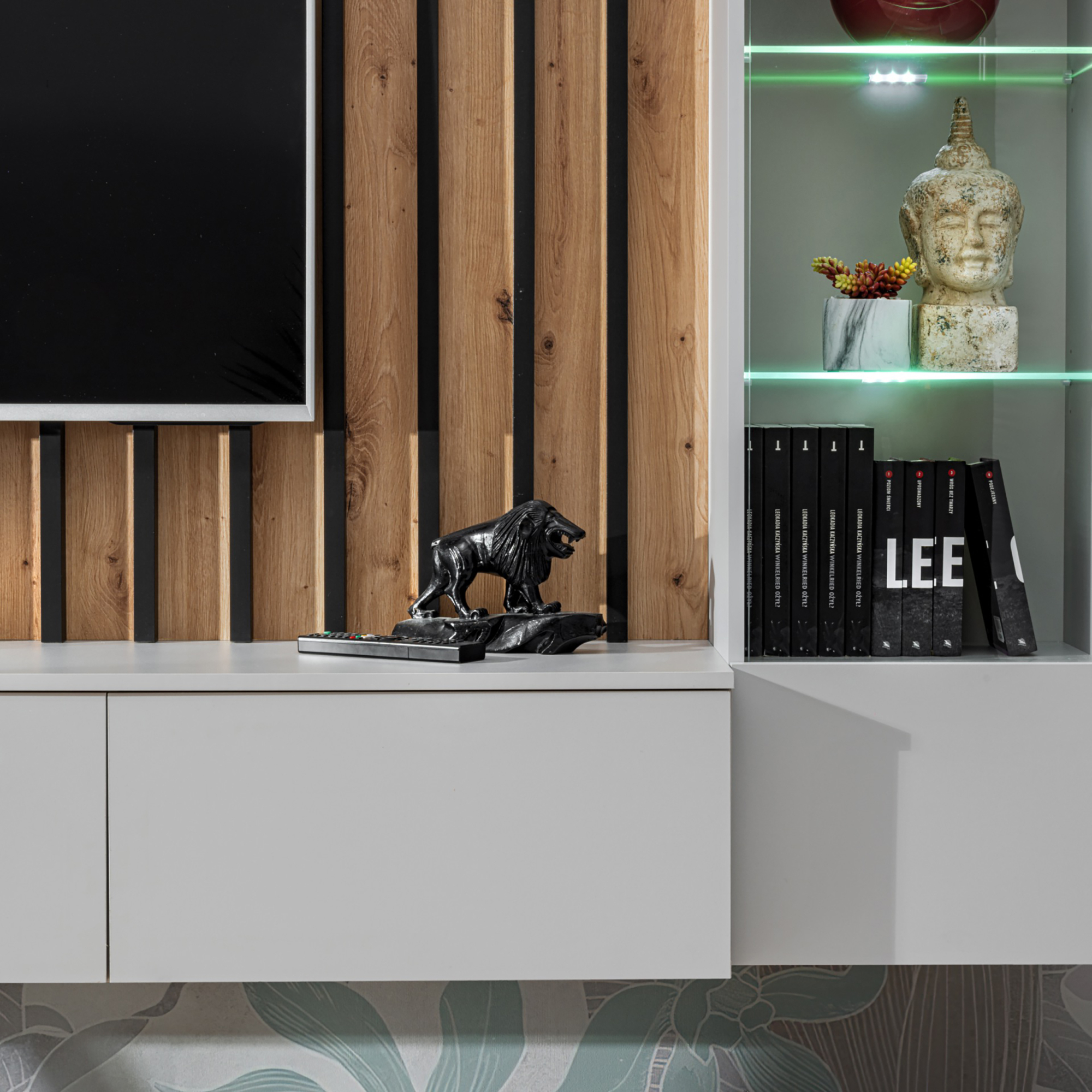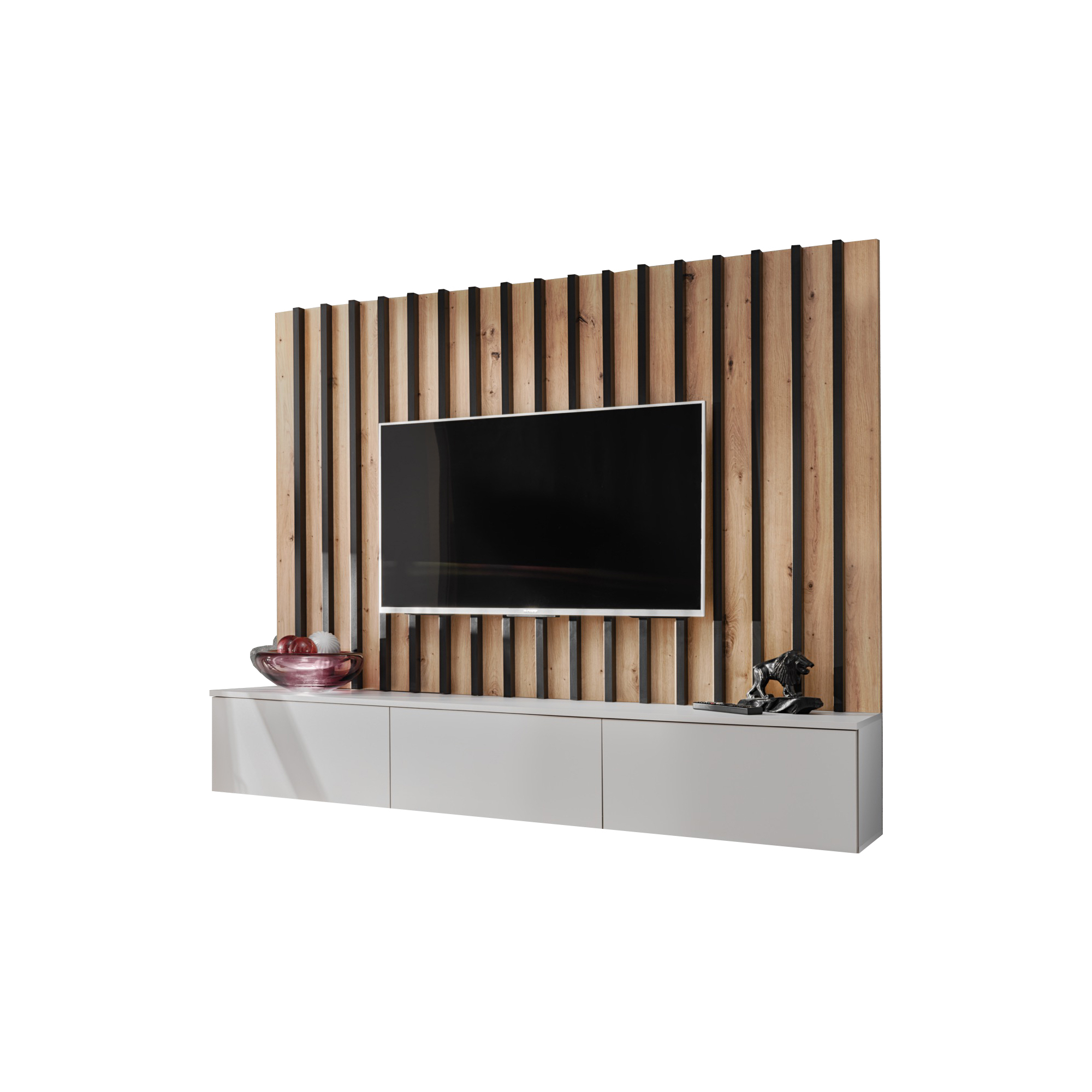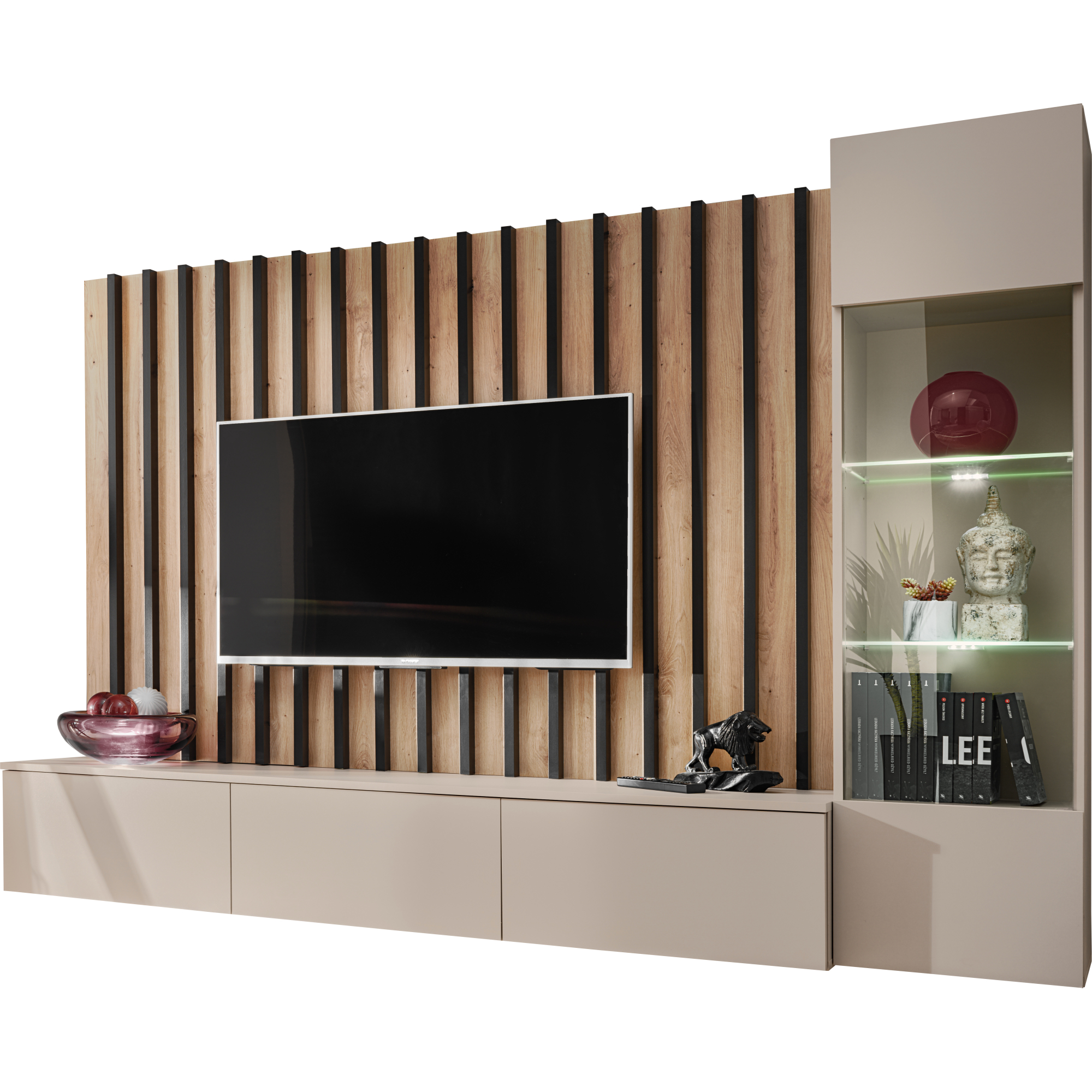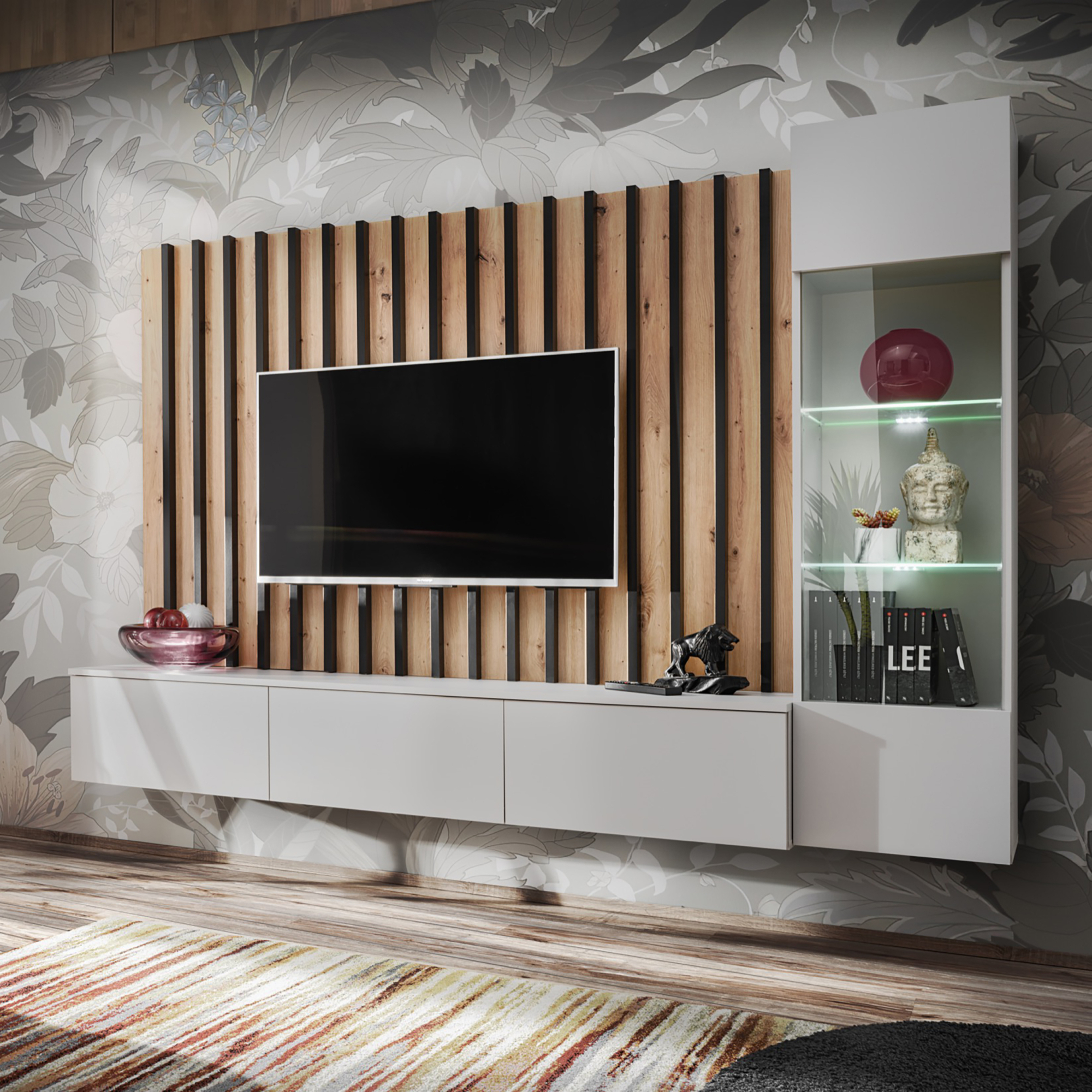 Meblościanka VERTI od ASM Meble to nowoczesne, funkcjonalne rozwiązanie dla osób poszukujących eleganckiego wyposażenia salonu. Cechuje się minimalistycznym designem z prostymi liniami, który doskonale wpisuje się w różne style aranżacji wnętrz. Zestaw oferuje kombinację zamkniętych szafek oraz przestrzeni otwartych, dzięki czemu można wygodnie przechowywać zarówno przedmioty codziennego użytku, jak i wyeksponować elementy dekoracyjne.