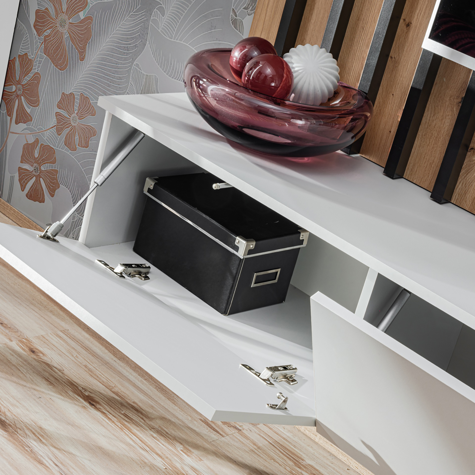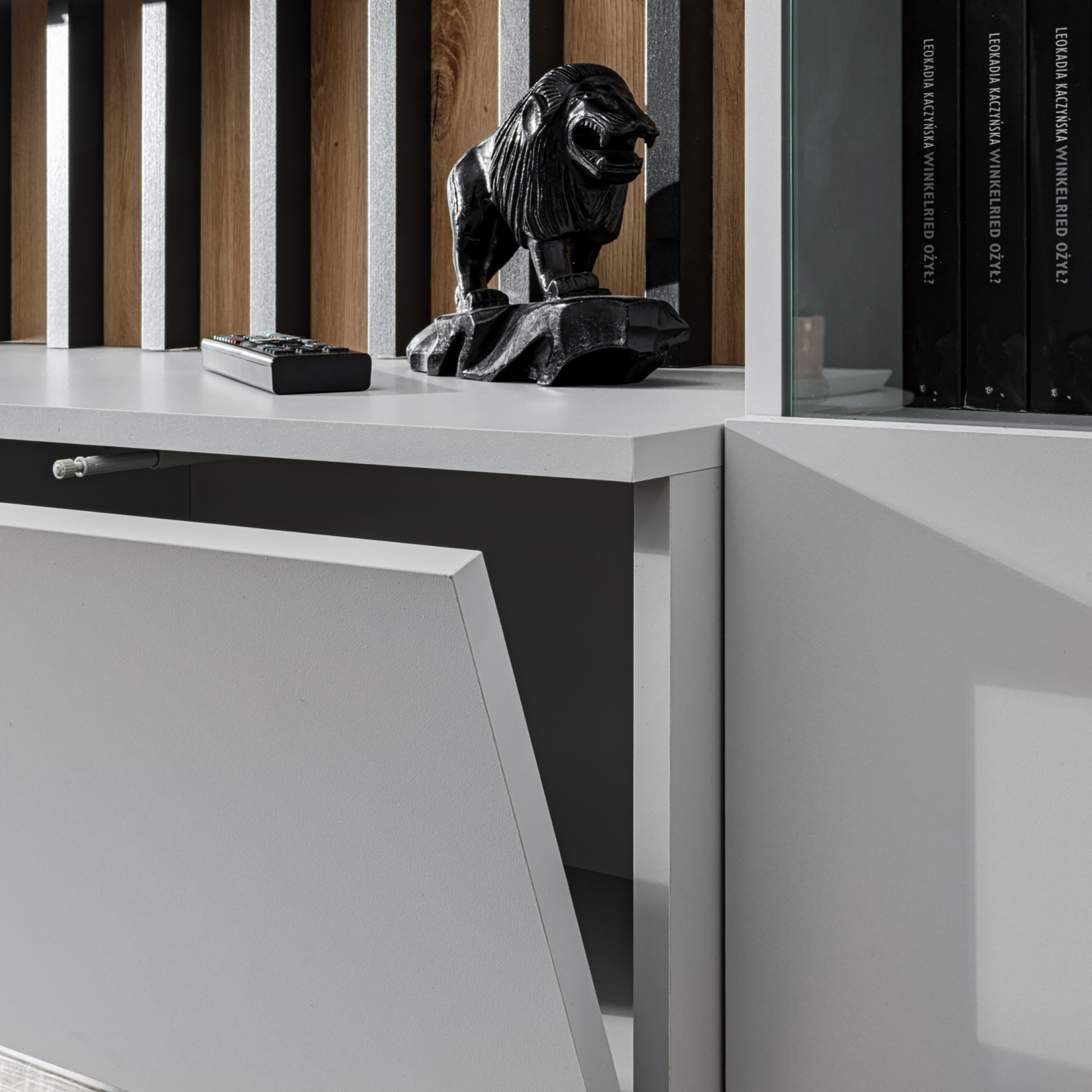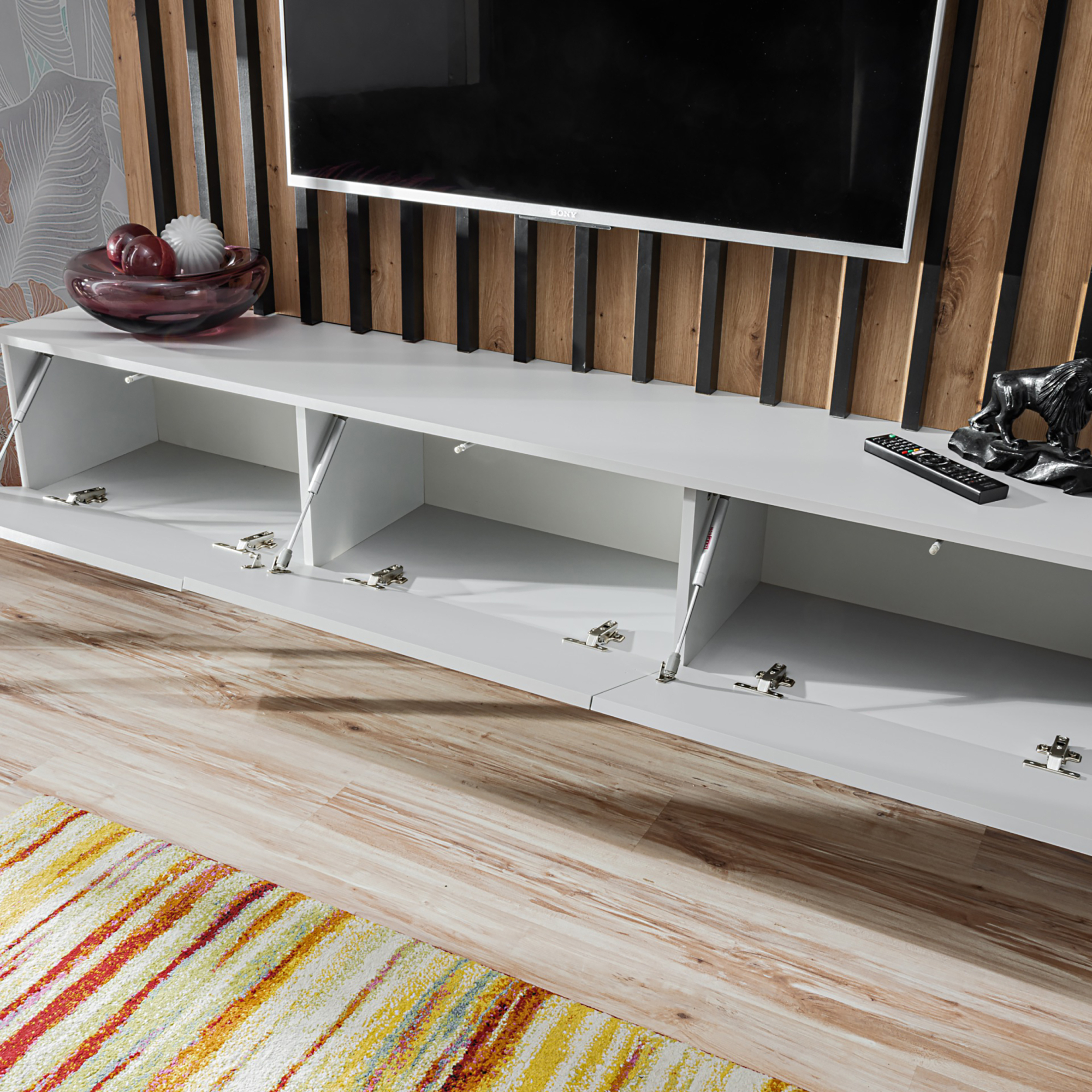 W meblościance VERTI zastosowano różne kolory i faktury, co dodaje jej charakteru i uniwersalności. Solidne wykonanie gwarantuje trwałość, a praktyczne rozwiązania, takie jak oświetlenie LED czy przestronne półki, zapewniają komfort użytkowania.