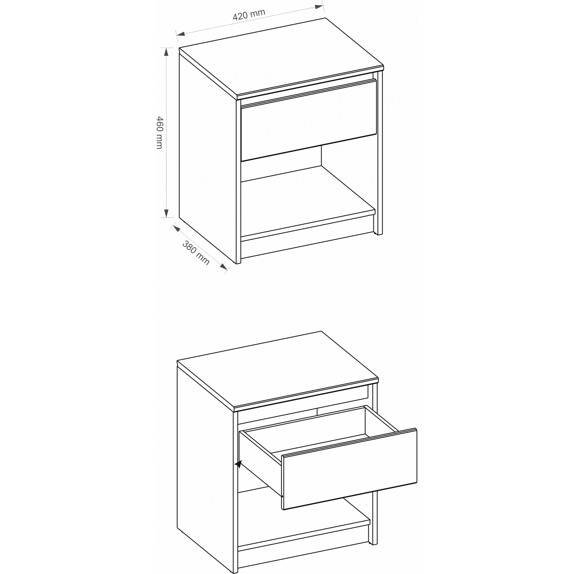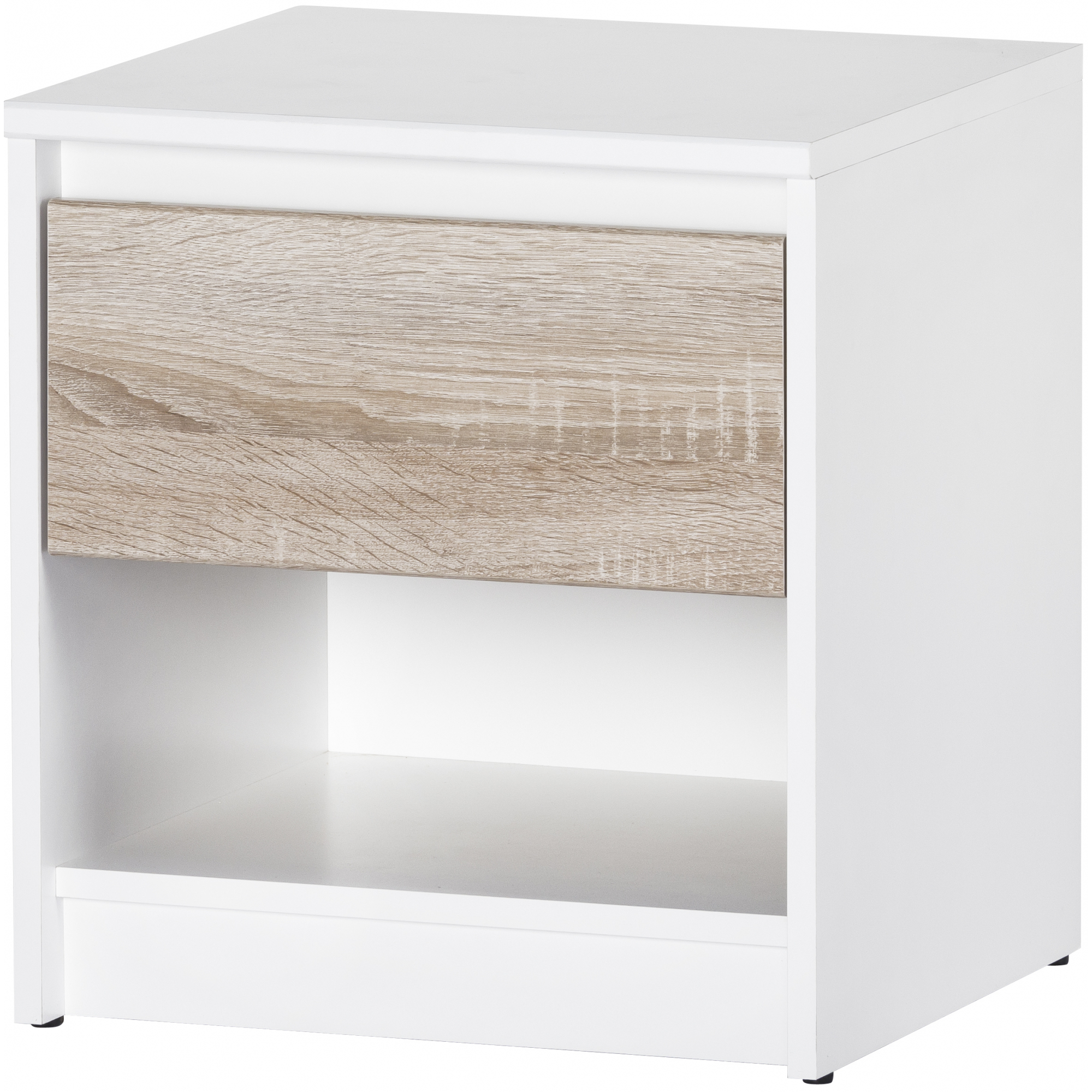Stoliki nocne to niewielkie, ale ważne elementy wystroju sypialni. Szafka nocna Wenecja jest stylowa i funkcjonalna. Wykonana z foliowanej płyty meblowej w kolorze białym posiada jedną szufladę. Jej front, z płyty oklejonej drewnopodobną folią finish, utrzymany został w naturalnym wybarwieniu drewna dąb sonoma. Pod szufladą znajdziesz wnękę tworzącą półkę. Wystarczająco dużo miejsca na schowanie drobiazgów, których będziesz potrzebować podczas odpoczynku, czy ustawienie lampki nocnej.
