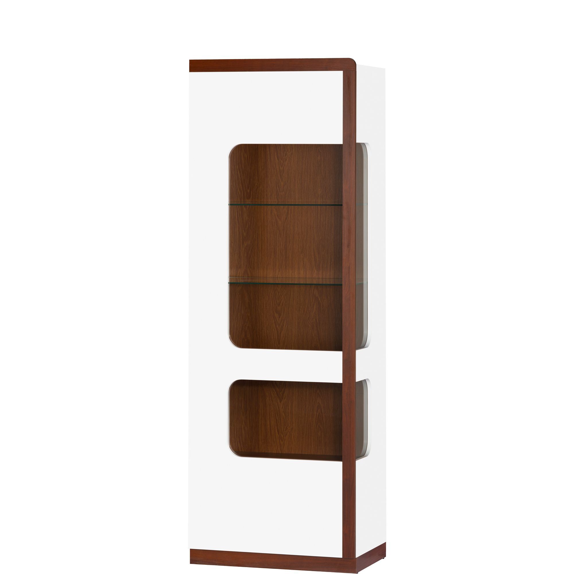 Wysoka, pojedyncza witryna Malta to mebel oryginalny i nowoczesny. Bezuchwytowy front, wyposażony w system otwierania dotykowego, został przeszklony w górnej i dolnej części. Mebel w całości wykonano z meblowej płyty laminowanej w kolorze białego połysku z ozdobną zaobloną listwą o wybarwieniu orzech azurro. Wnętrze mebla również utrzymane w orzechowej kolorystyce, z wyraźnym rysunkiem naturalnego usłojenia drewna. Wewnątrz znajdziesz 3 pełne i 2 szklane półki. Wyjątkową linię mebla podkreślisz montując podwieńcowe oświetlenie LED dostępne w opcji dodatkowej (za dopłatą).