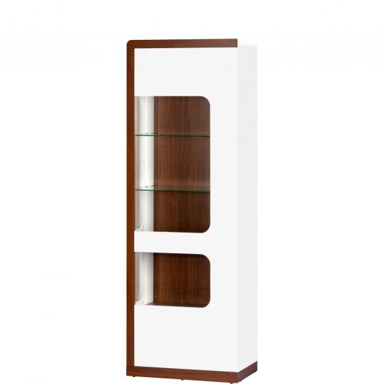 Wysoka, pojedyncza witryna Malta to mebel oryginalny i nowoczesny. Bezuchwytowy front, wyposażony w system otwierania dotykowego, został przeszklony w górnej i dolnej części. Mebel w całości wykonano z meblowej płyty laminowanej w kolorze białego połysku z ozdobną zaobloną listwą o wybarwieniu orzech azurro. Wnętrze mebla również utrzymane w orzechowej kolorystyce, z wyraźnym rysunkiem naturalnego usłojenia drewna. Wewnątrz znajdziesz 3 pełne i 2 szklane półki. Wyjątkową linię mebla podkreślisz montując podwieńcowe oświetlenie LED dostępne w opcji dodatkowej (za dopłatą).