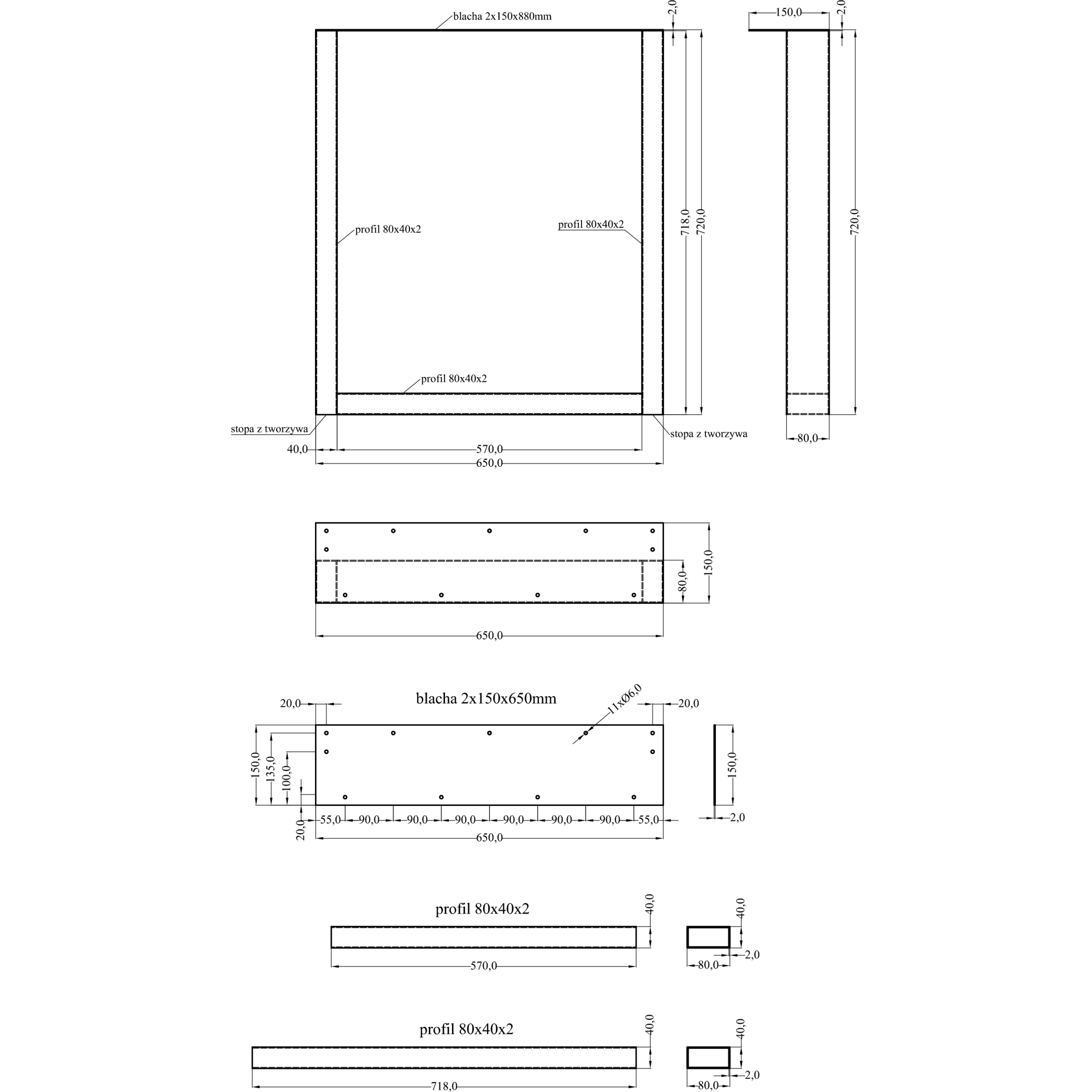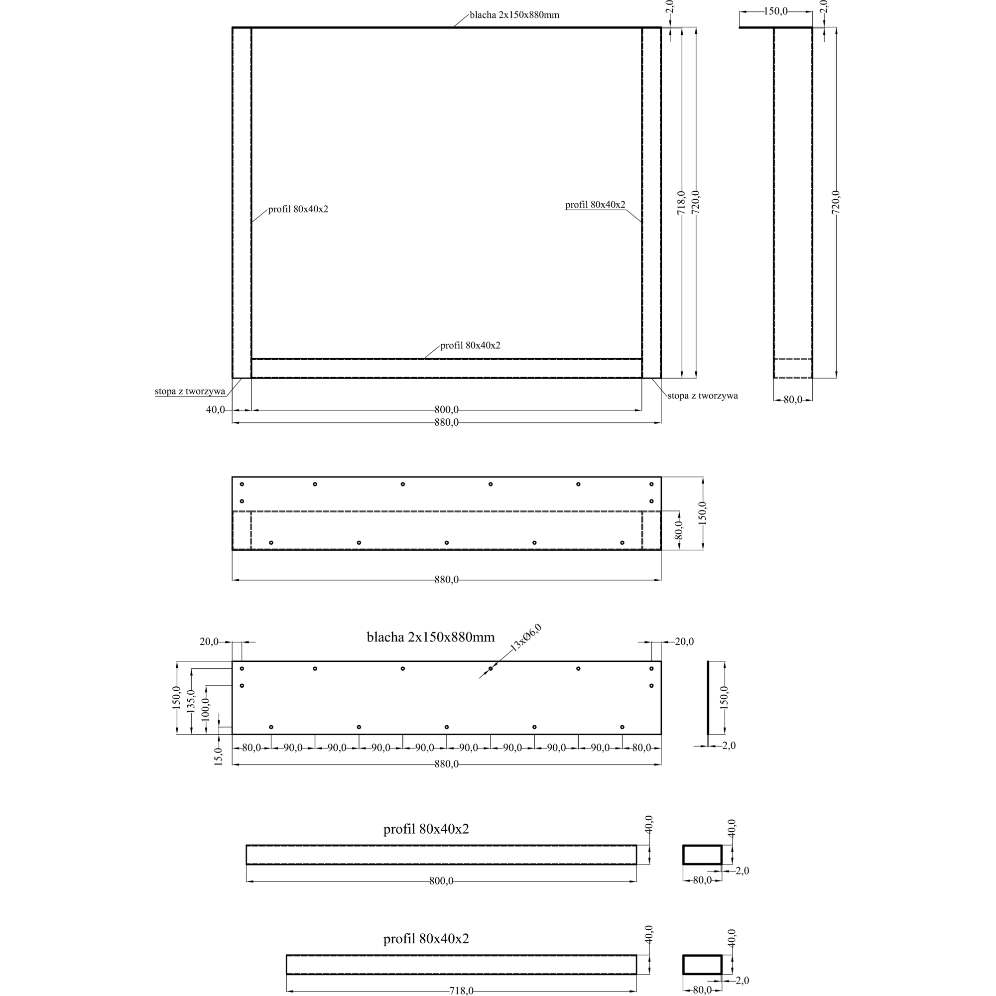 UWAGA!! Istnieje możliwość ustawienia nóg w dowolnej odległości, blat nie jest naznaczony pod katem otworów montażowych.