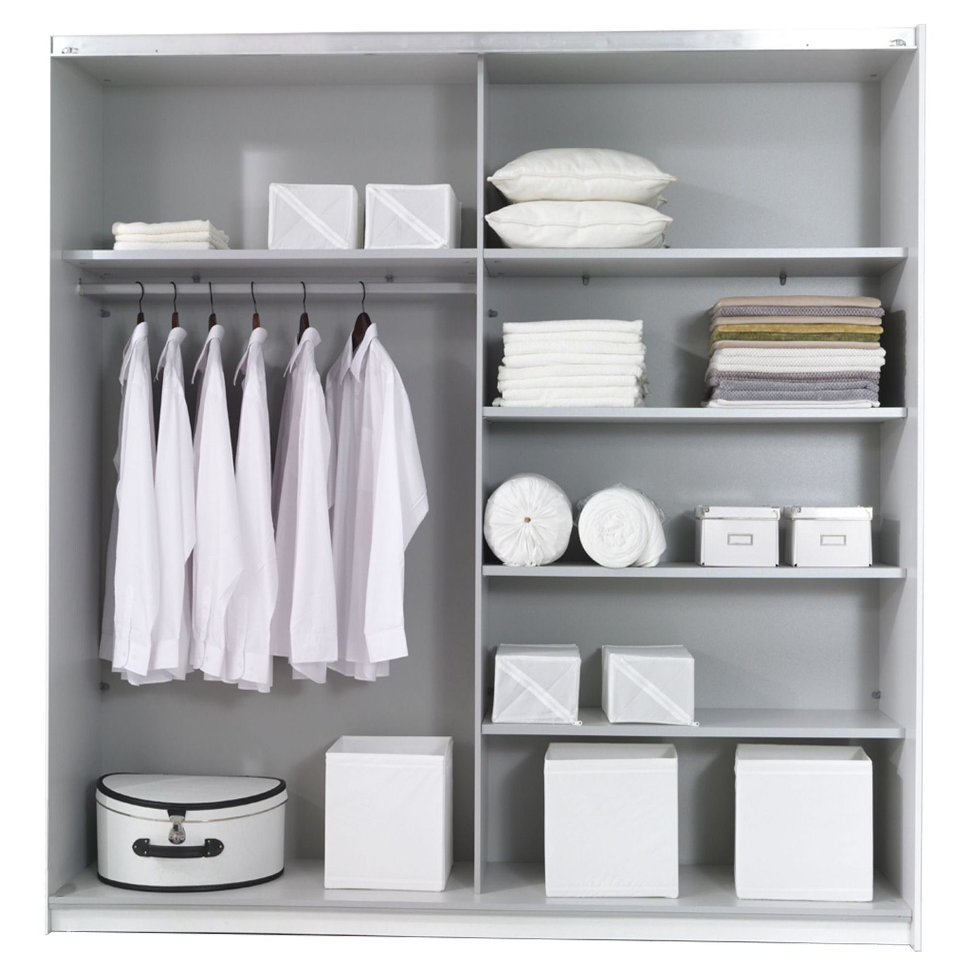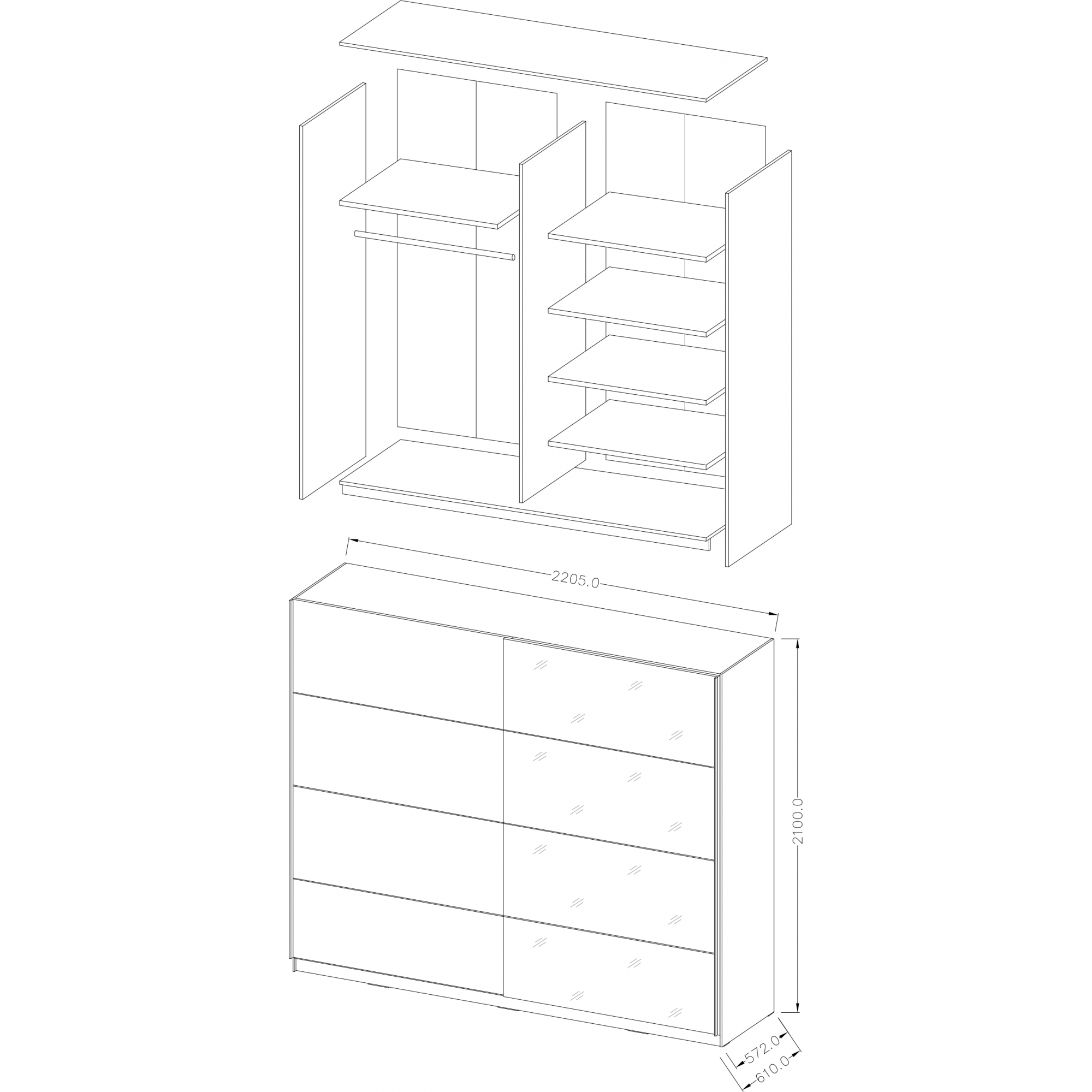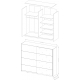 Dwudrzwiowa, przesuwna szafa Beta została wykonana z wysokogatunkowego laminatu w modnym czarnym kolorze. Czarny korpus i front uzupełniono poziomą lustrzaną wstawką. Wnętrze mebla zostało podzielone na 2 symetryczne względem siebie przestrzenie pokryte folią w neutralnym kolorze alu rayas. W lewej umieszczono stała półkę konstrukcyjną, a w prawej 1 stałą i 3 ruchoma półki. Jako dodatkowe wyposażenie proponujemy dwa różnej wielkości kontenerki do szafy Beta.