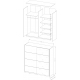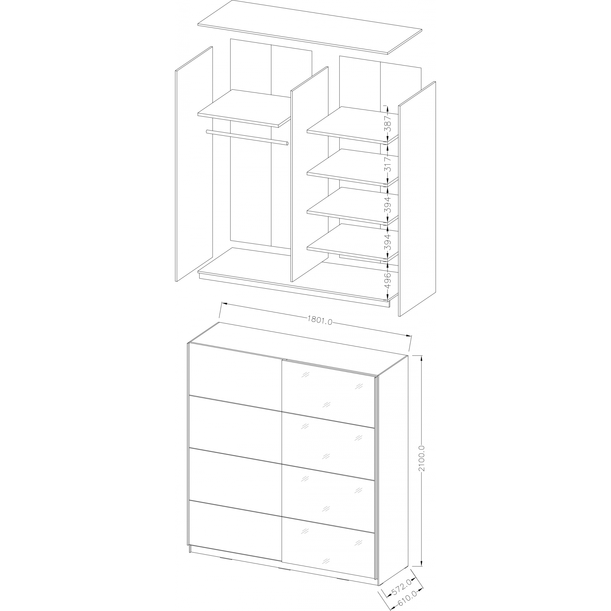 Dwudrzwiowa, przesuwna szafa Beta została wykonana z wysokogatunkowego laminatu w modnym czarnym kolorze. Czarny korpus i front uzupełniono poziomą lustrzaną wstawką. Wnętrze mebla zostało podzielone na 2 symetryczne względem siebie przestrzenie pokryte folią w neutralnym kolorze alu rayas. W lewej umieszczono stała półkę konstrukcyjną, a w prawej 1 stałą i 3 ruchoma półki. Jako dodatkowe wyposażenie proponujemy dwa różnej wielkości kontenerki do szafy Beta.