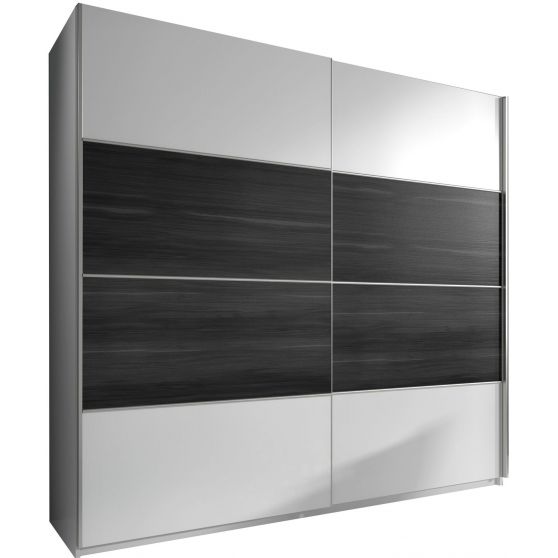 Dwudrzwiowa, przesuwna szafa Beta została wykonana z wysokogatunkowego laminatu łączącego dwa modne kolory. Korpus w kolorze białym zestawiono z umieszczoną na froncie wstawką o wybarwieniu czarnego orzecha i delikatnymi poziomymi frezowaniami. Wnętrze mebla zostało podzielone na 2 symetryczne względem siebie przestrzenie pokryte folią w neutralnym kolorze. W lewej umieszczono stała półkę konstrukcyjną, a w prawej 1 stałą i 3 ruchoma półki. Jako dodatkowe wyposażenie proponujemy dwa różnej wielkości kontenerki do szafy Beta.