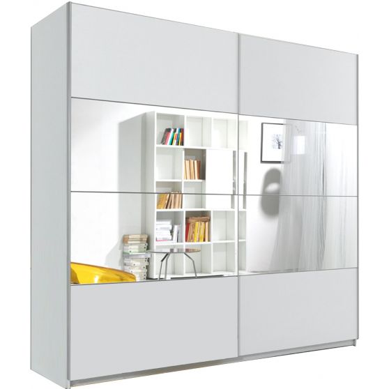 Dwudrzwiowa, przesuwna szafa Beta została wykonana z wysokogatunkowego laminatu. Korpus oraz front w kolorze białym zestawiono z dwoma lustrzanymi panelami i delikatnymi poziomymi frezowaniami. Wnętrze mebla zostało podzielone na 2 symetryczne względem siebie przestrzenie pokryte folią w neutralnym kolorze alu rayas. W lewej umieszczono stała półkę konstrukcyjną, a w prawej 1 stałą i 3 ruchoma półki. Jako dodatkowe wyposażenie proponujemy dwa różnej wielkości kontenerki do szafy Beta.