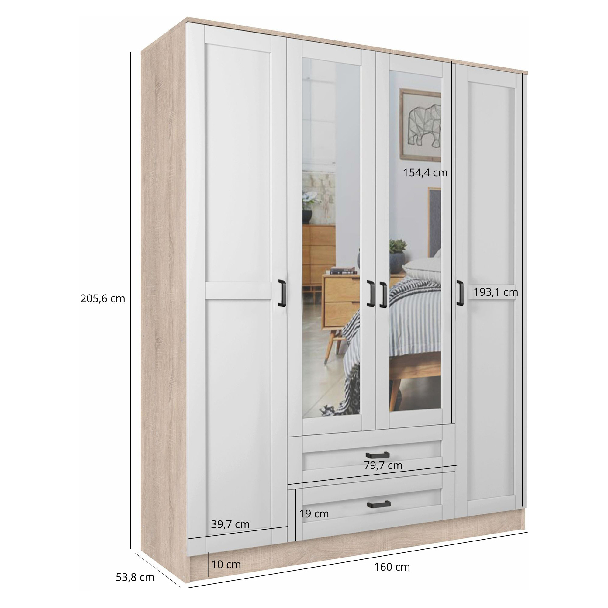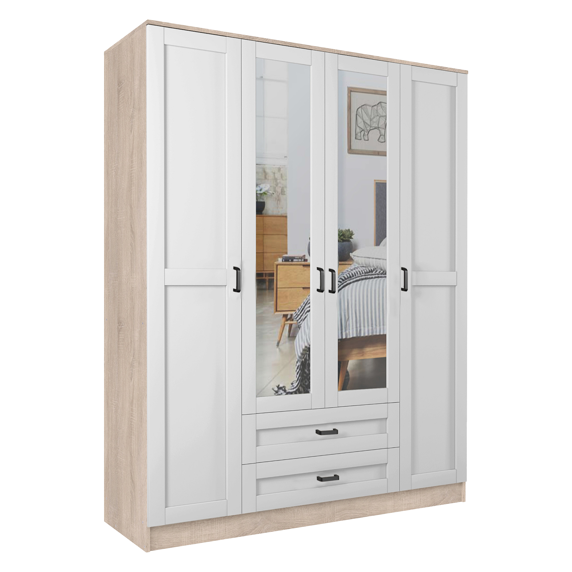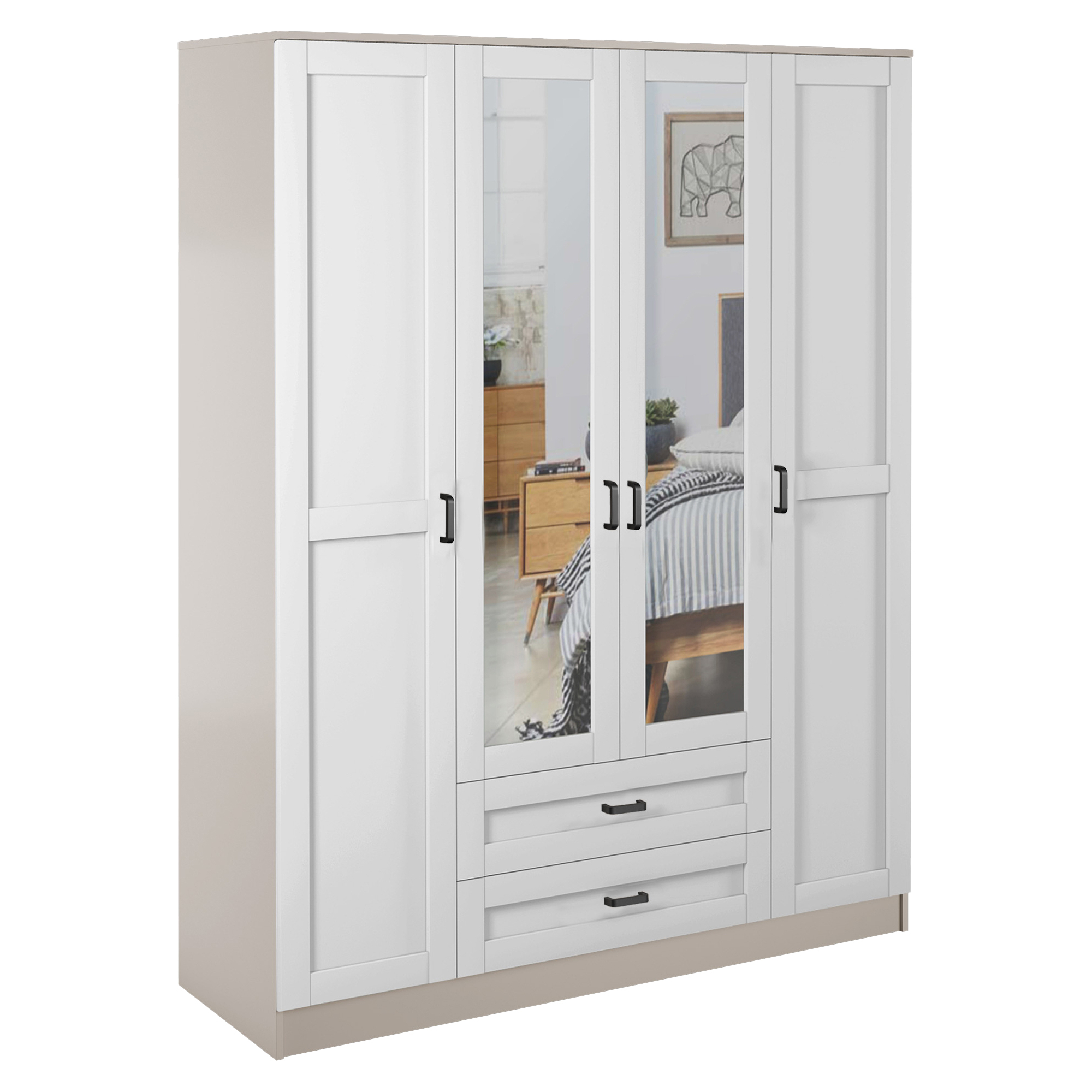 Szafa z lustrem 4-drzwiowa z szufladami KAMI Kaszmir Mat / Biały Mat