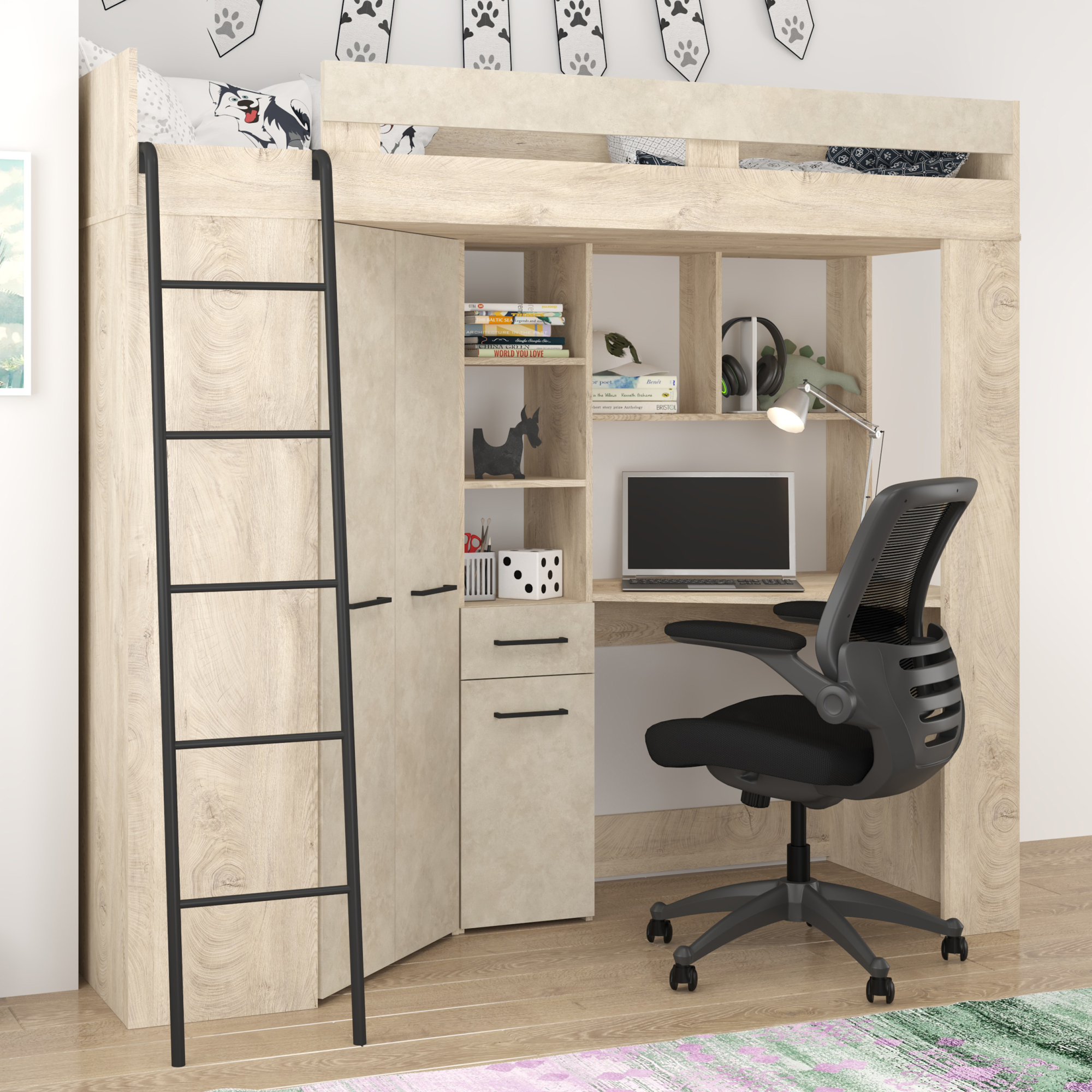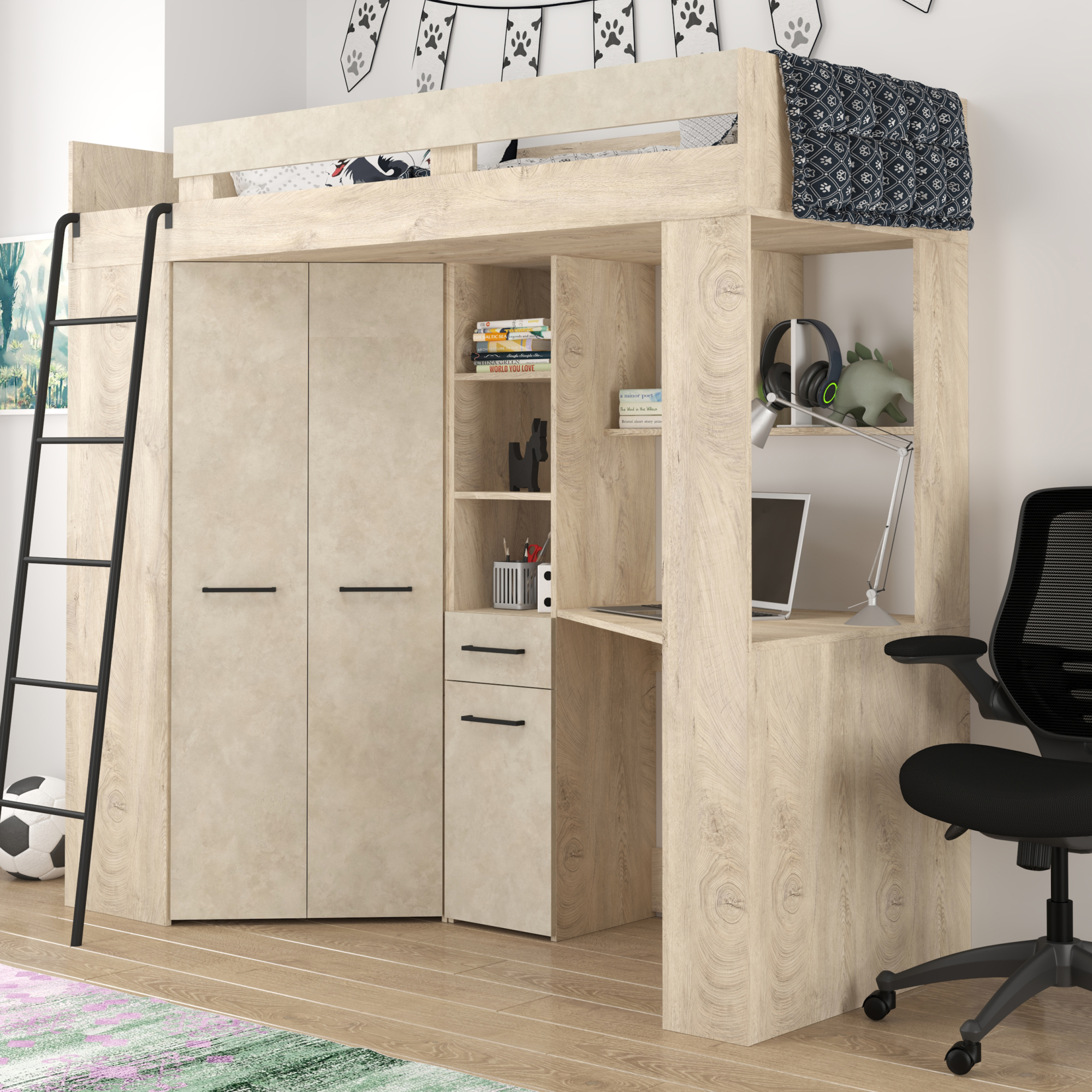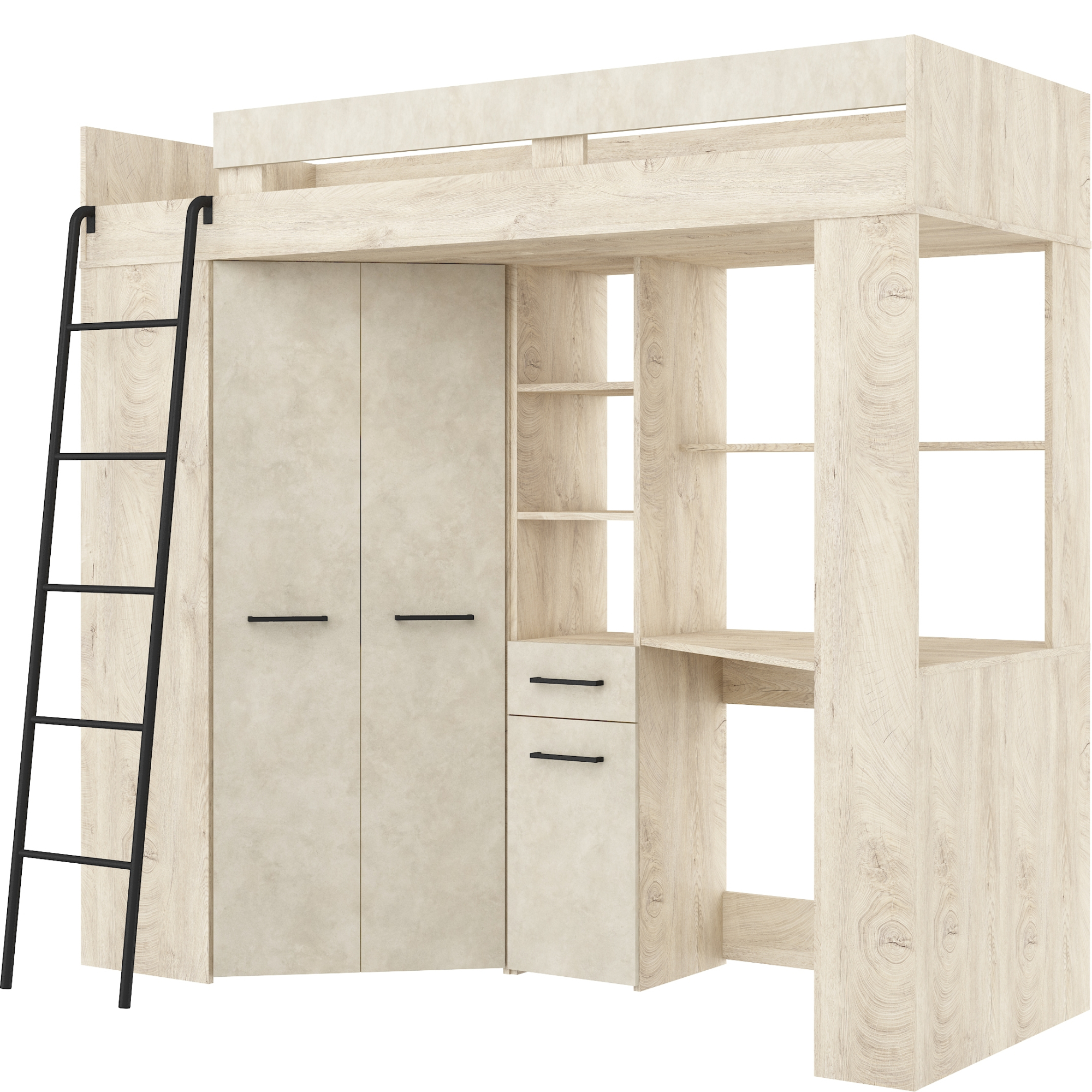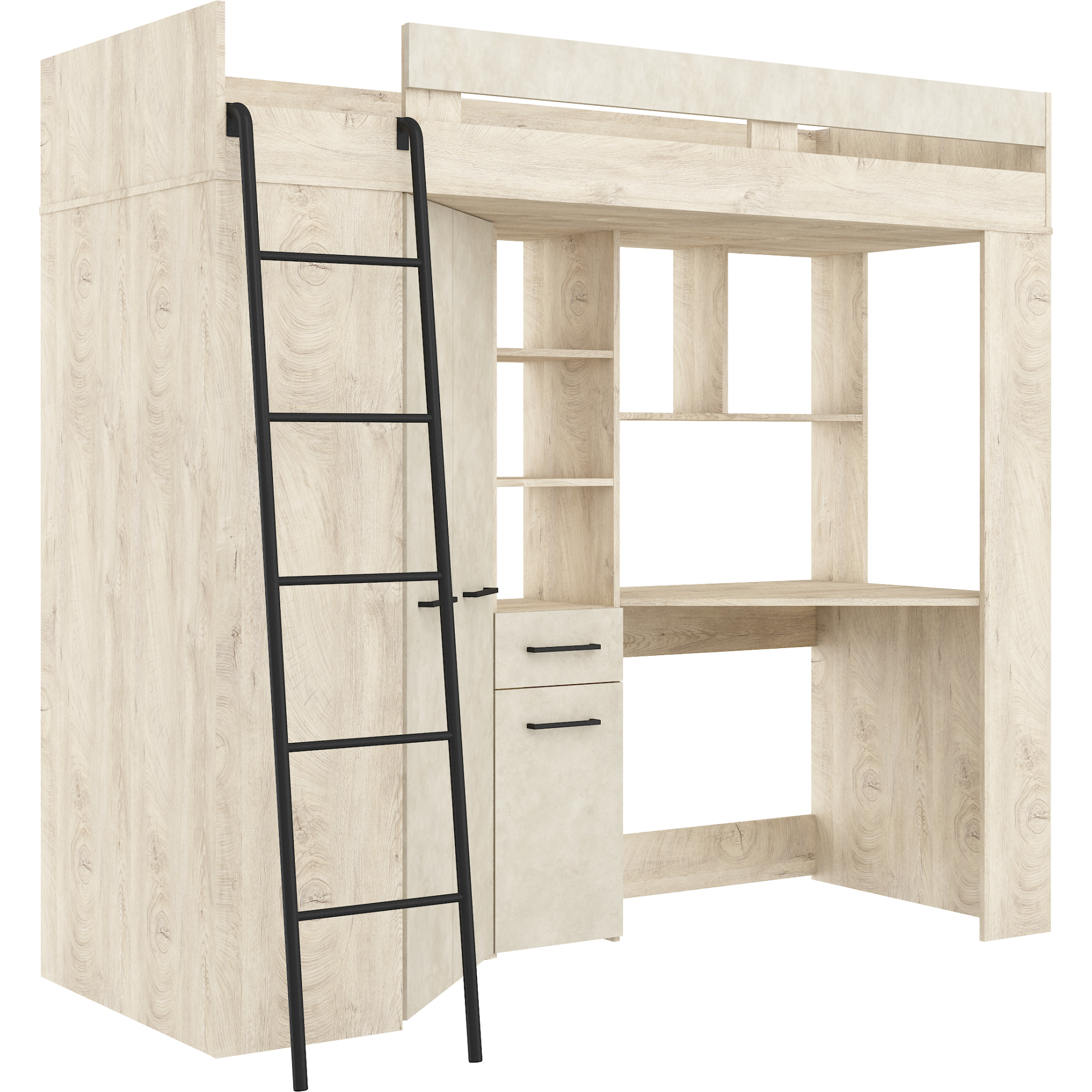 Łóżko piętrowe FLOOR L z biurkiem i szafą Dąb Endgrain / Granada Migdał Podstawowe