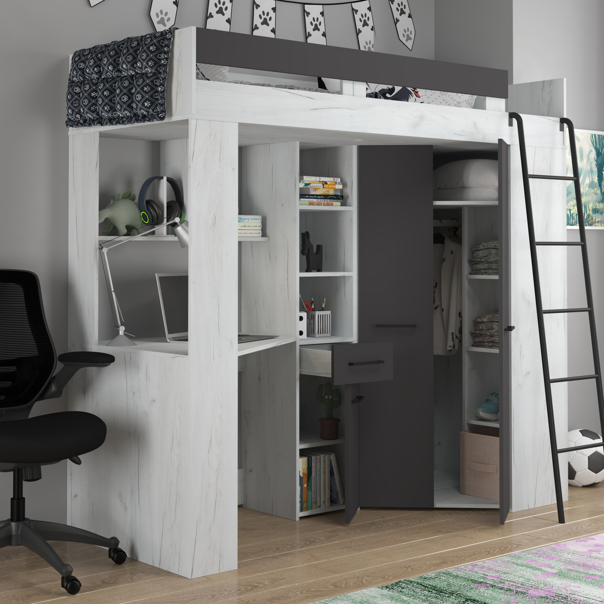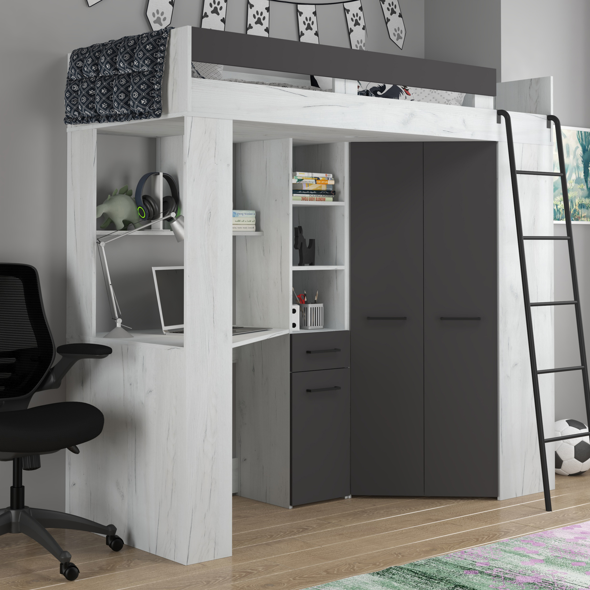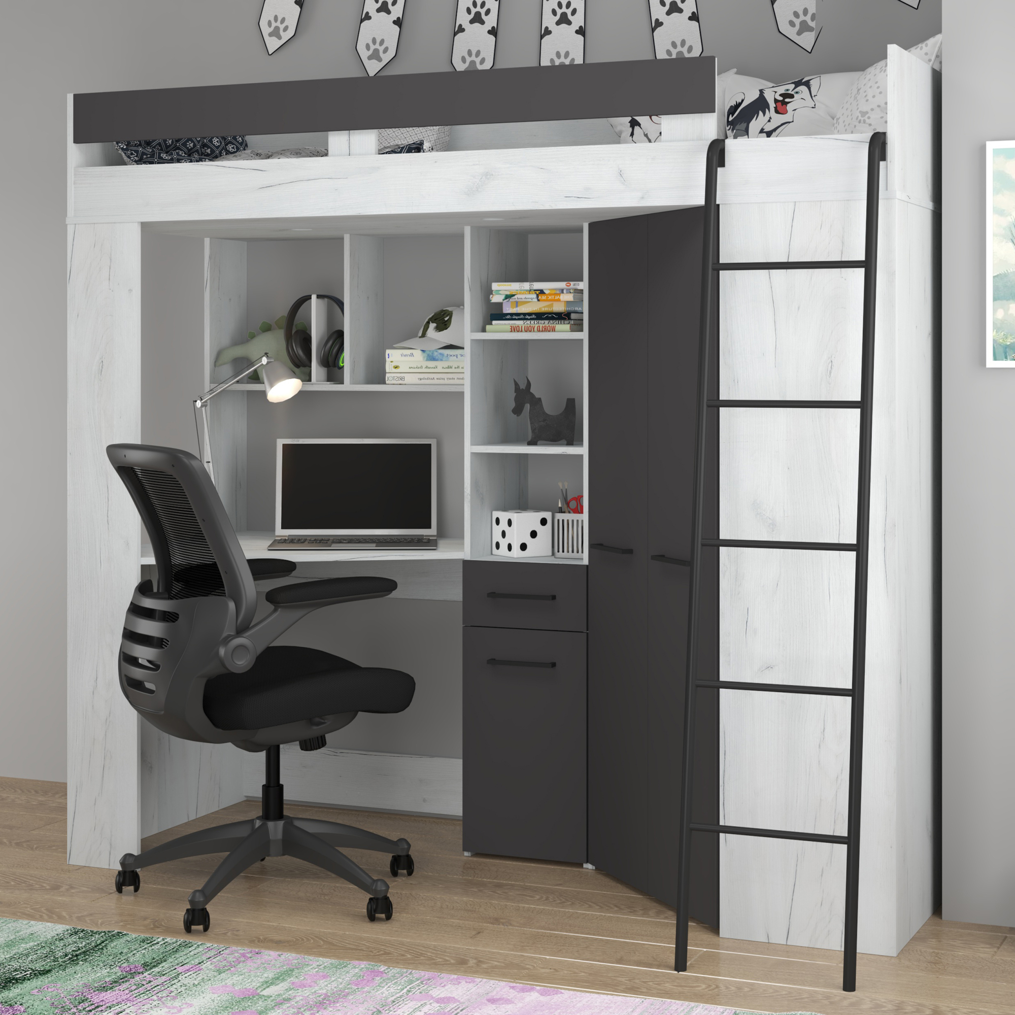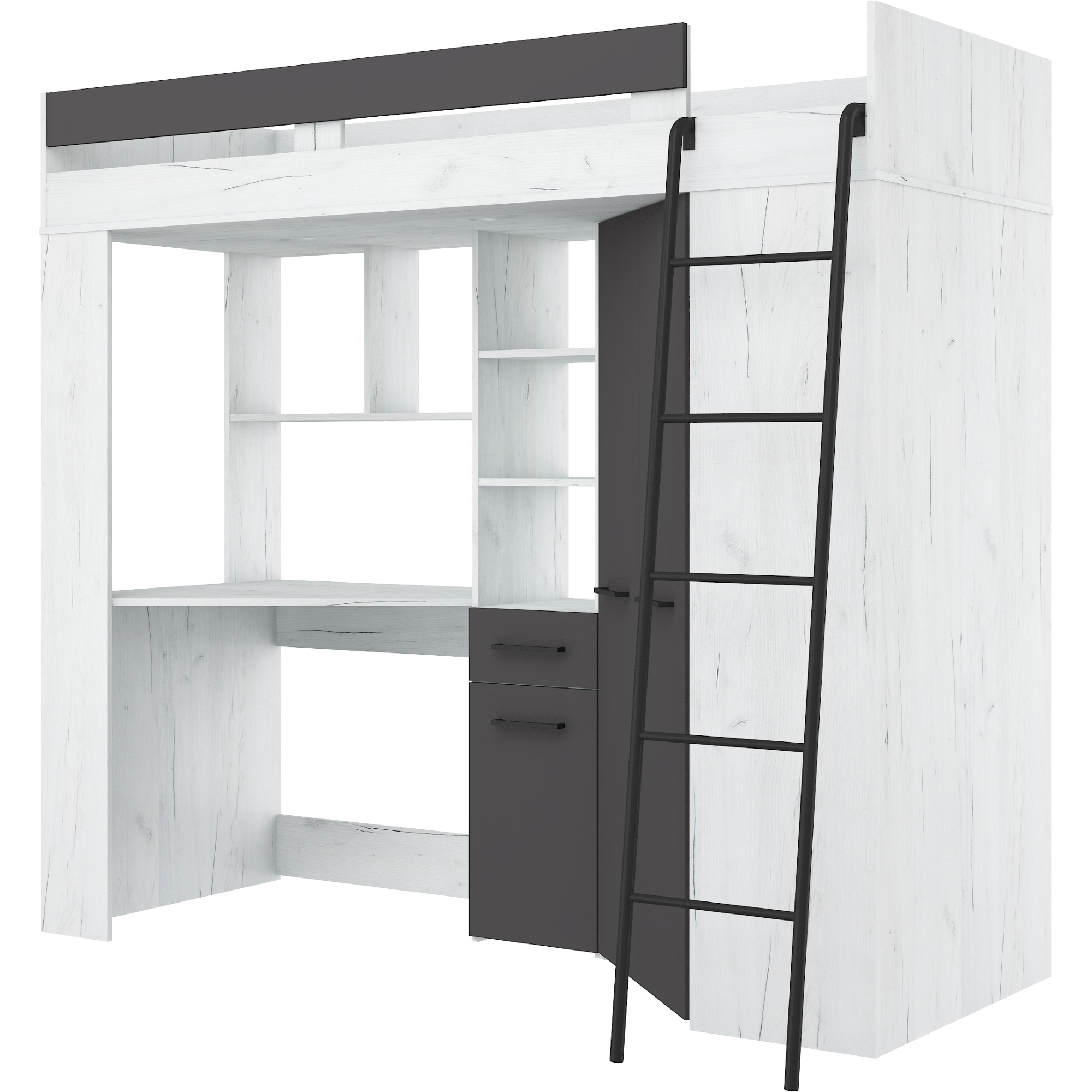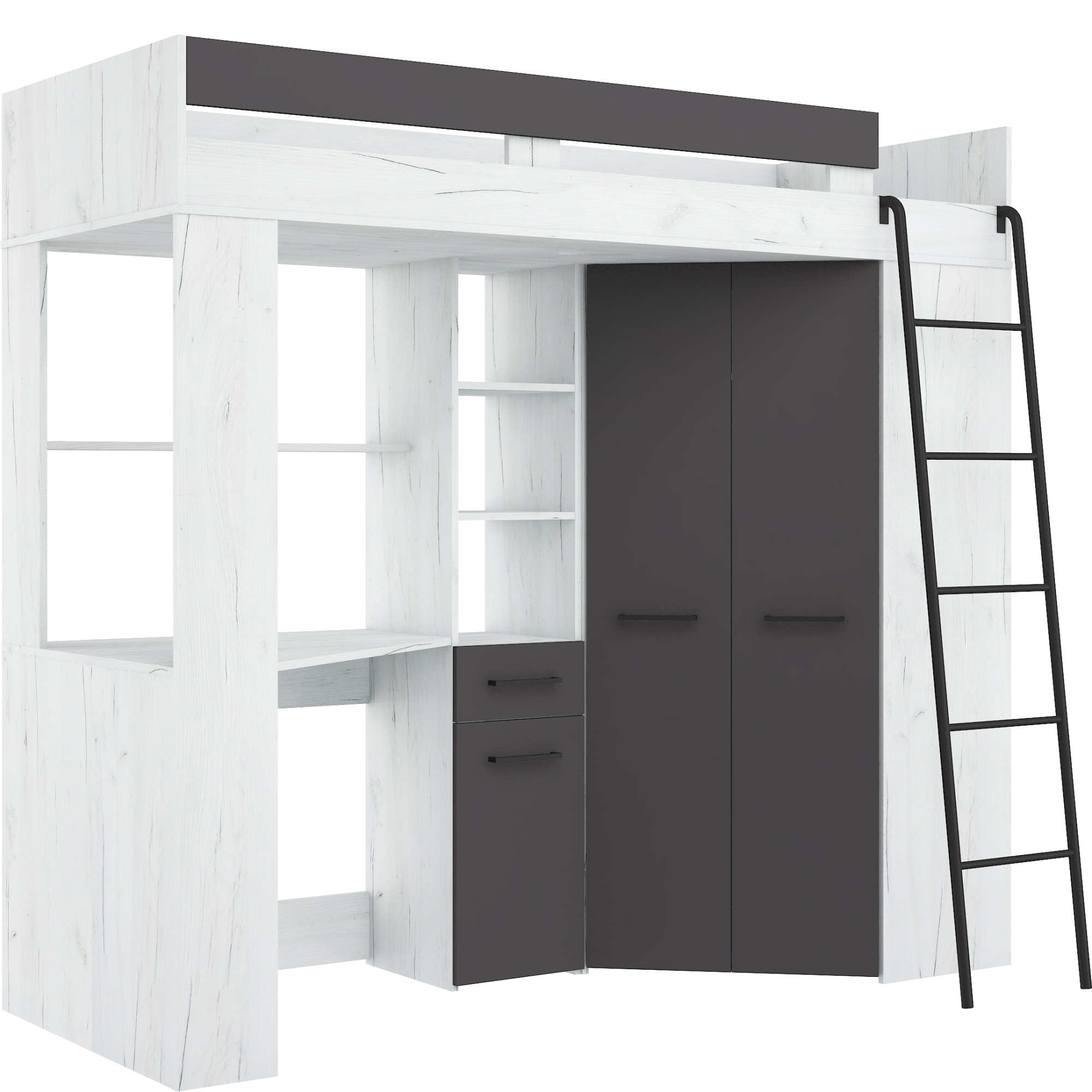 Łóżko piętrowe FLOOR P z biurkiem i szafą Craft Biały / Grafit Podstawowe
