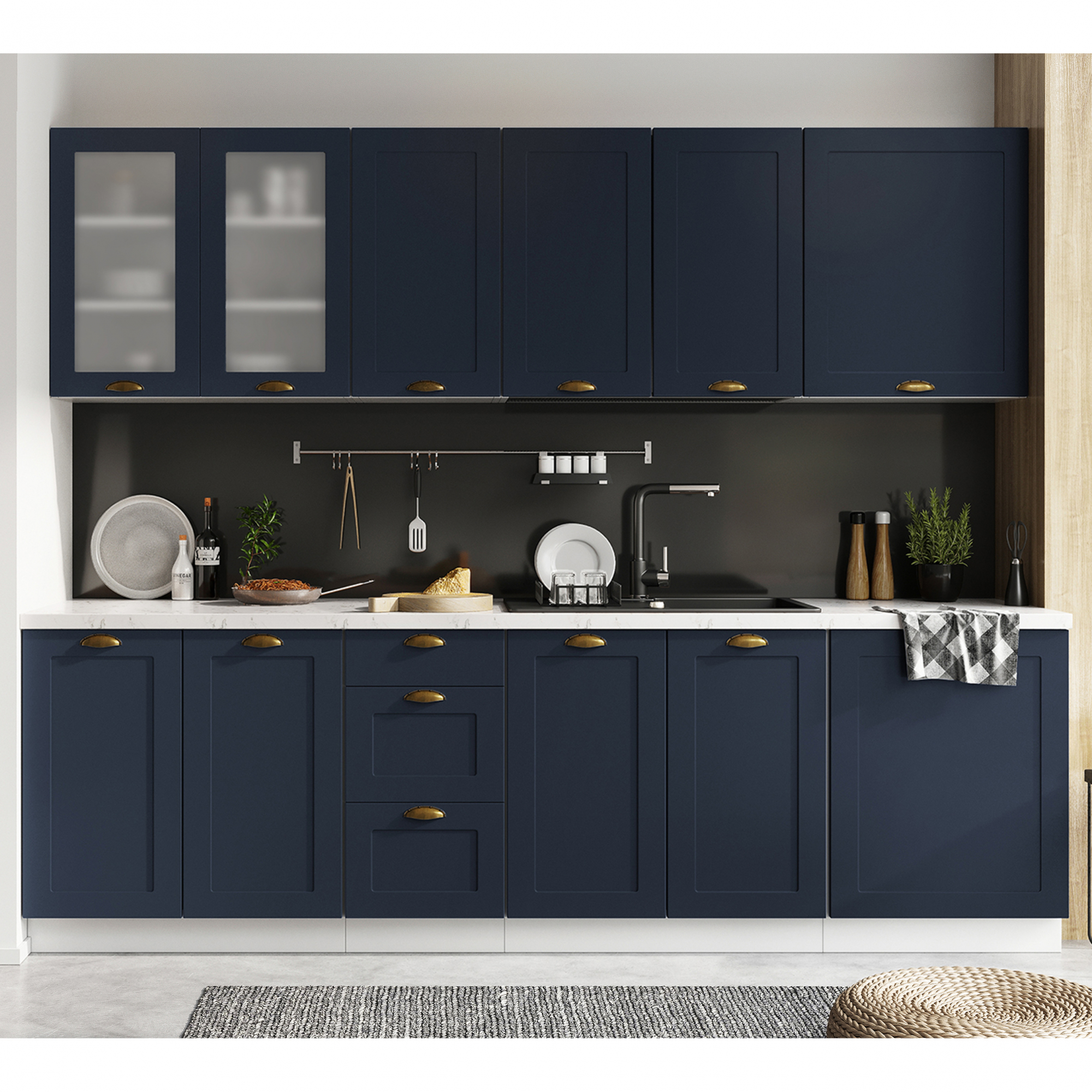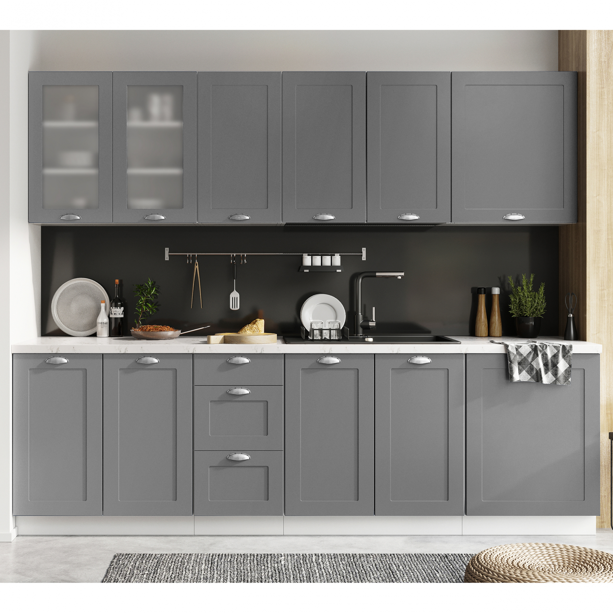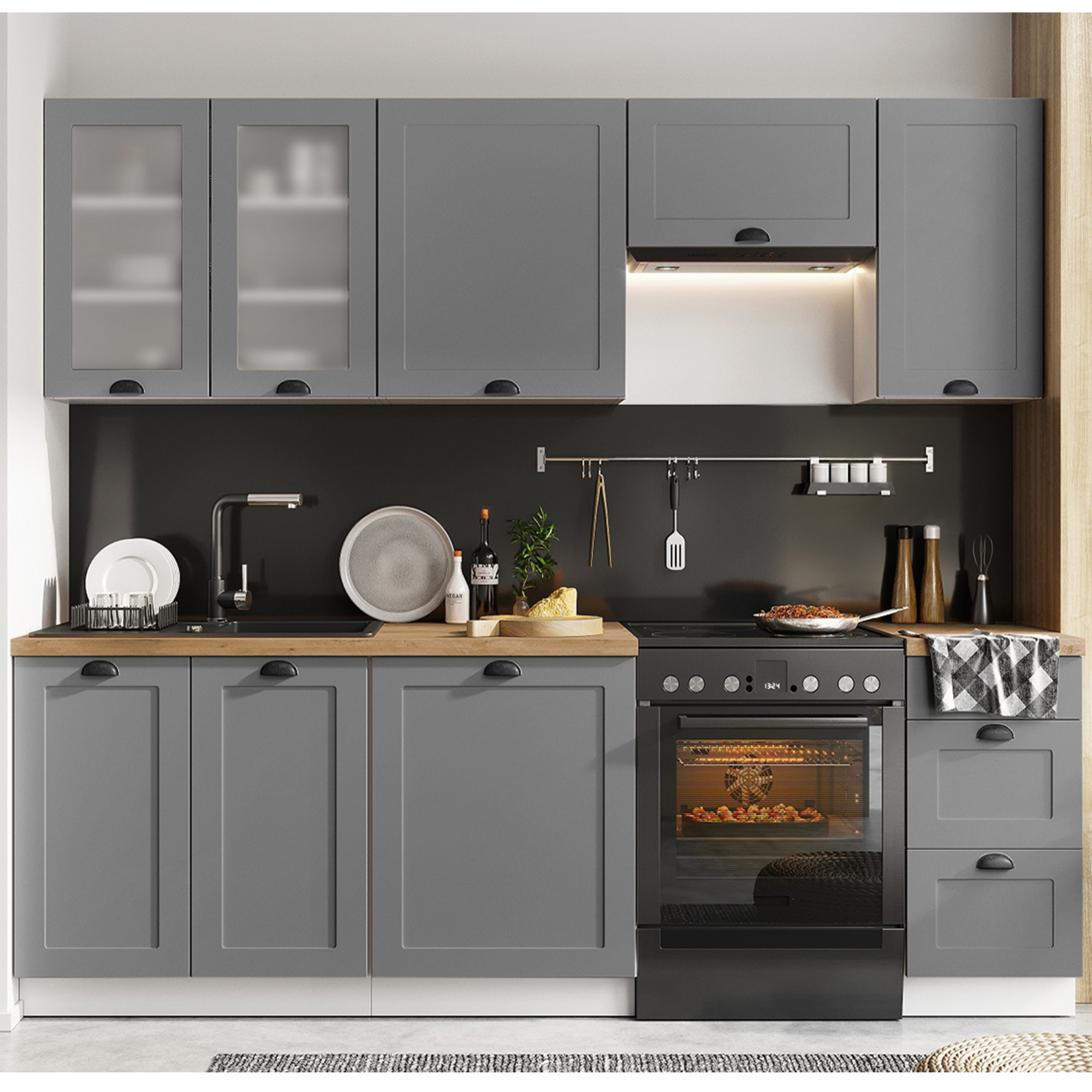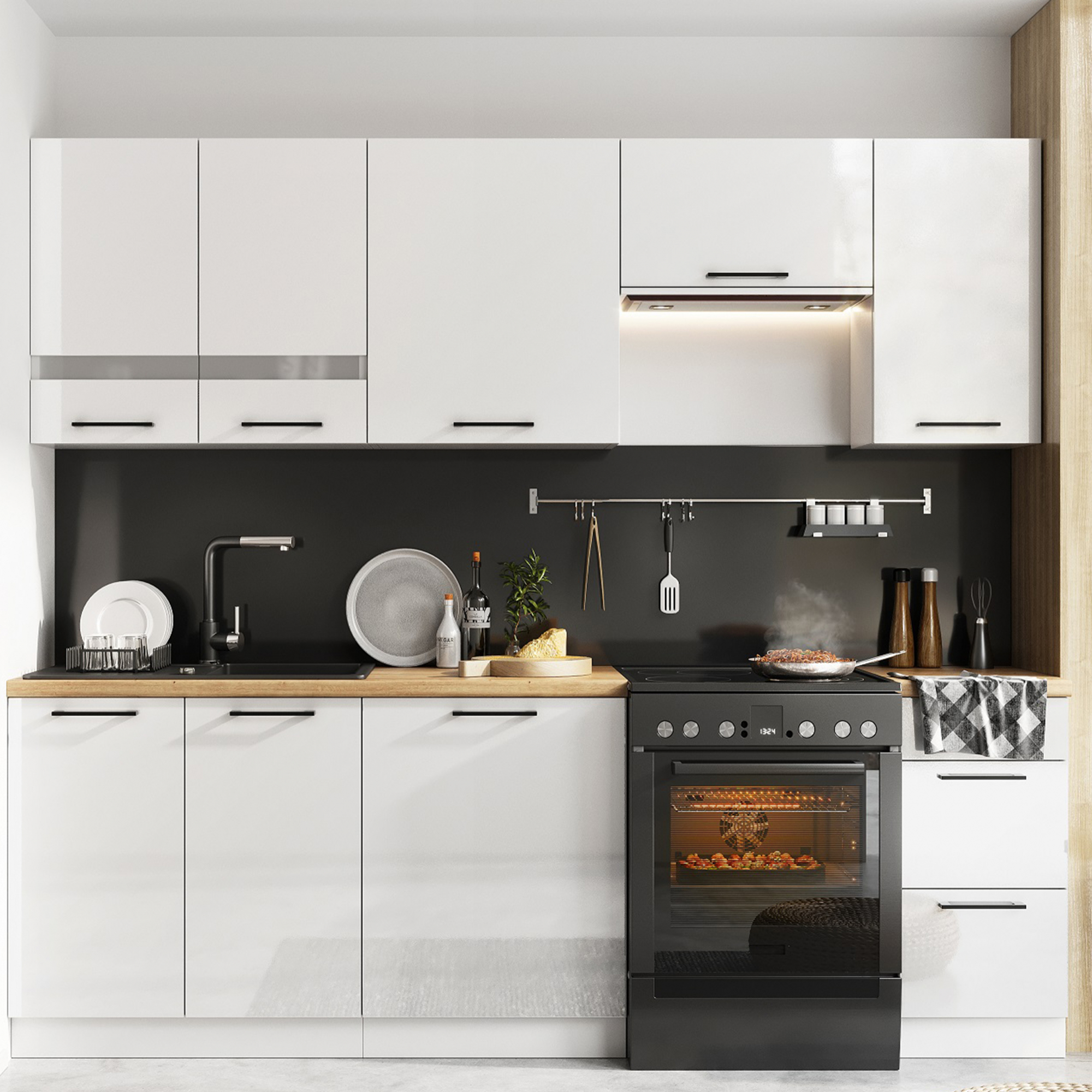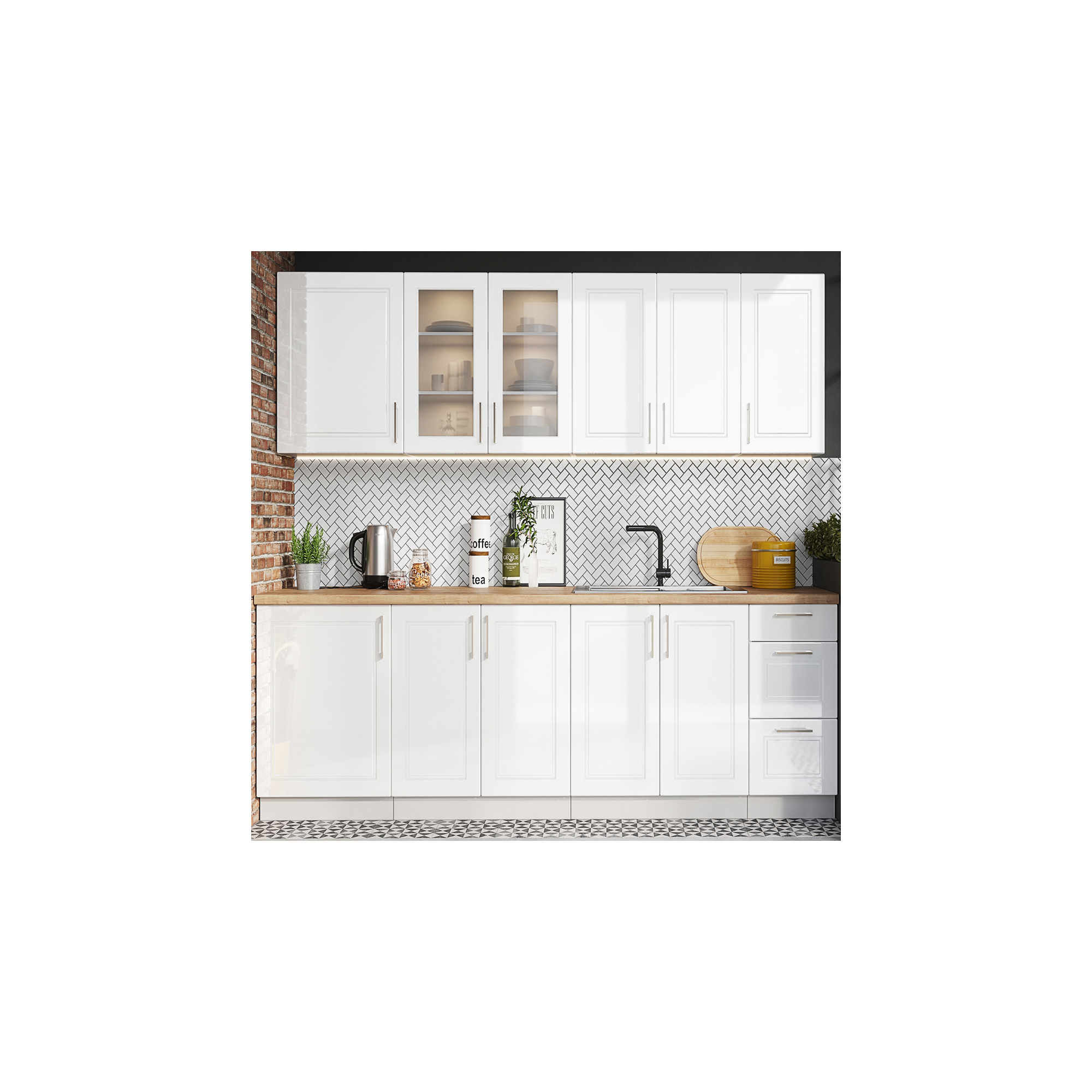 Wszystkie widoczne na zdjęciach akcesoria np.: sprzęt AGD, panele przyścienne, okapy, pochłaniacze, artykuły dekoracyjne NIE wchodzą w skład zestawu.
